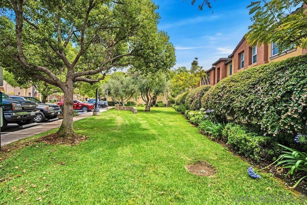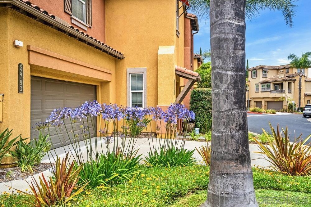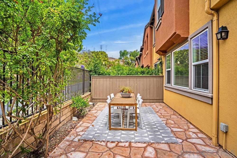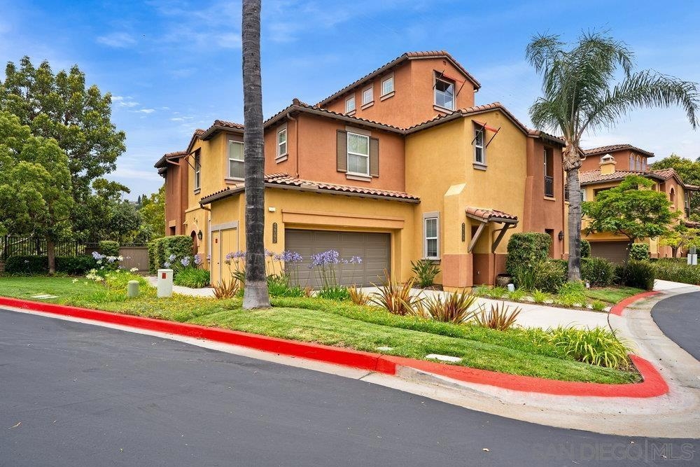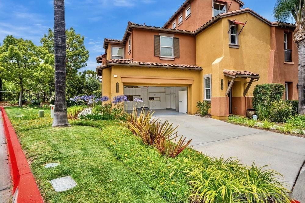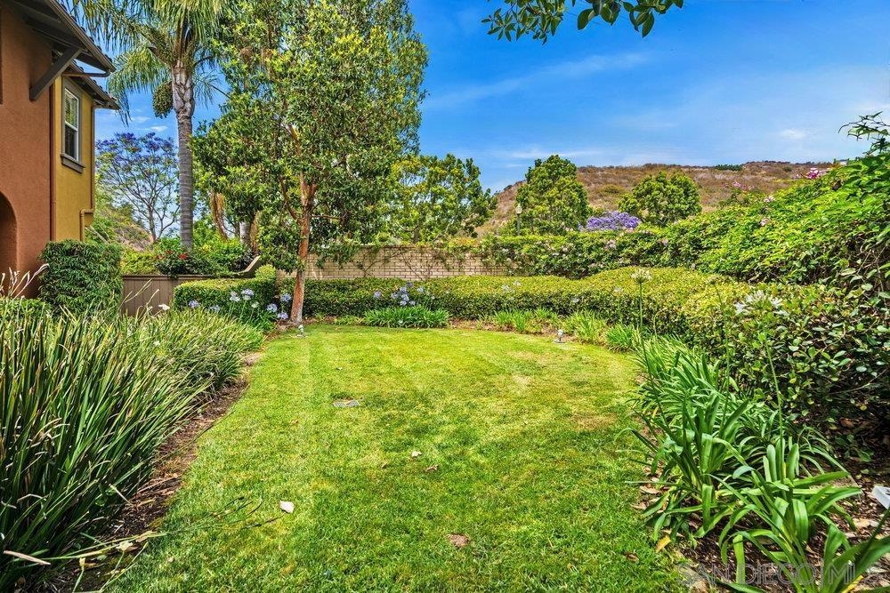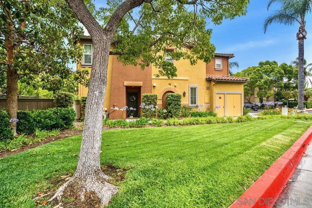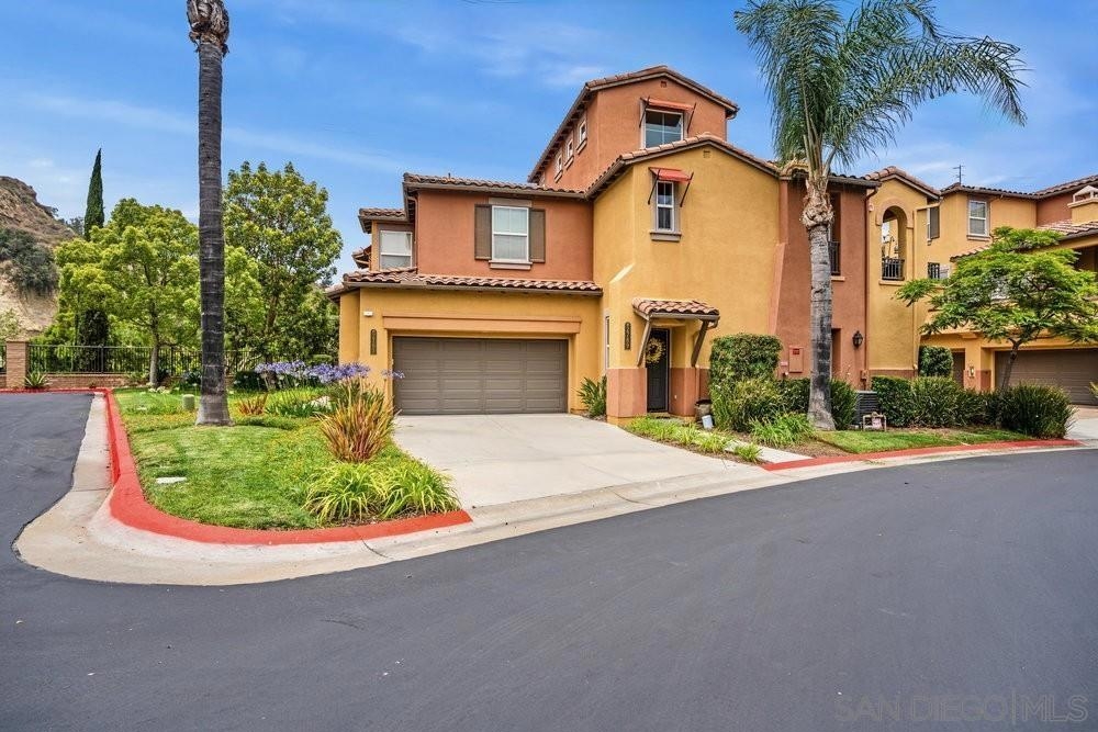 ONE OF THE BEST VALUES IN ESCALA! Welcome to Courtyards in Escala, an exclusive resort-style community where comfort, privacy, and amenities meet. This RARE corner-lot home is one of only two with a side yard and expansive back patio—perfect for outdoor entertaining. Tucked at the end of a cul-de-sac, it enjoys serene canyon and tree views with only one shared wall, mature landscaping, and the feel of a single-family home. Large west-facing windows fill the home with natural light and stunning sunsets. The attached two-car garage and extended driveway provide up to six dedicated parking spaces—an exceptional bonus. Upgrades include new kitchen appliances, new washer/dryer, updated cabinets, epoxy garage flooring, a water filtration system, backyard lighting, dimmable lights, and ceiling fans in every room. The primary suite offers a soaking tub and separate shower, plus a dedicated laundry room. The garage features built-in storage, tool racks, and mounted bike racks. Centrally located near two dog parks and the clubhouse with year-round heated pools, spa, fire pits, fitness center, BBQs, playground, and 24/7 security—plus tennis, pickleball, and basketball courts. Surrounded by nature trails, bike paths, and minutes to shopping, dining, entertainment, and the farmers market, this home delivers the ultimate San Diego lifestyle.