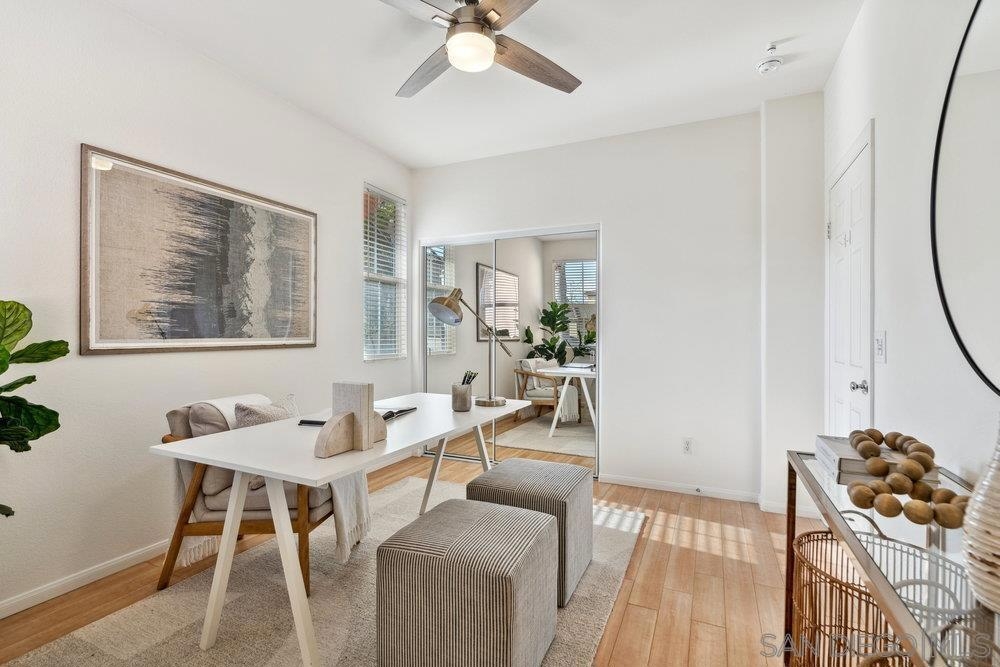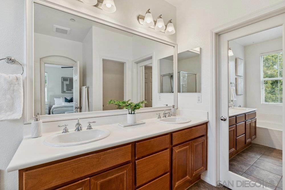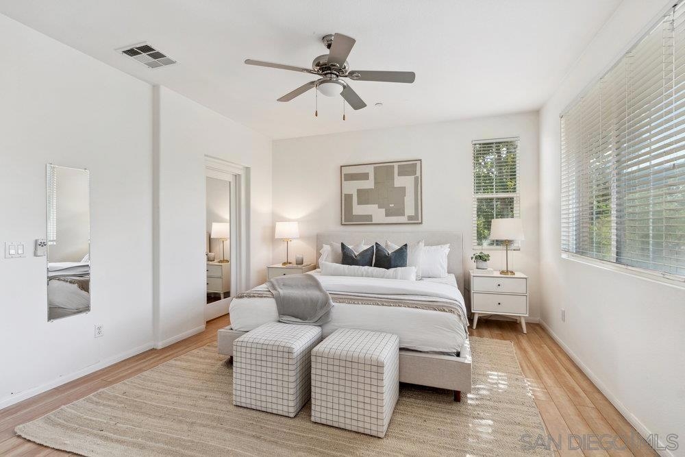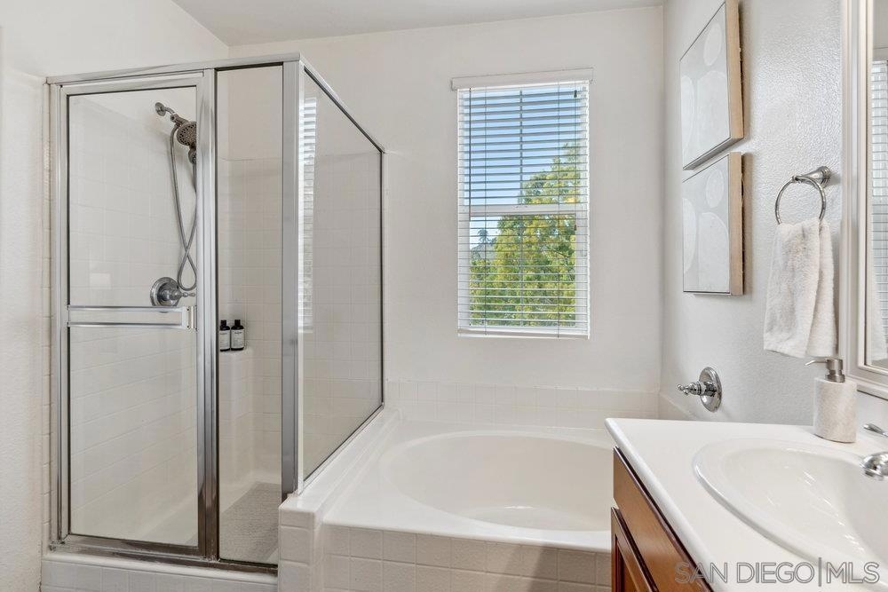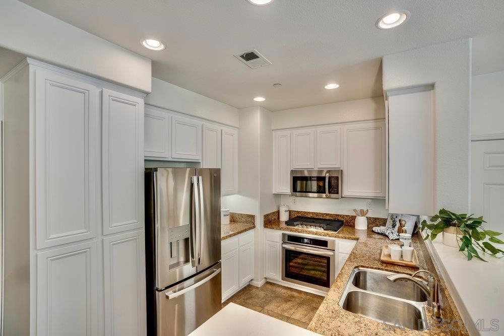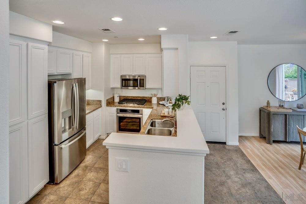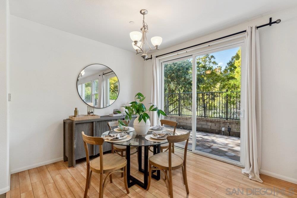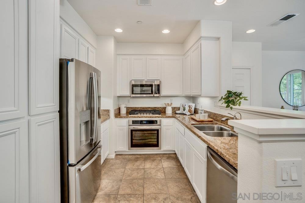 ONE OF THE BEST VALUES IN ESCALA! Welcome to Courtyards in Escala, an exclusive resort-style community where comfort, privacy, and amenities meet. This RARE corner-lot home is one of only two with a side yard and expansive back patio—perfect for outdoor entertaining. Tucked at the end of a cul-de-sac, it enjoys serene canyon and tree views with only one shared wall, mature landscaping, and the feel of a single-family home. Large west-facing windows fill the home with natural light and stunning sunsets. The attached two-car garage and extended driveway provide up to six dedicated parking spaces—an exceptional bonus. Upgrades include new kitchen appliances, new washer/dryer, updated cabinets, epoxy garage flooring, a water filtration system, backyard lighting, dimmable lights, and ceiling fans in every room. The primary suite offers a soaking tub and separate shower, plus a dedicated laundry room. The garage features built-in storage, tool racks, and mounted bike racks. Centrally located near two dog parks and the clubhouse with year-round heated pools, spa, fire pits, fitness center, BBQs, playground, and 24/7 security—plus tennis, pickleball, and basketball courts. Surrounded by nature trails, bike paths, and minutes to shopping, dining, entertainment, and the farmers market, this home delivers the ultimate San Diego lifestyle.