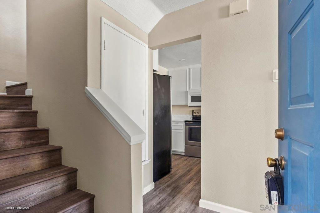 Upper townhome in Creekwood at River Run! You'll love the granite kitchen with stack laundry, slight eastern city/mountain views, and cozy fireplace. It also offers a master walk-in closet, new LVP flooring, covered patio and upstairs balcony. Central location near new SDSU stadium & Mission Valley campus! Walk to shopping, Ikea, and dining! One covered parking spot #554 + common parking. Complex Features: ,, Equipment: Range/Oven Sewer: Sewer Connected Topography: LL