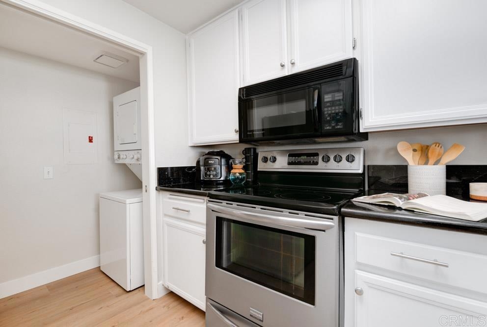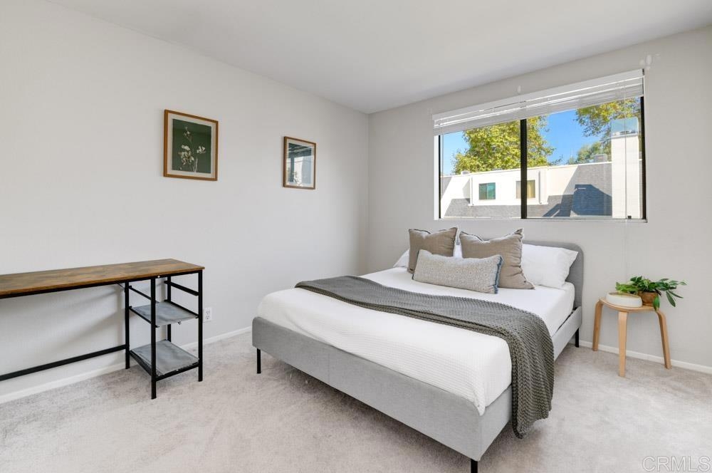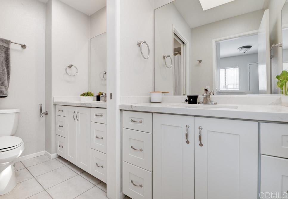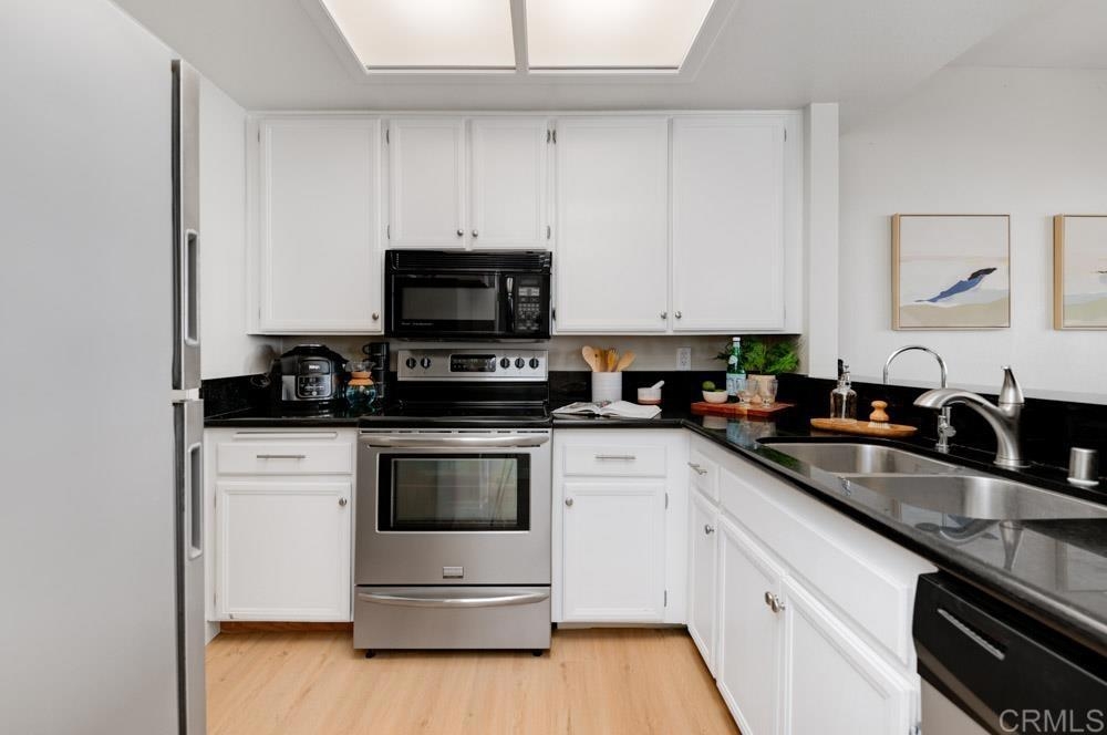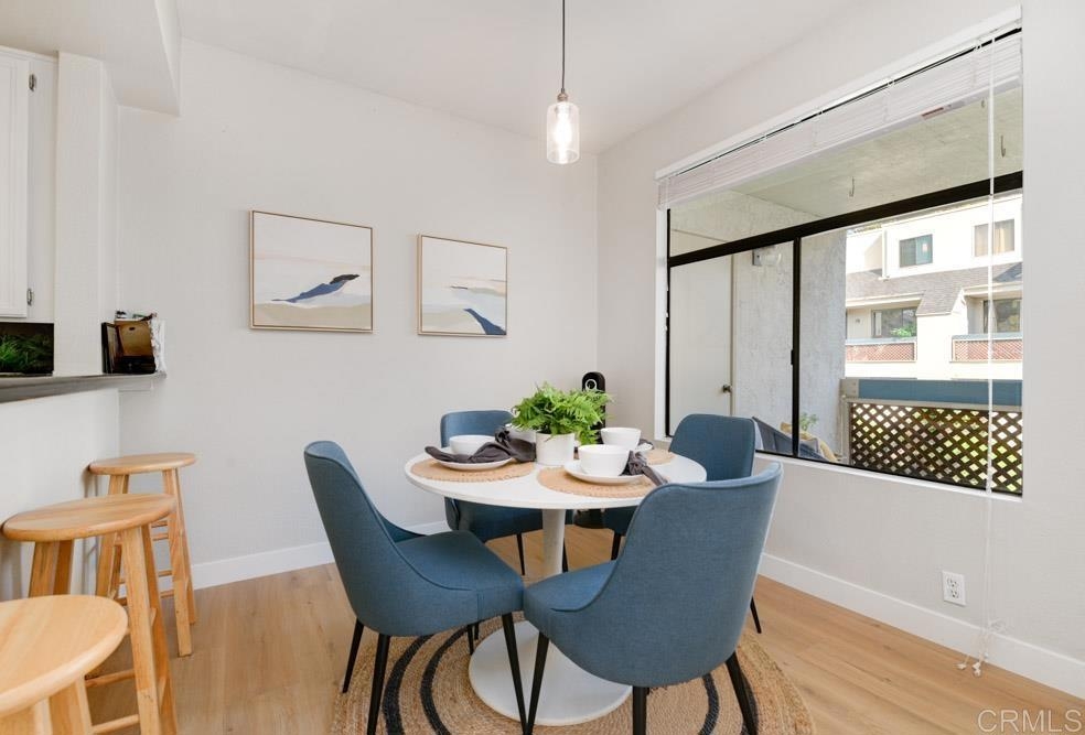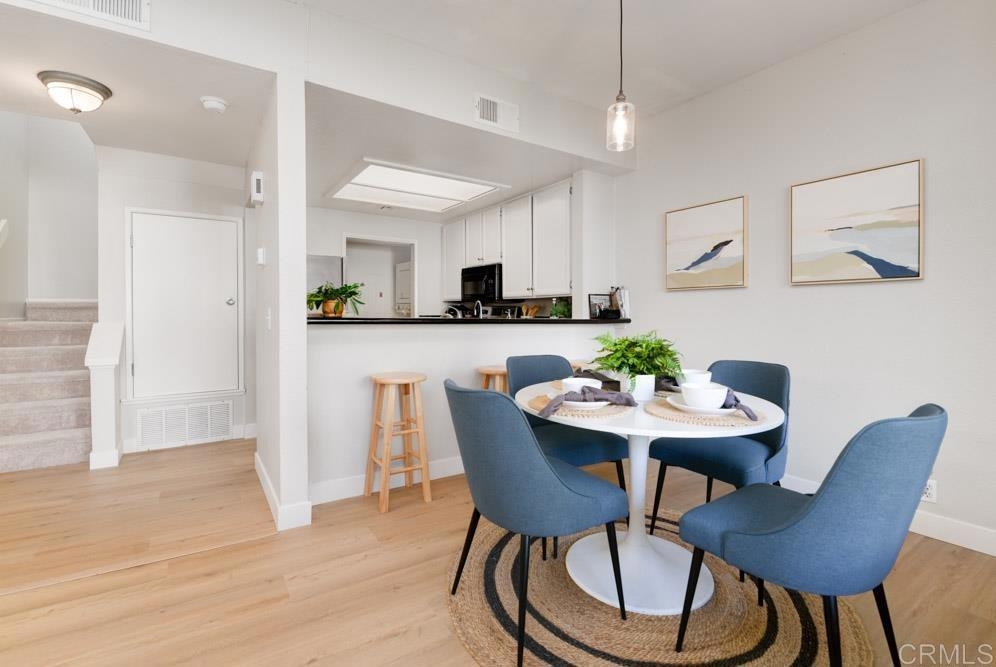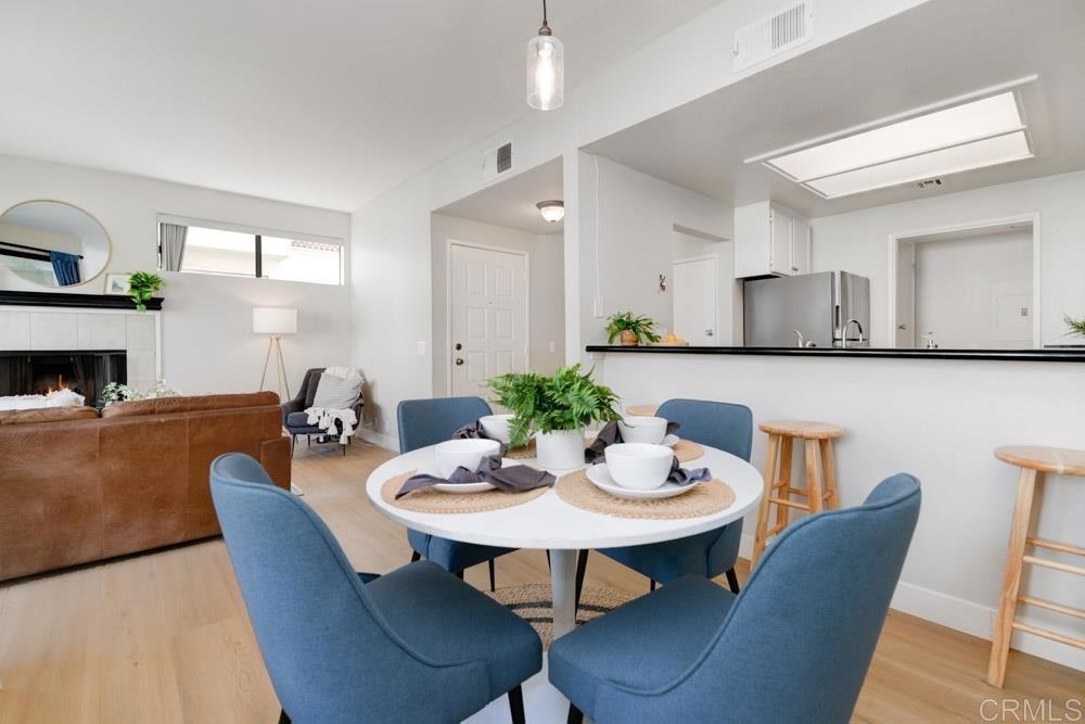 Beautifully updated VA-approved two-story townhouse-style condo in Mission Valley's Creekwood community. This home offers a bright and airy ambiance, serene views of the pond and waterfall, and is positioned in one of the most desirable locations within the complex. The lower level features brand-new luxury vinyl oak flooring throughout, an open layout with a well-appointed kitchen, spacious living and dining areas, a balcony, and a convenient in-unit washer and dryer. Upstairs, discover two bedrooms, including a primary suite with a walk-in closet, alongside an updated bathroom featuring double sinks and another private balcony. Abundant natural light streams through numerous windows and skylights. Highlights include stainless steel appliances, dedicated laundry facilities, and two parking spaces (one covered, one uncovered) with ample guest parking. The beautifully landscaped grounds feature resort-like amenities such as a pool, spa, and fitness center. Centrally located in San Diego, this home offers unparalleled convenience near Snapdragon Stadium, Costco, Ikea, Starbucks, dining options, libraries, trolley access, and premier shopping at Mission Valley and Fashion Valley Mall, all within a five-minute drive.