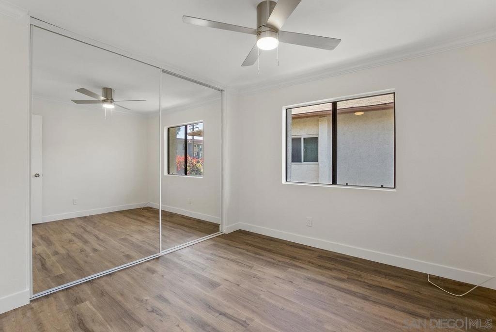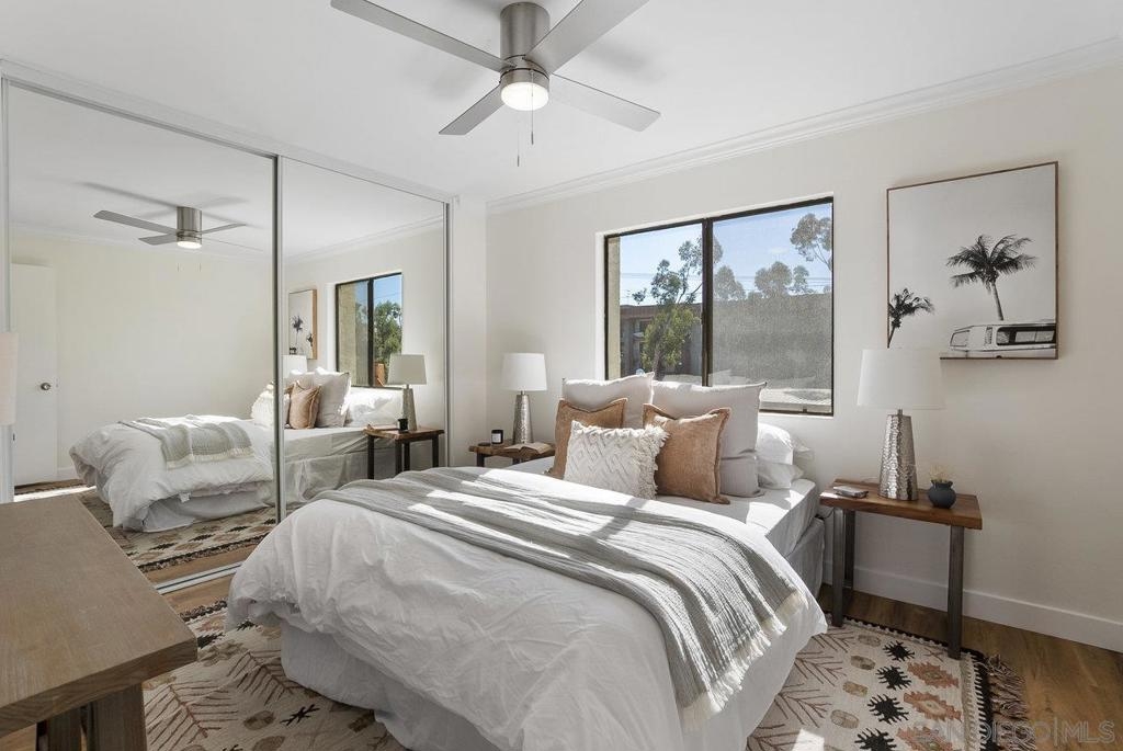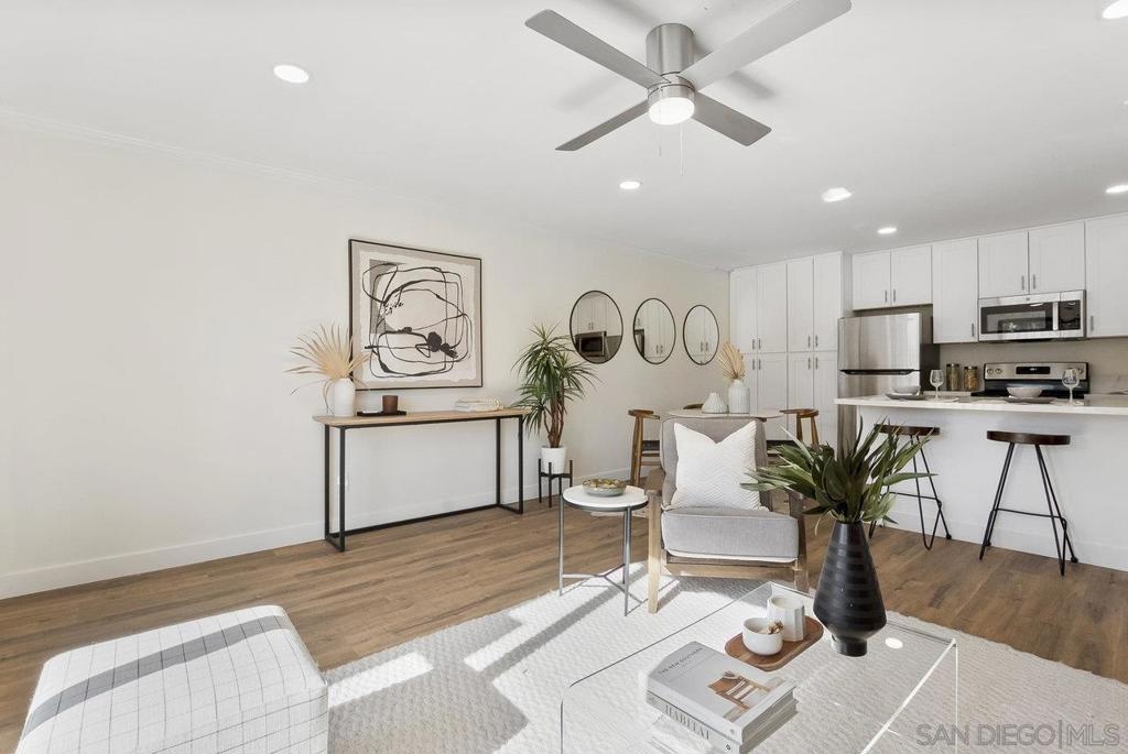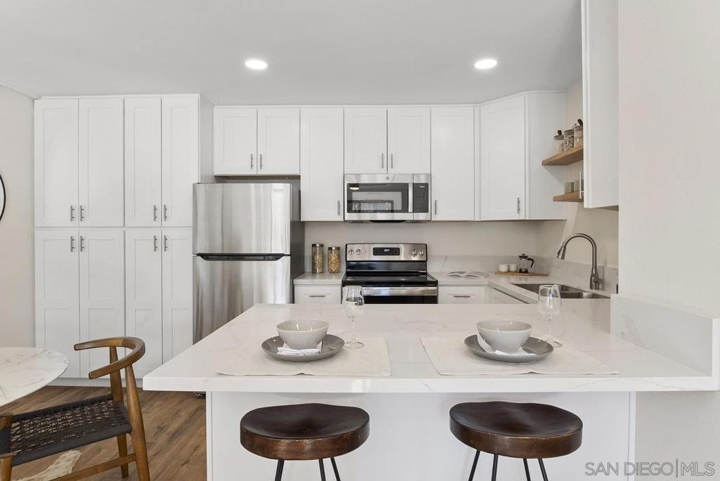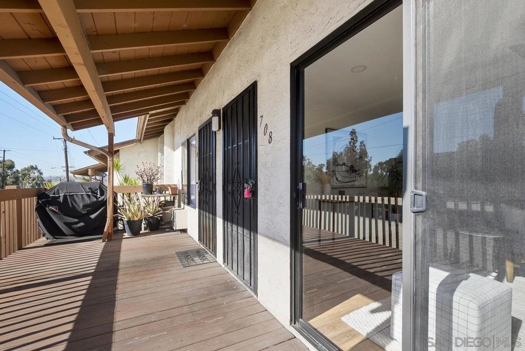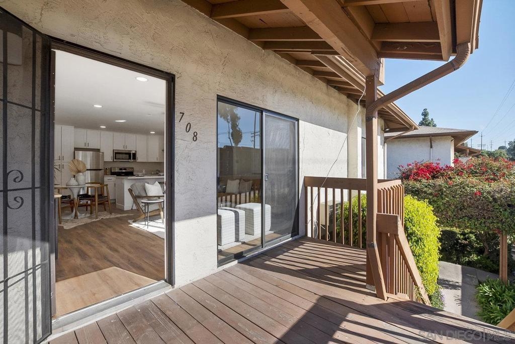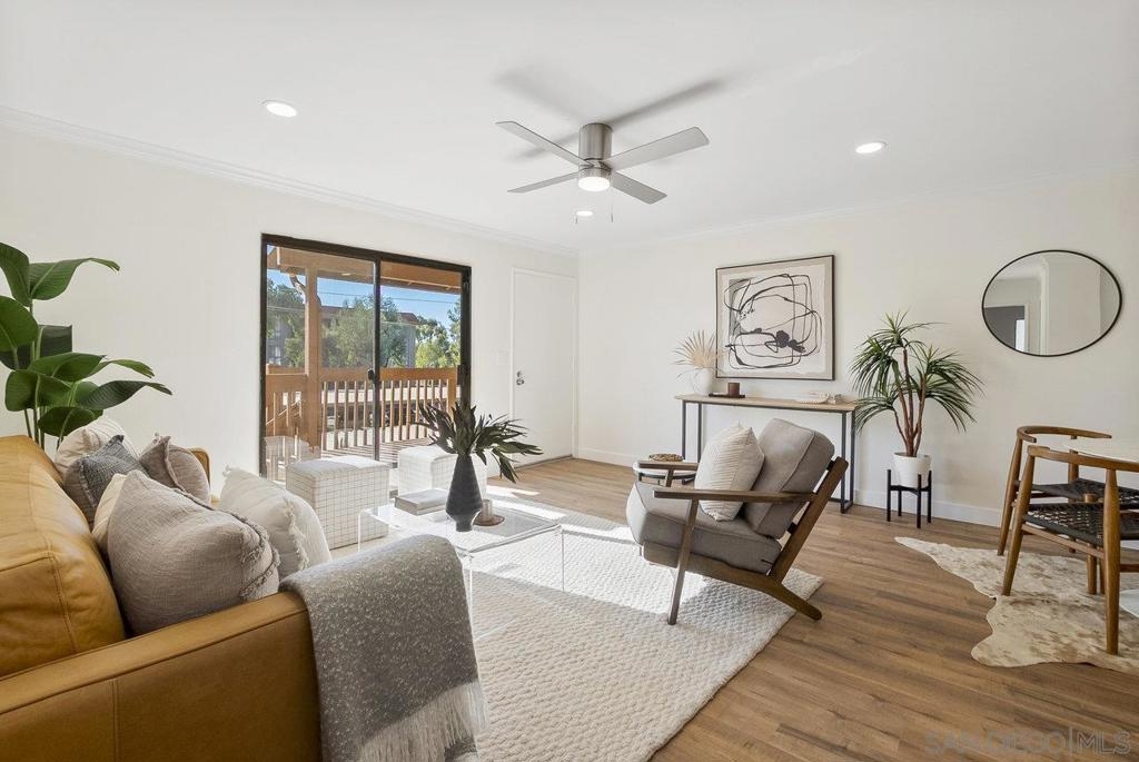 Value Range $500,000-$530,000. WOW, WELCOME HOME to a beautifully upper, remodeled 2-bedroom 1-bath unit! This home has NEW luxury vinyl plank flooring and 4 inch baseboards throughout, NEW self-closing shaker kitchen cabinets, NEW STAINLEE STEEL APPLIANCES including stove, refrigerator, dishwasher and disposal, NEW kitchen quartz countertops and breakfast bar, NEW ceiling fans in the living room and both bedrooms, NEW mirrored closet doors, NEW bathroom lighting and vanity. WHEW and that's not all this condo has to offer. See supplement for additional information. It has recessed lighting in the living room, a sliding door to the front deck, lots of natural light PLUS, an AC unit in the living room. It has one assigned covered parking spot and one unassign parking with a permit. The complex features a pool, spa and clubhouse and LOW HOA FEES. The location is close to everything Mission Valley has to offer including great shopping, fabulous restaurants, movie theaters, parks and hiking trails, freeway access, Snapdragon Stadium, schools, SDSU and so much more!