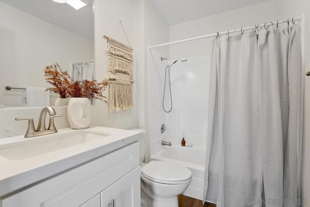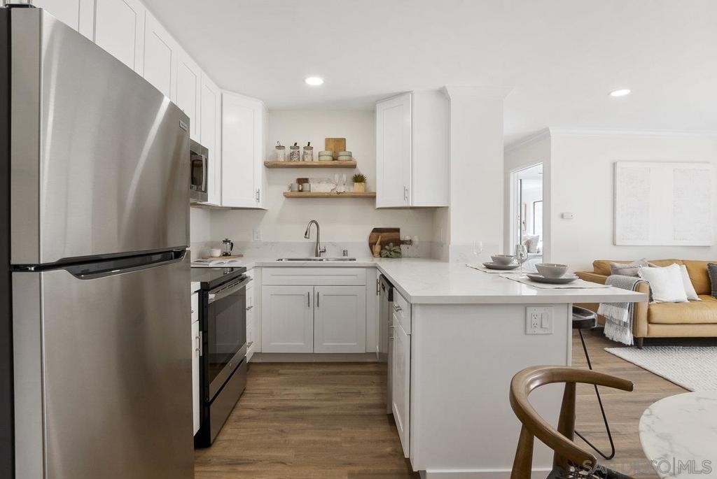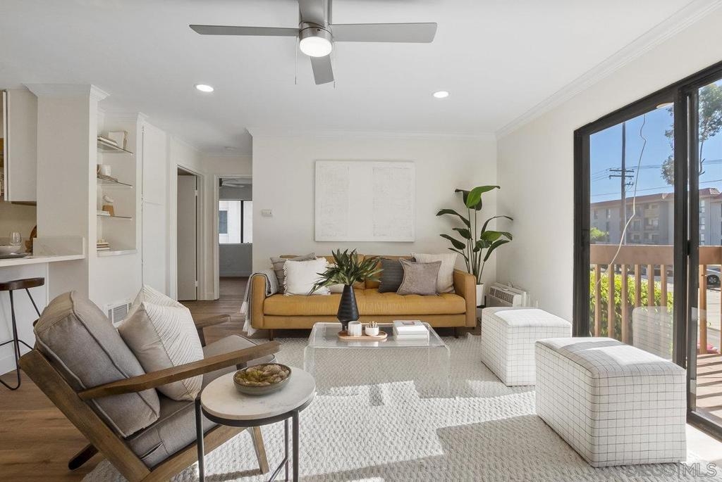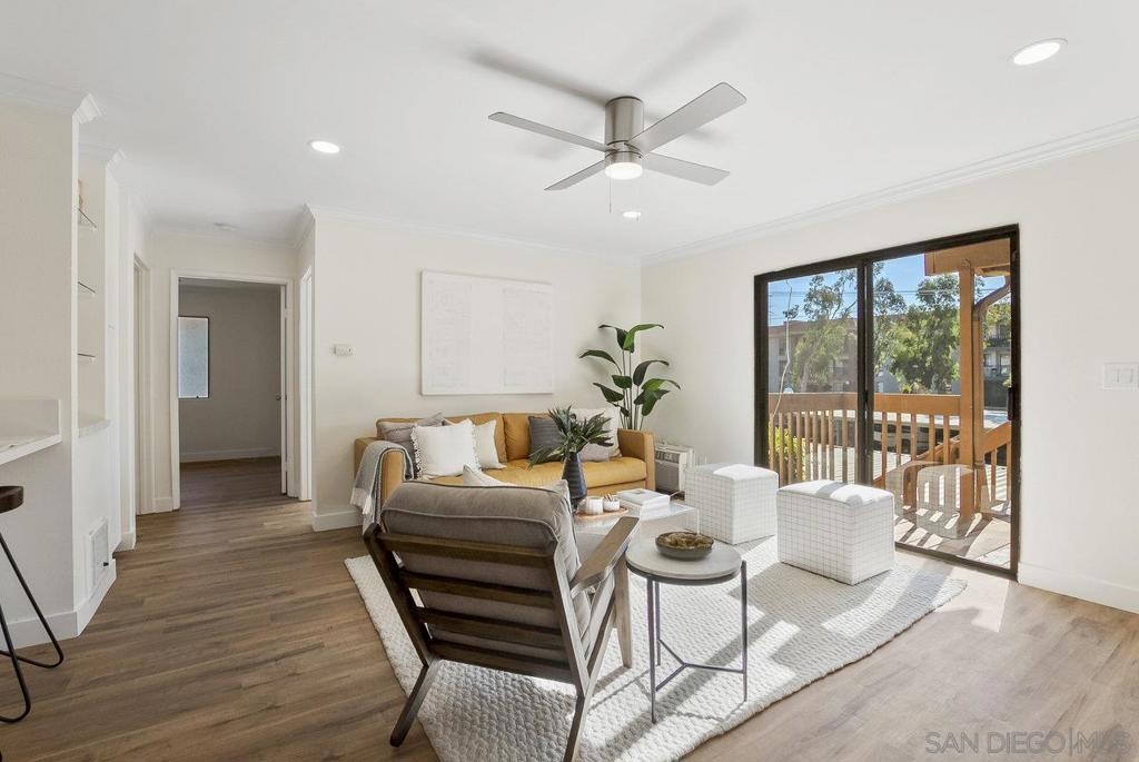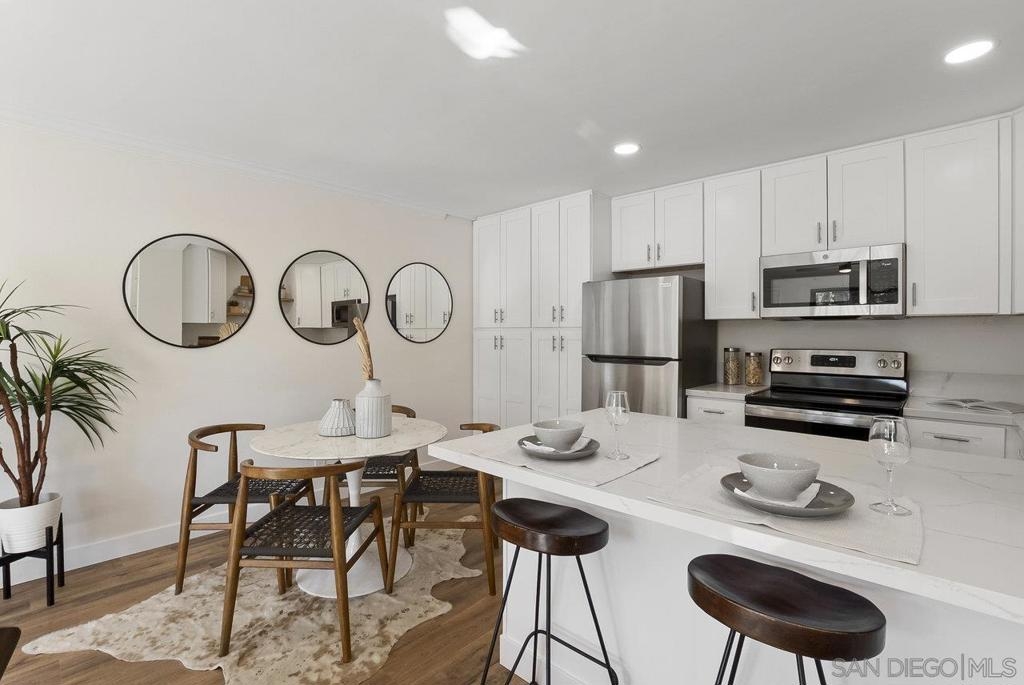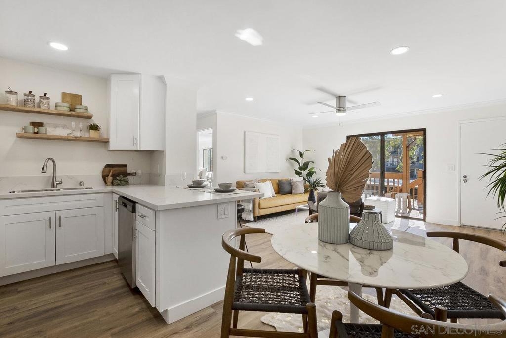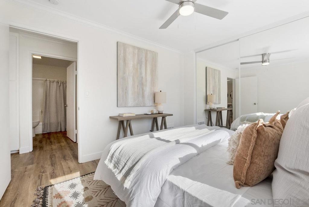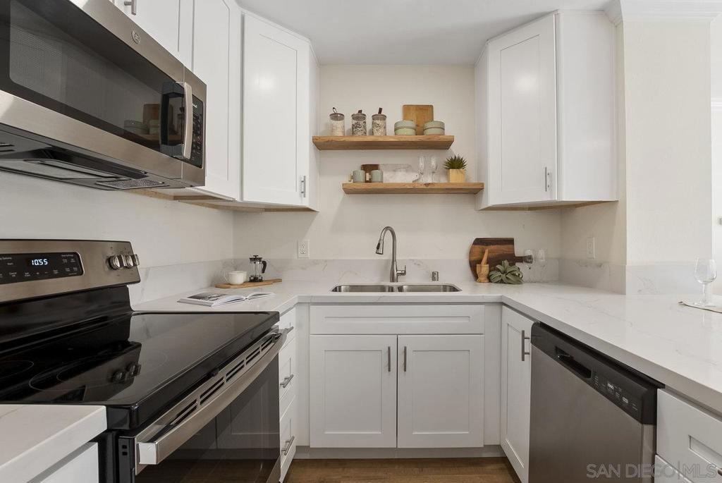 Value Range $500,000-$530,000. WOW, WELCOME HOME to a beautifully upper, remodeled 2-bedroom 1-bath unit! This home has NEW luxury vinyl plank flooring and 4 inch baseboards throughout, NEW self-closing shaker kitchen cabinets, NEW STAINLEE STEEL APPLIANCES including stove, refrigerator, dishwasher and disposal, NEW kitchen quartz countertops and breakfast bar, NEW ceiling fans in the living room and both bedrooms, NEW mirrored closet doors, NEW bathroom lighting and vanity. WHEW and that's not all this condo has to offer. See supplement for additional information. It has recessed lighting in the living room, a sliding door to the front deck, lots of natural light PLUS, an AC unit in the living room. It has one assigned covered parking spot and one unassign parking with a permit. The complex features a pool, spa and clubhouse and LOW HOA FEES. The location is close to everything Mission Valley has to offer including great shopping, fabulous restaurants, movie theaters, parks and hiking trails, freeway access, Snapdragon Stadium, schools, SDSU and so much more!