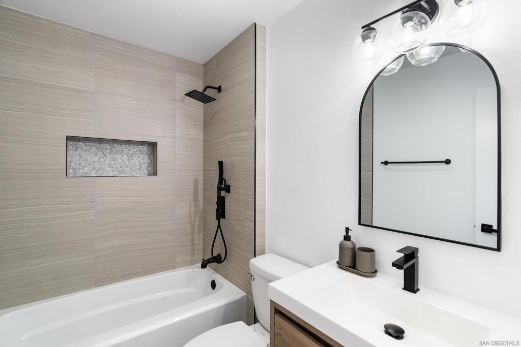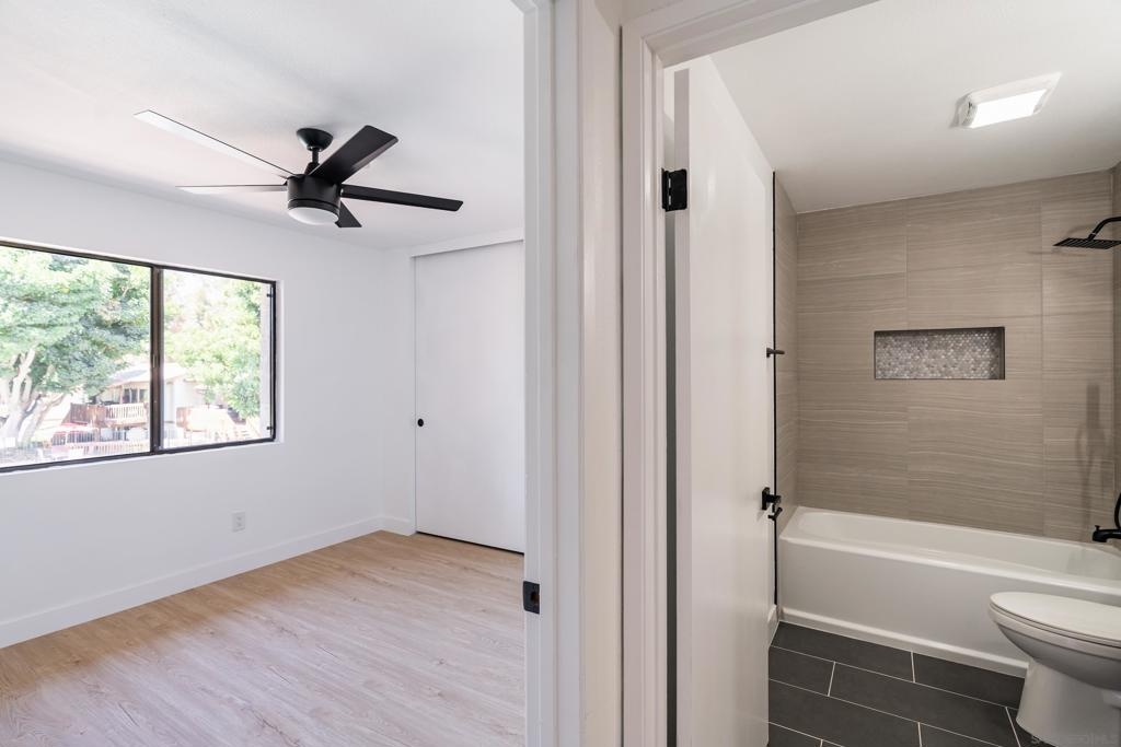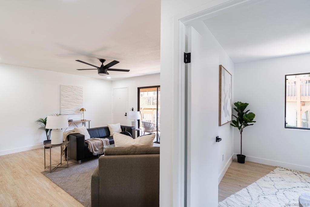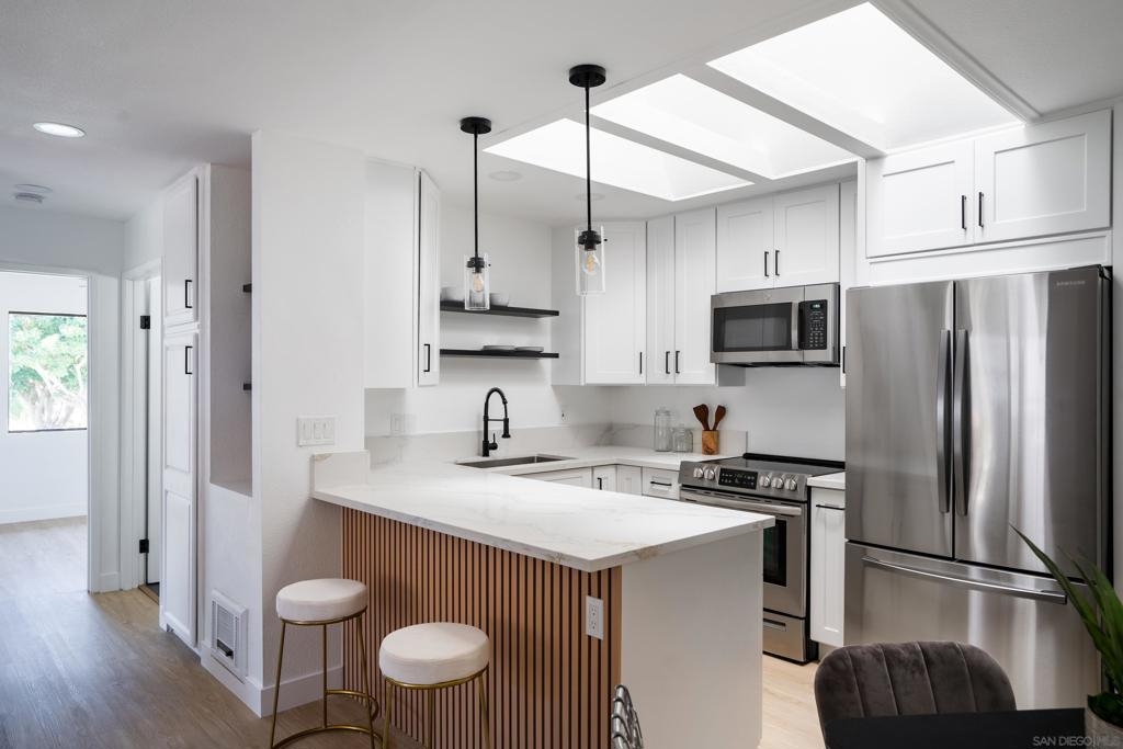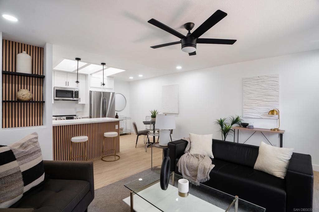 Completely remodeled 2 bedroom 1 bath top floor end unit in the heart of Mission Valley w/ no unit below. The unit features a dual skylight in the kitchen bringing in a ton of natural light, ss appliances, in wall A/C, recessed lighting, ceiling fans in each room, a balcony and much more! VA Approved! Low HOA. Comes w/ an assigned parking spot as well as an additional permit pass for permit spots. Complex has a pool, hot tub, bbq area, clubhouse and laundry facilities on site all very close to unit.