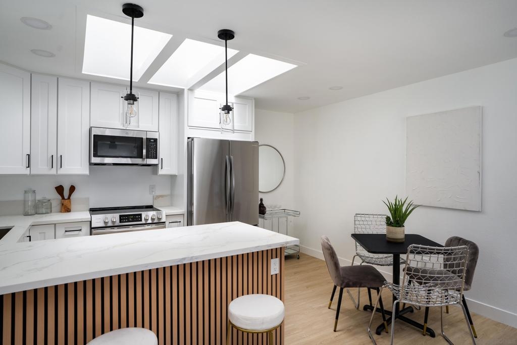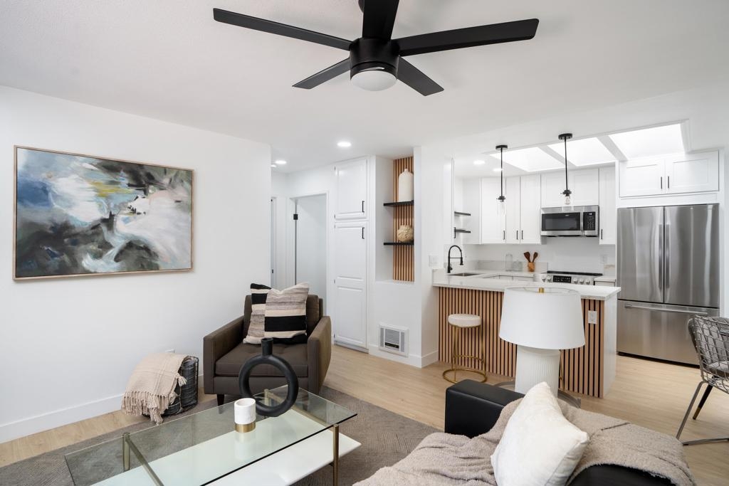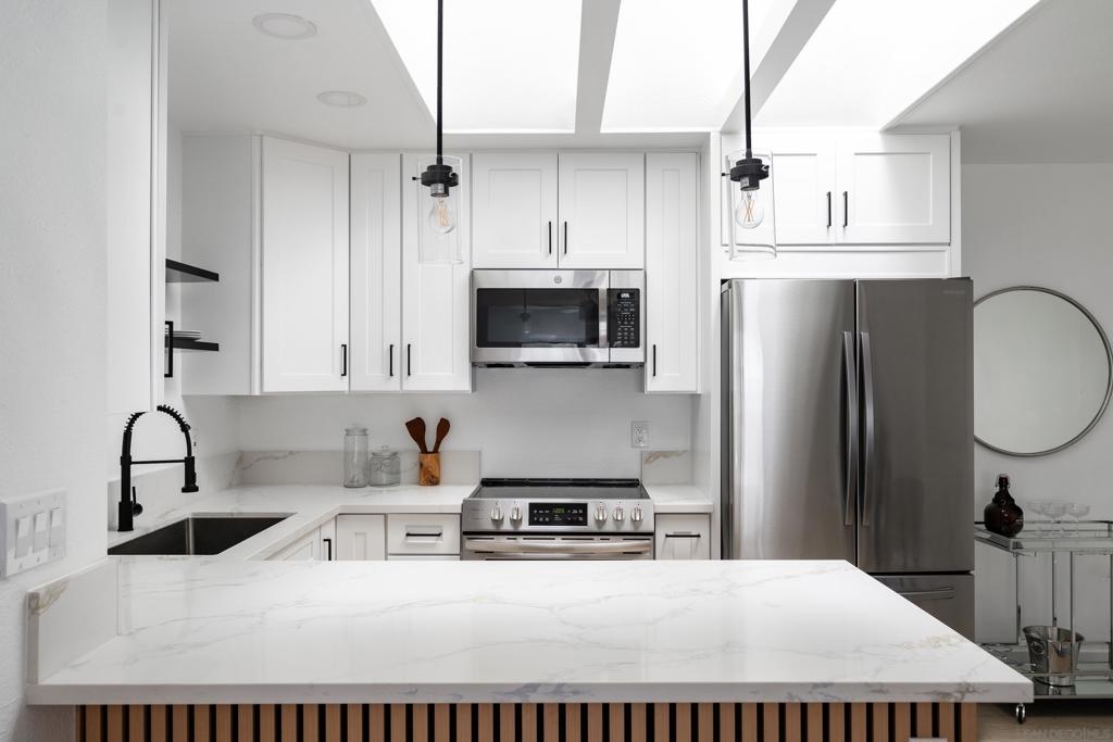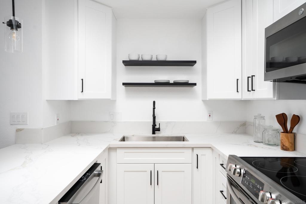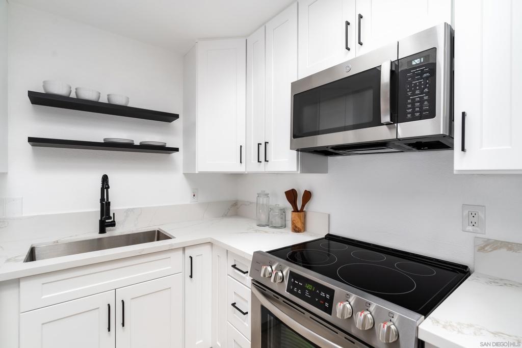 Completely remodeled 2 bedroom 1 bath top floor end unit in the heart of Mission Valley w/ no unit below. The unit features a dual skylight in the kitchen bringing in a ton of natural light, ss appliances, in wall A/C, recessed lighting, ceiling fans in each room, a balcony and much more! VA Approved! Low HOA. Comes w/ an assigned parking spot as well as an additional permit pass for permit spots. Complex has a pool, hot tub, bbq area, clubhouse and laundry facilities on site all very close to unit.