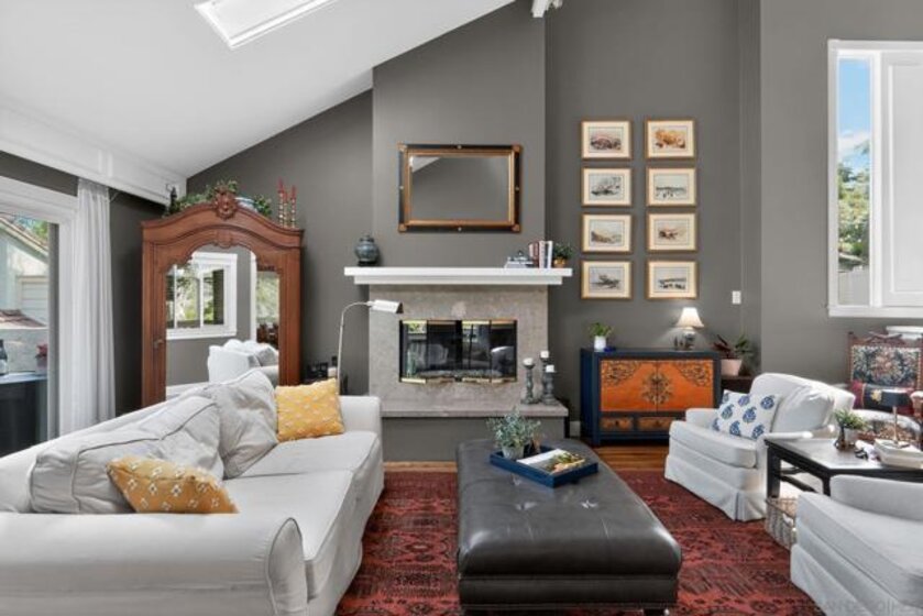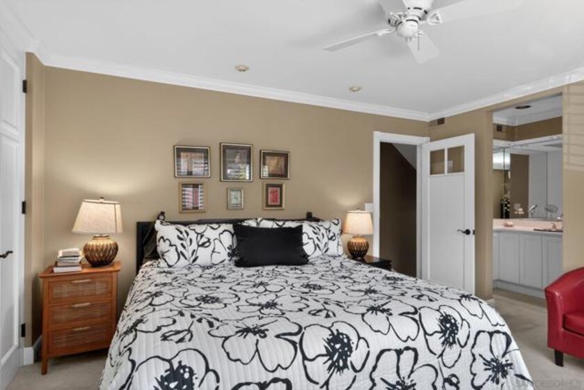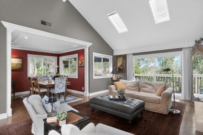 Kensington Park Villas! The best location at the corner of Escena and Pintoresco this detached home (one of the four detached in the complex) is situated near the walking path and the multiple ponds in the heart of the community. Upon entering it is clear to see that this unit is full of extraordinary details. Hardwood floors throughout most of the unit, striking moulding and trim embellishments give this home a custom feel. Lower level has two bedrooms and one full bath. Access to a private patio is off one of these bedrooms. Middle level is the extraordinary living room with vaulted ceiling, skylights and a classic fireplace. Remodeled kitchen, separate dining room and access to the patio through sliding doors taking in the peaceful view. Quiet!! Top level (all short staircases) is the primary bedroom (additional mini split in this room) with ensuite bath and a family room also with another bath. This is easily converted to a fourth bedroom. Complex has two pools, walking paths, club house, an access gate into Kensington proper and is a gated community!