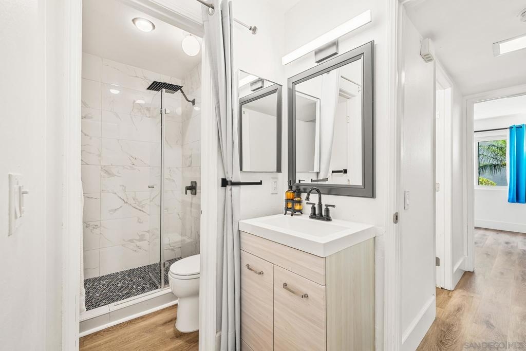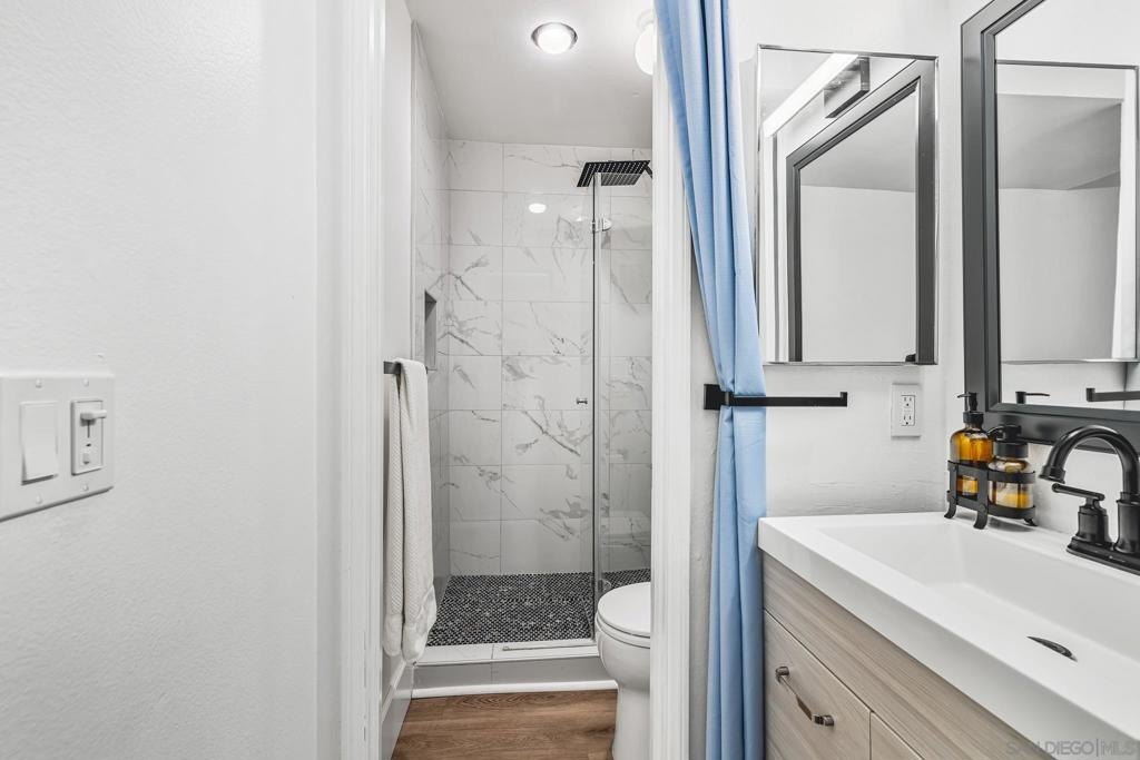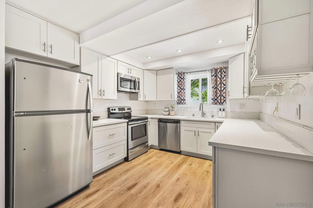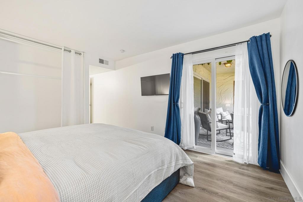 RESORT-LIKE living in this beautifully updated 2 bed, 2 bath condo in lush Mission Plaza! Lounge on your spacious, private patio and take in the well-maintained grounds, or take a dip in one of the THREE pools in this peaceful complex. Inside, you'll find newer flooring throughout and a perfectly-maintained interior, with quartz countertops for a clean look in the kitchen and luxe, modern fixtures in the bathrooms. Don't worry about a thing before moving in! Laundry and parking are only steps away for ultimate ease, and all of the fabulous amenities are just a stroll away - gym/sauna, tennis and pickleball courts and jacuzzis! Clubhouse and barbecue areas for entertaining to savor these long summer days. Easy access to freeways, trolley and all of what Mission Valley has to offer - you're in the heart of it all! DON'T WAIT on this one!