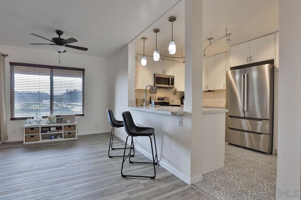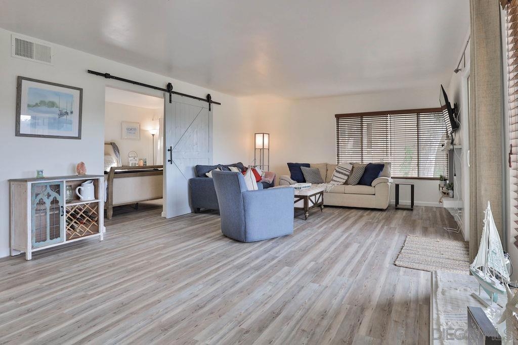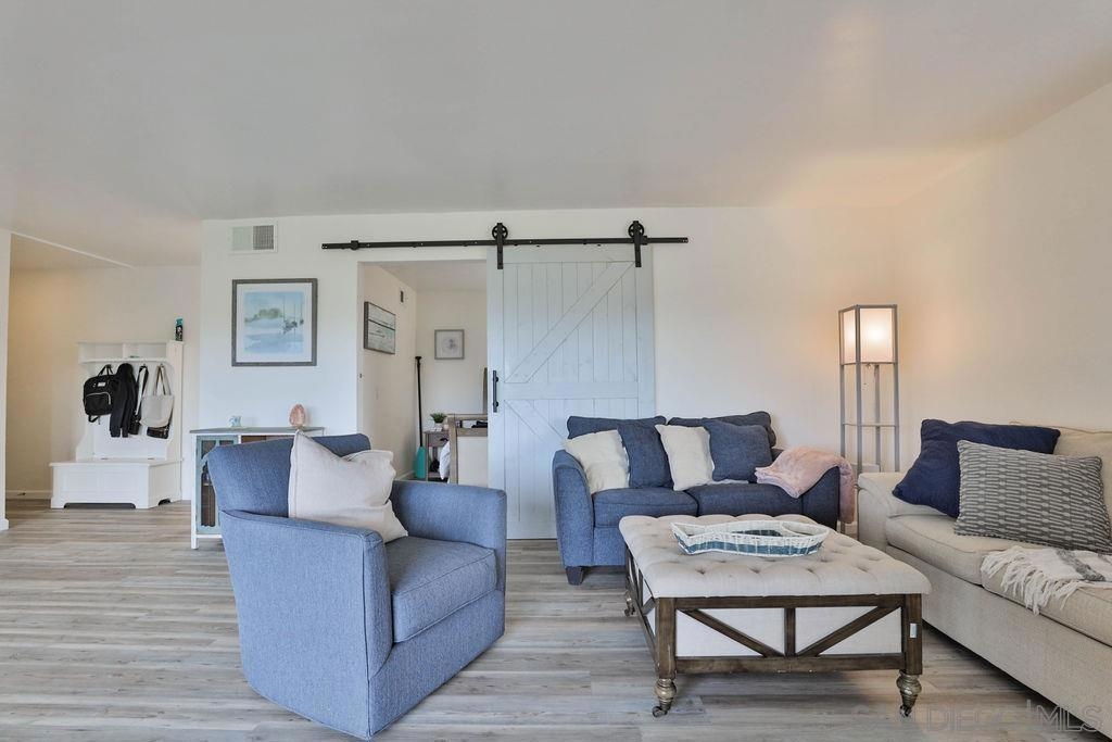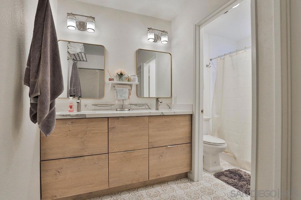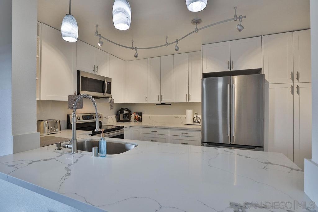 LOCATION LOCATION - Stunning & Stylish Corner Unit nestled privately in Mission Valley with beautiful sunset views! Located near all major San Diego hot spots. Great complex location, condo #168 is on the first floor – an end unit with easy access by elevator or stairs. The open floor plan feels spacious with natural soft lighting giving a cozy feel. Living area has a spectacular private view of highway 8 /15 interchange & the new stadium with grounds surrounded by grand eucalyptus trees. Completely renovated & fully upgraded, ceiling to floor, 6 months ago with NEW stainless-steel appliances, Belmont 1300 quality kitchen cabinets with 2 Lazy-Susan turntables, stunning Alaska quartz countertops, imported floor tiles from Spain, Mexico, and Turkey. USB electrical outlets & dimmers & 3 installed flat screen TV's! Gorgeous blue gray toned faux wood waterproof vinyl plank flooring & fresh paint throughout. Popcorn ceiling was safely removed. A bar area with a new wine fridge & plenty of storage for your everyday items. Master suite includes double sink vanity, versatile walk-in closet, and additional closet with vertical cloth blinds. Trendy barn door encloses second bedroom just off of the living area. Washer/dryer combo in unit; however, laundry room is conveniently located right next door. Low HOA’s include hot water, insurance, trash, water AND the community offers a lot of amenities; lap pool/jacuzzi, tennis, and racquetball courts, men’s & women’s saunas, Rec Room/Club house, a gym, and beautiful walking paths with overnight security patrolling the neighborhood. Complex Features: ,,,,,, Sewer: Public Sewer Topography: GSL