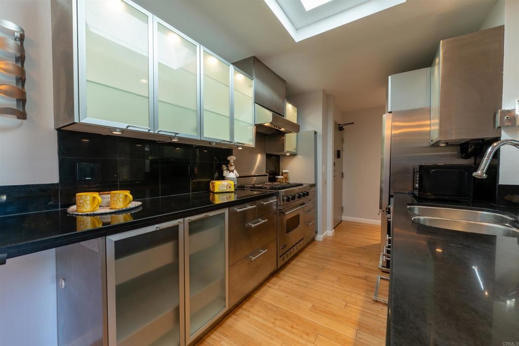 Top-floor contemporary condo in the heart of Mission Valley offering style, comfort, and valley views. The 1-bedroom, 1-bath residence spans approximately 700 square feet and features vaulted ceilings in both the living room and bedroom—an exclusive benefit of its premier top-floor location in a three-story building. Beautifully upgraded just a few years ago, the home showcases bamboo flooring throughout, a stunning custom-designed walk-in shower, and a remodeled kitchen complete with a Viking stove. Natural light fills the space through multiple skylights enhancing the open and airy feel. The living room centers around a cozy gas fireplace with smart home controls for lighting and fireplace operation, and opens to a private deck/balcony—perfect for enjoying Mission Valley views and evening city lights. Additional highlights include central heating and air conditioning, an EV charger at the assigned covered parking space. The building offers elevator access for added convenience. Residents enjoy resort-style amenities including a swimming pool, spa, tennis and pickleball courts, basketball court, fitness center, and a recreation room with two pool tables. Ideally situated in the Fashion Valley area with quick access to Interstate 5 and Interstate 8, the central location offers close proximity to shopping, dining, and everything San Diego has to offer. Experience elevated Mission Valley living in this thoughtfully upgraded, move-in ready home.