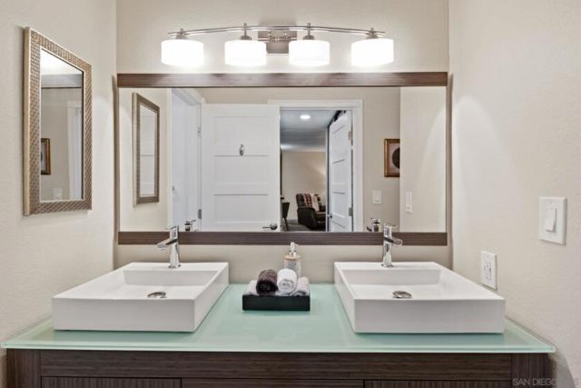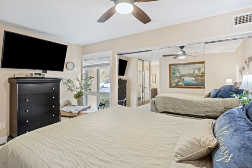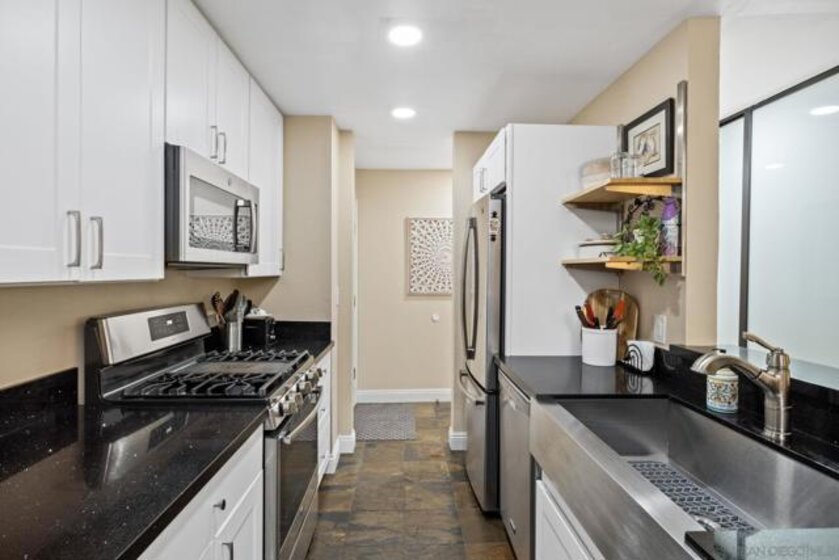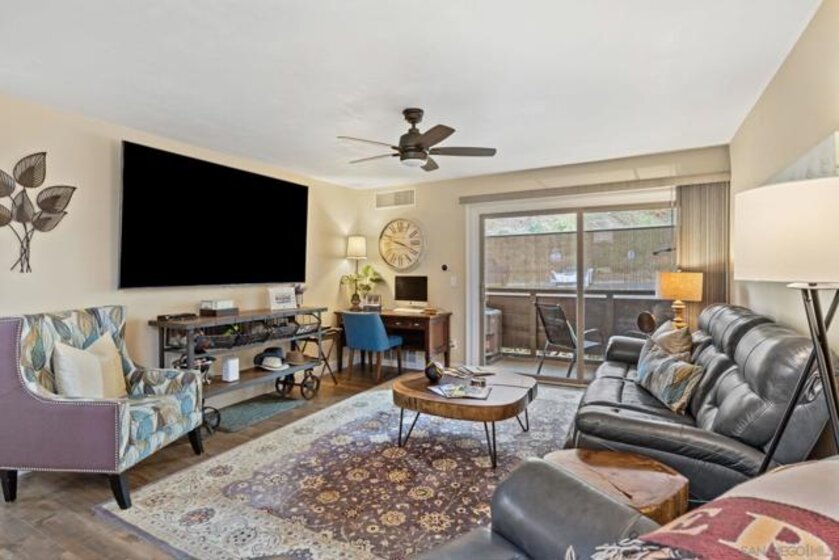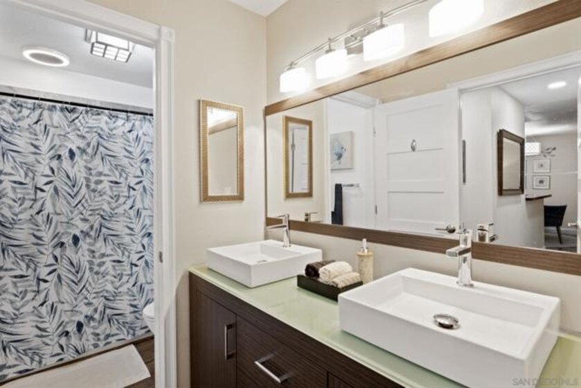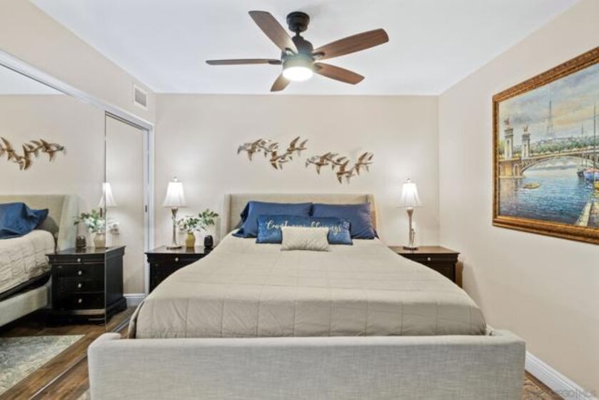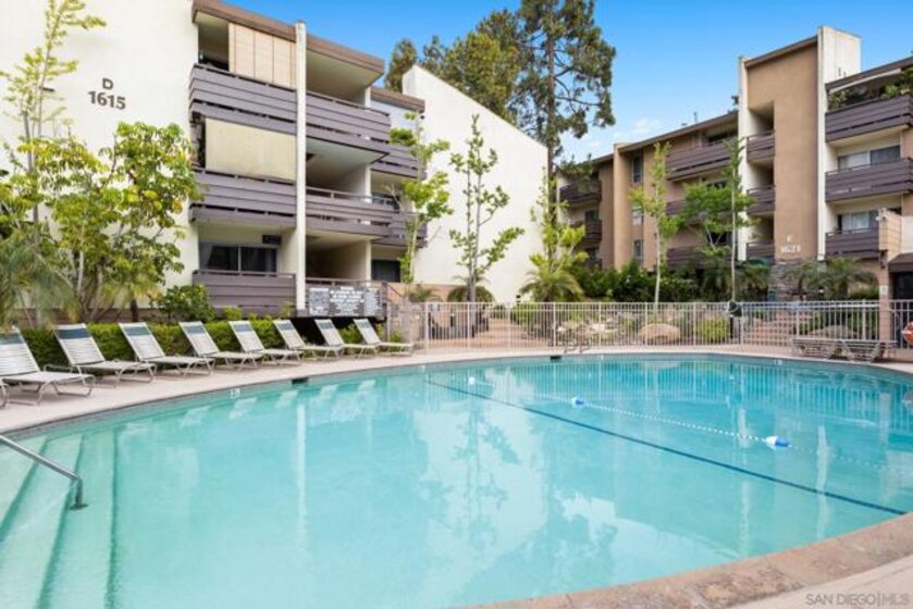 Welcome to your urban oasis in the heart of San Diego! This stylish and upgraded condo offers the perfect blend of modern comfort and convenience. The complex is hidden off the beaten path, filled with trees, creeks and multiple amenities, such as a pool, jacuzzi, basketball/ tennis courts, BBQs, gym w/ sauna & so much more. 2 nearby parking spots, 1 assigned garage and 1 open space with permit. Easy access to all major freeways, 10 minutes from the beach, the airport, downtown, numerous eateries, etc. Upgraded with dual-paned windows & sliding door to the patio, AC & heating with Nest Thermostat, overhead bluetooth speaker in the beautifully remodeled bathroom, 3 custom built closets & more! Water & trash included. VA & FHA approved.