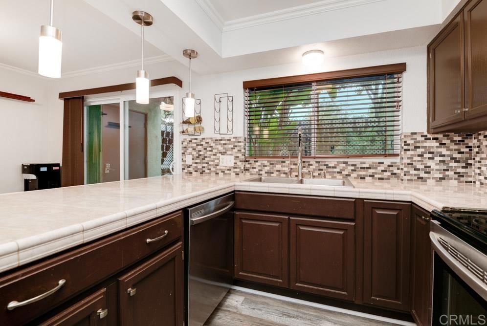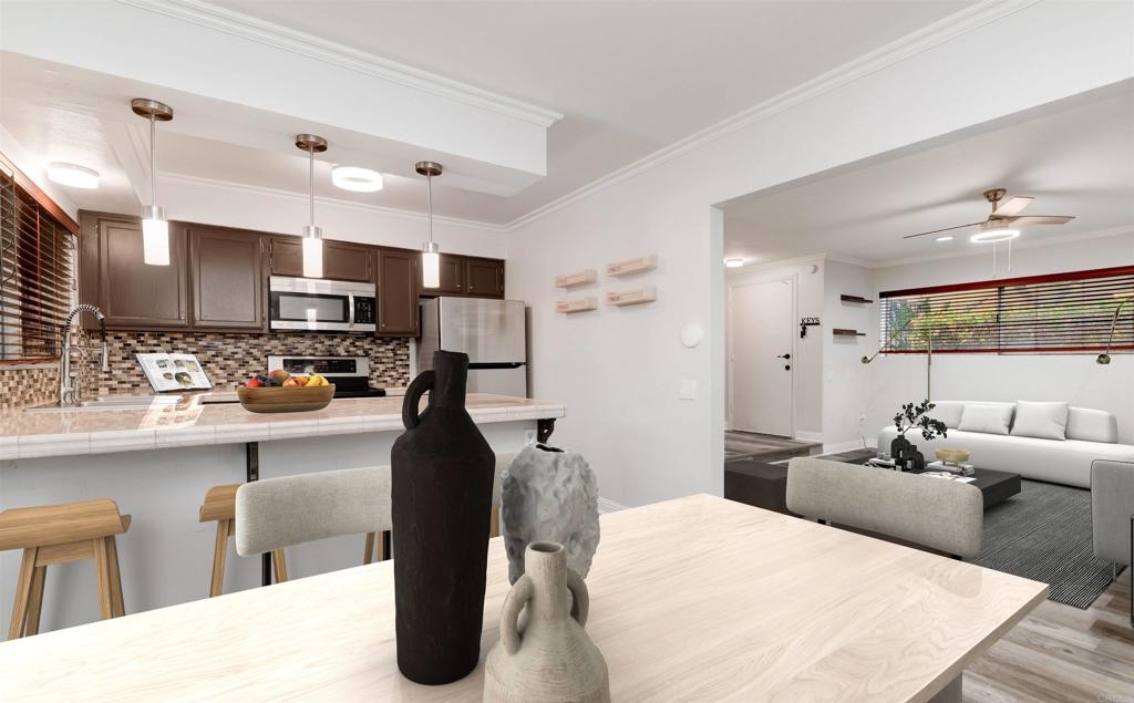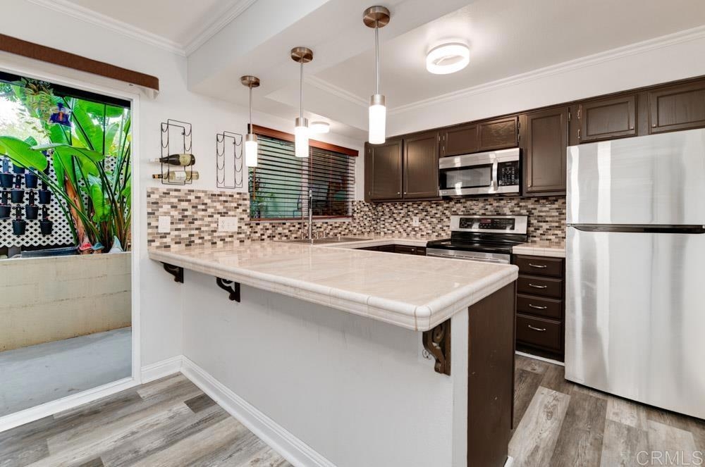 Discover the perfect blend of style, comfort, and location with this beautifully updated ground-floor condo in the desirable Park Villas North community. Step inside and immediately feel at home in the spacious open layout, featuring brand-new luxury vinyl flooring that adds warmth and sophistication throughout. The airy living and dining areas flow effortlessly onto a private patio—ideal for sipping coffee in the morning or winding down in the evening. The thoughtfully upgraded kitchen is both practical and inviting, showcasing sleek cabinetry, stainless steel appliances, a brand-new dishwasher, and an oversized breakfast bar that’s perfect for casual meals or entertaining guests. This home offers two large bedrooms, including a primary suite with a new mirrored closet that adds both style and functionality. Both bathrooms have been tastefully remodeled with modern vanities and fresh finishes, providing a clean, contemporary vibe. Enjoy added conveniences like your own assigned parking space, community laundry facilities, and rare private laundry hookups right on the patio. The community grounds are beautifully maintained, offering a peaceful retreat just steps from your door. All of this is set in the heart of Mission Valley—close to top shopping, dining, and entertainment options, with easy access to major freeways. Come see this move-in ready gem today and experience the best of Mission Valley living!
