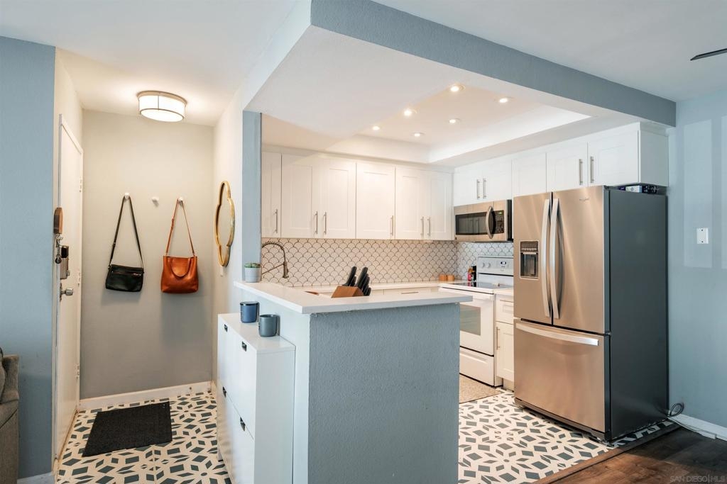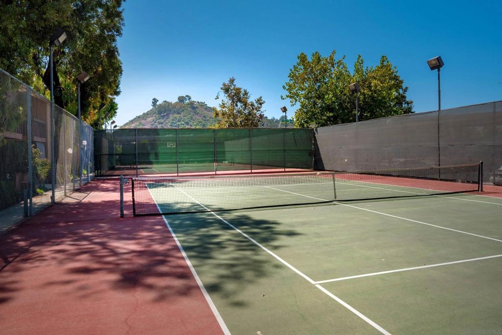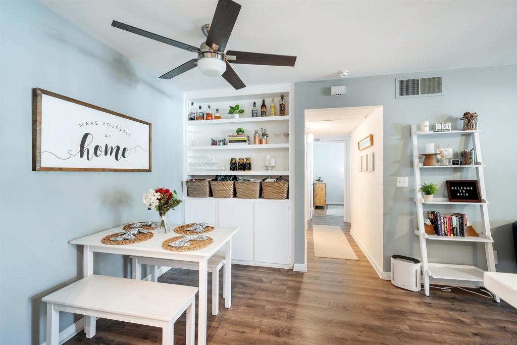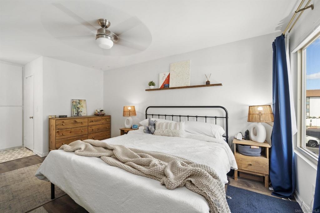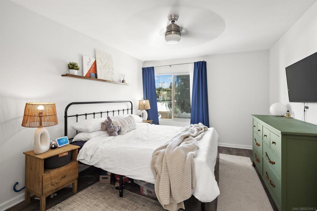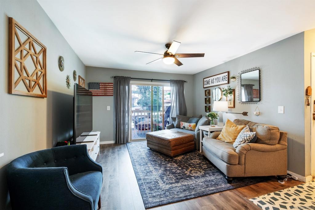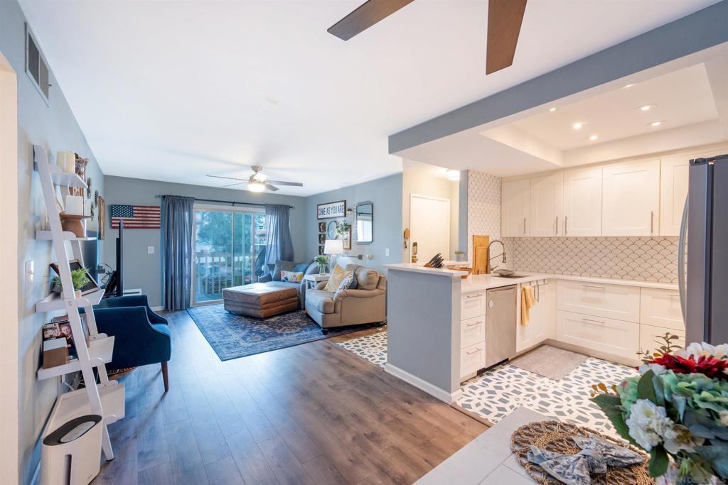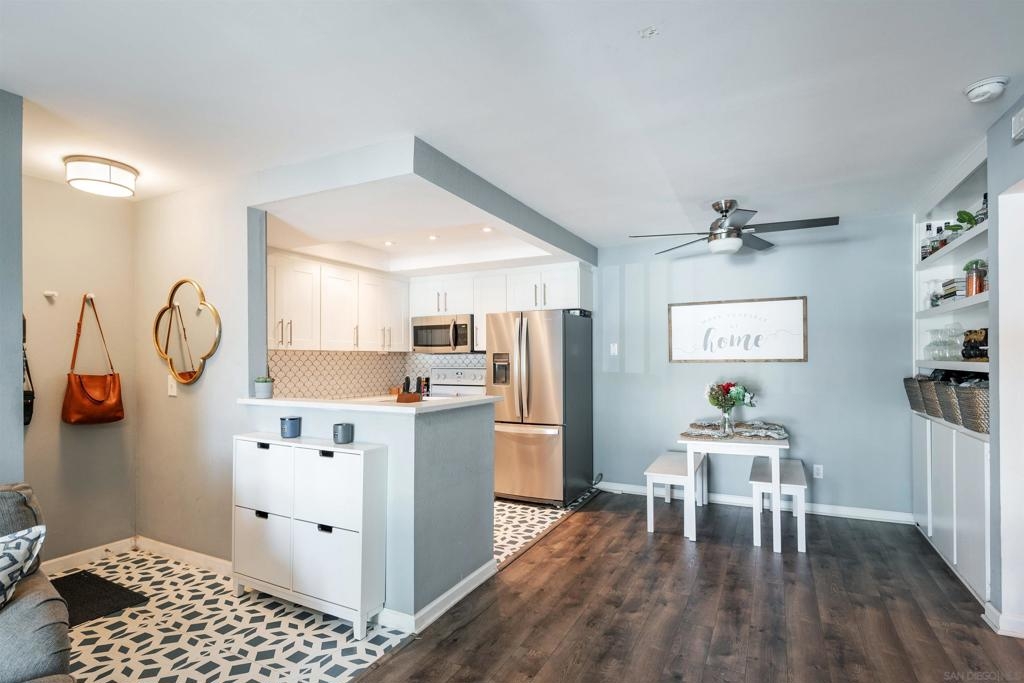 Move-in ready 2 bedroom, 1.25 bathroom condo in a prime location. Right from the entry, the unique hand-painted tiles catch your eye, a cool feature that's carried through to the kitchen and bathroom. The newly remodeled kitchen features new cabinetry, hardware, countertops, and a chic backsplash. Upgraded flooring adorns the living, dining areas, hallway, and bedrooms, presenting a fresh, modern feel. Enjoy the comfort of central air conditioning and new ceiling fans in the living room, dining and primary bedroom. The secondary bedroom features a new built-in desk, ideal for a home office/study. Step out onto the cozy balcony, providing a personal outdoor retreat to enjoy your morning coffee or evening reads. Outside, a low HOA fee offers a wealth of amenities including a community pool & spa, rec room, tennis and basketball courts, plus a dog park for your furry companion. Within walking distance to Snapdragon Stadium, the trolley, restaurants, and shopping centers makes this a coveted urban spot. Additionally, easy access to the 8 and 15 freeways puts you just a quick drive away from other city attractions/destinations.
