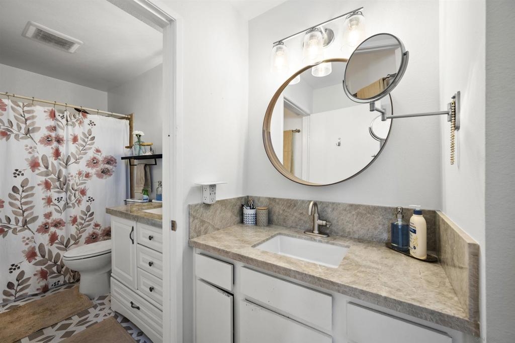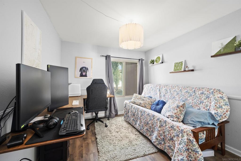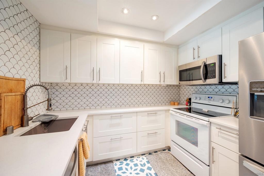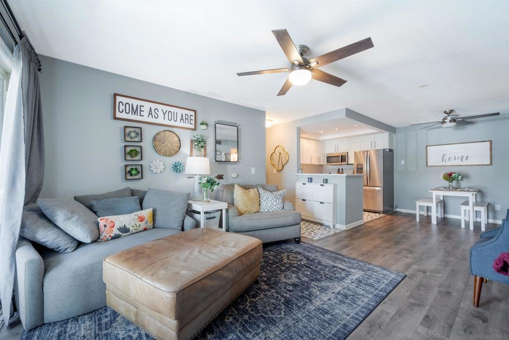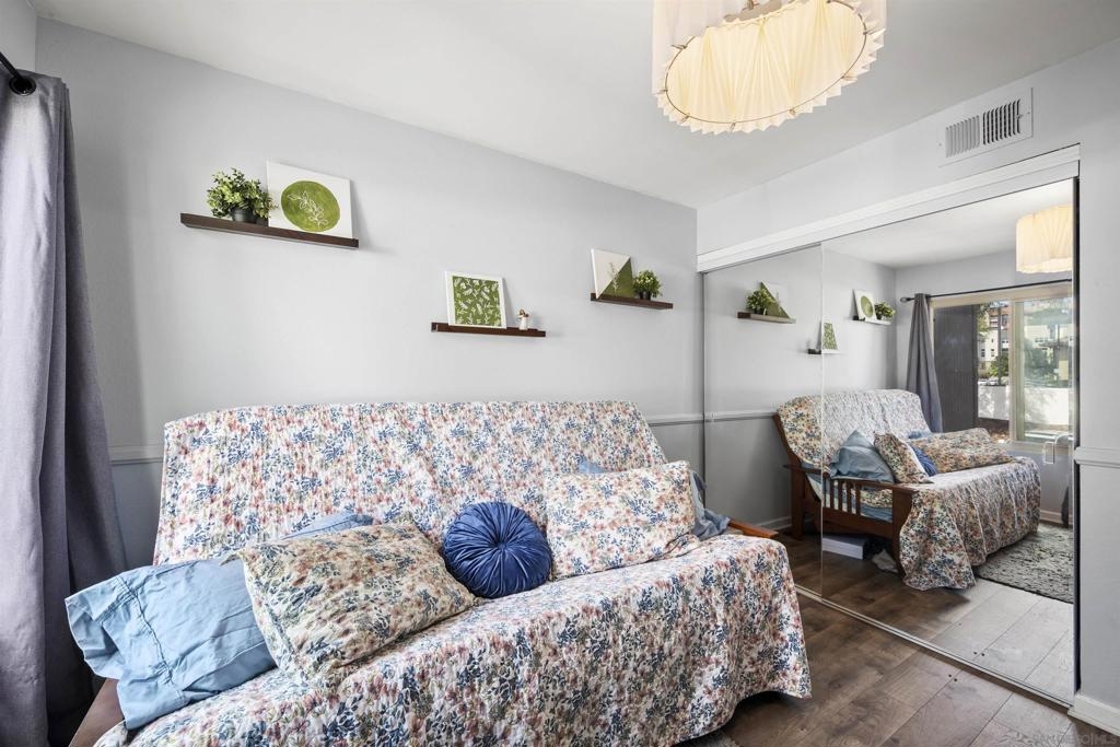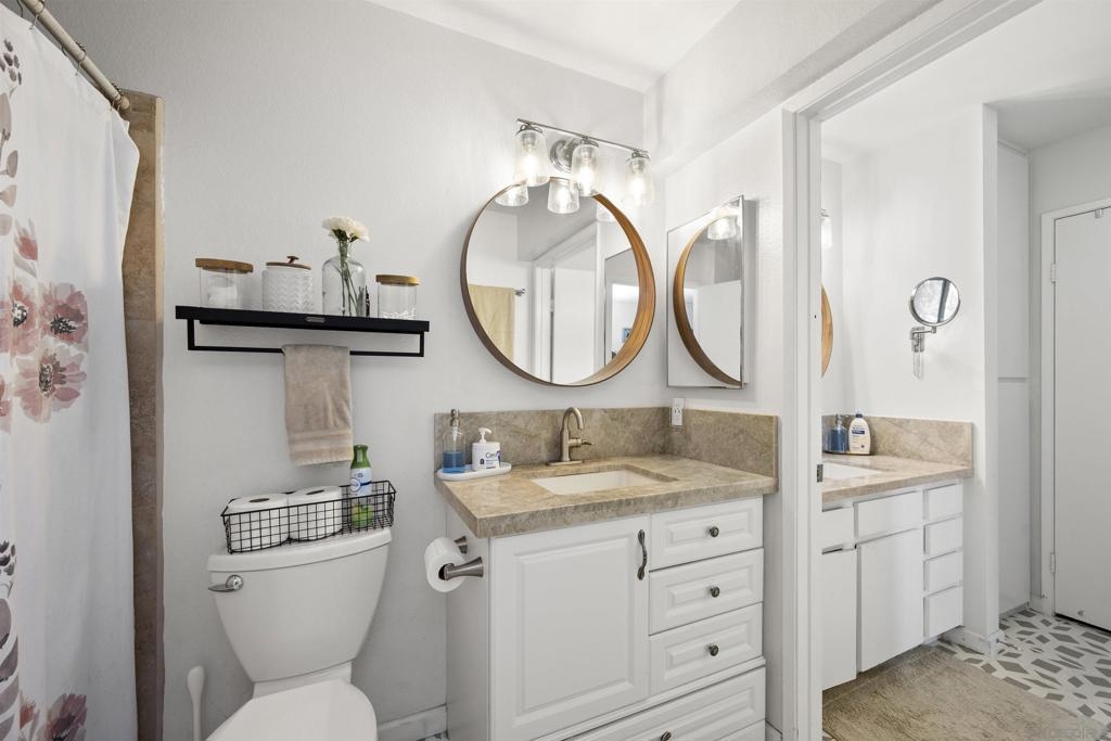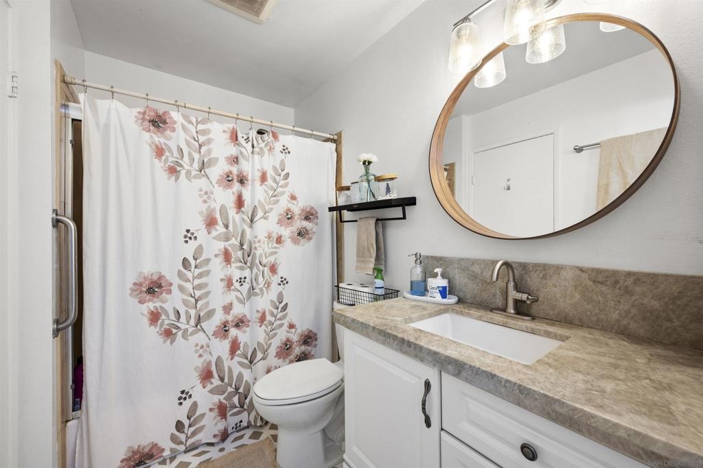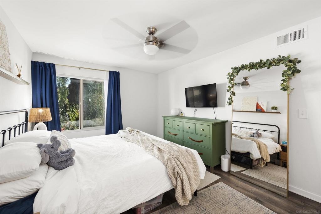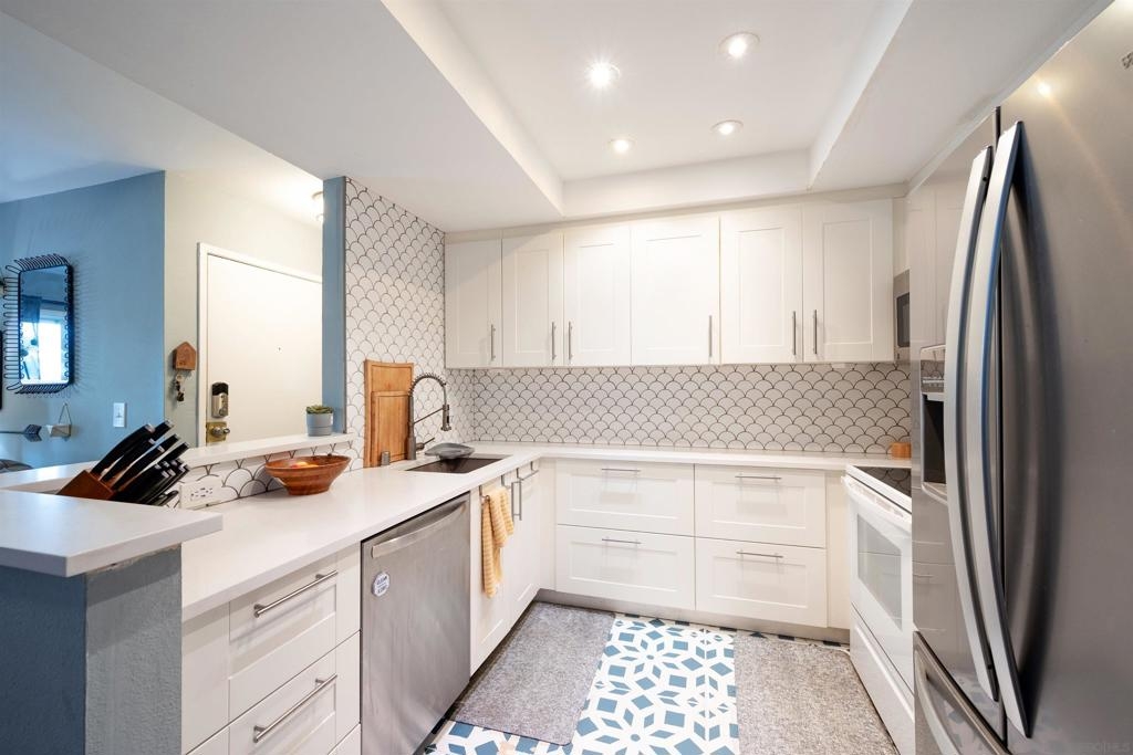 Move-in ready 2 bedroom, 1.25 bathroom condo in a prime location. Right from the entry, the unique hand-painted tiles catch your eye, a cool feature that's carried through to the kitchen and bathroom. The newly remodeled kitchen features new cabinetry, hardware, countertops, and a chic backsplash. Upgraded flooring adorns the living, dining areas, hallway, and bedrooms, presenting a fresh, modern feel. Enjoy the comfort of central air conditioning and new ceiling fans in the living room, dining and primary bedroom. The secondary bedroom features a new built-in desk, ideal for a home office/study. Step out onto the cozy balcony, providing a personal outdoor retreat to enjoy your morning coffee or evening reads. Outside, a low HOA fee offers a wealth of amenities including a community pool & spa, rec room, tennis and basketball courts, plus a dog park for your furry companion. Within walking distance to Snapdragon Stadium, the trolley, restaurants, and shopping centers makes this a coveted urban spot. Additionally, easy access to the 8 and 15 freeways puts you just a quick drive away from other city attractions/destinations.