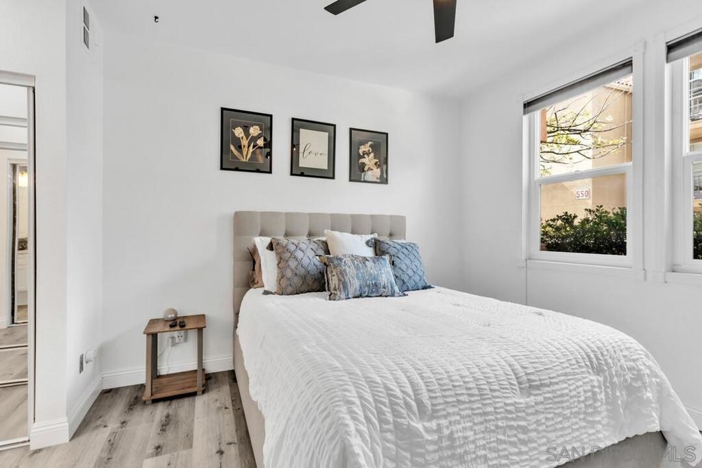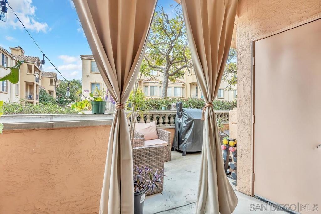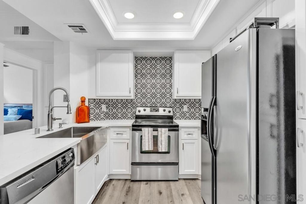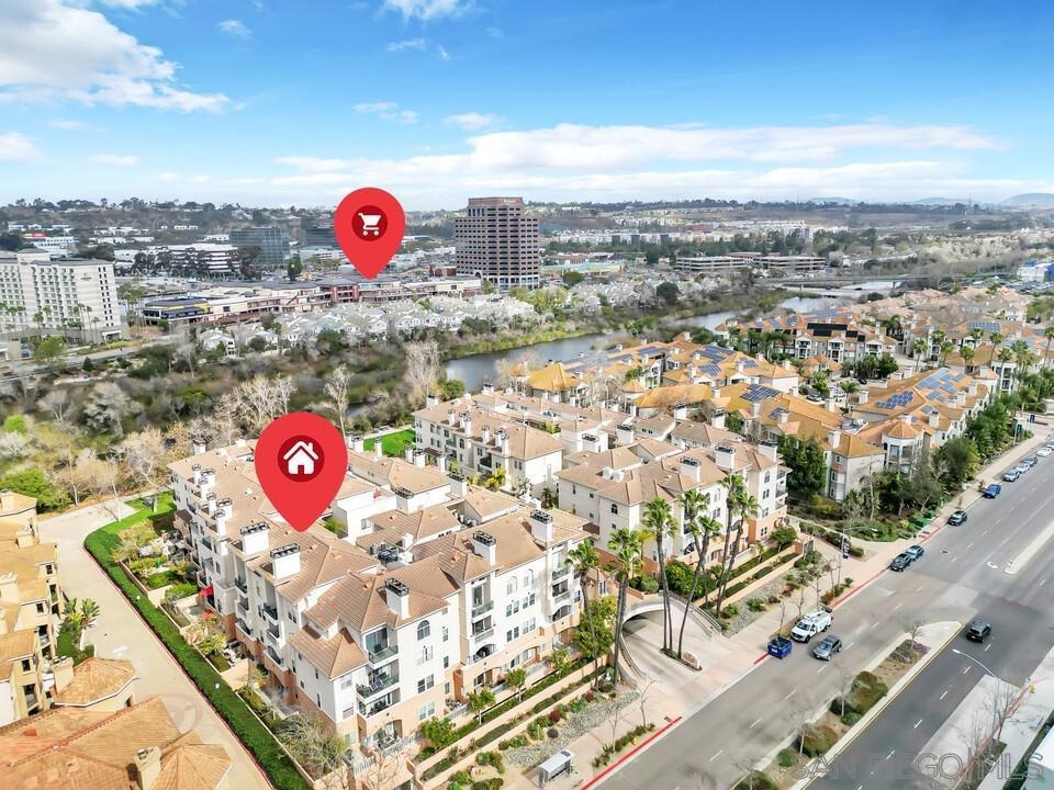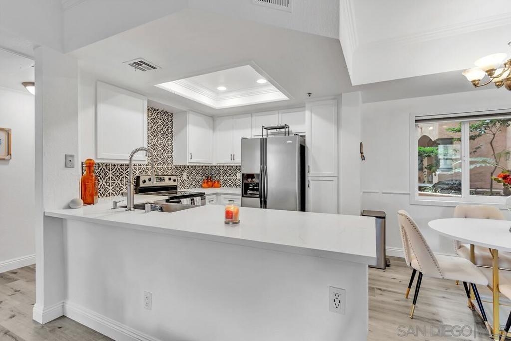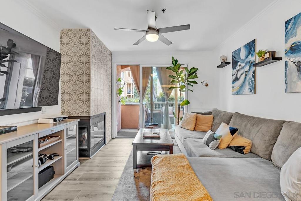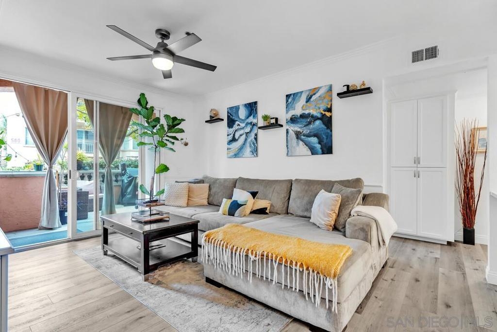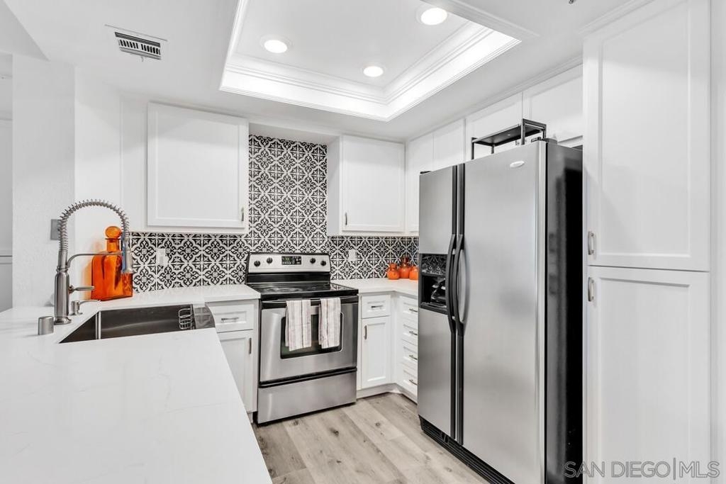 Light, bright and updated well maintained first floor Mission Valley condo in concrete building with gated under-ground parking with two assigned parking spots #76 and #122, and courtyards with manicured landscaping. All flooring updated. Quartz countertops in kitchen. White shaker cabinets in the kitchen. Primary bedroom has ensuite bathroom. Extra large balcony. Updated windows and sliding glass door, recessed ceiling and lighting in the kitchen. The A/C was replaced in 2015. Fridge, washer & dryer all convey. Water covered with HOA. Walk across the street to some of San Diego's finest cuisine, coffee shops and retail. Central to downtown, beaches and Universities.