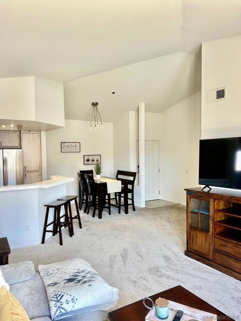 Welcome to this beautifully upgraded 808 sq. ft. one-bedroom, one-bath upper-level condo, perfectly positioned to capture stunning views of Mission Valley. This light-filled home features soaring vaulted ceilings that create an open, airy feel, enhancing both the living space and natural light throughout. The modern kitchen is equipped with sleek stainless steel appliances, offering both style and functionality for everyday living and entertaining. The spacious living area flows seamlessly to showcase the scenic views, making it the perfect place to relax or host guests. Retreat to the generously sized bedroom, complemented by ample closet space and a well-appointed bathroom. Located on the top floor, this unit provides added privacy and tranquility. Whether you're enjoying the elevated views, the contemporary upgrades, or the bright, open layout, this condo offers the perfect blend of comfort and convenience in a highly desirable location
