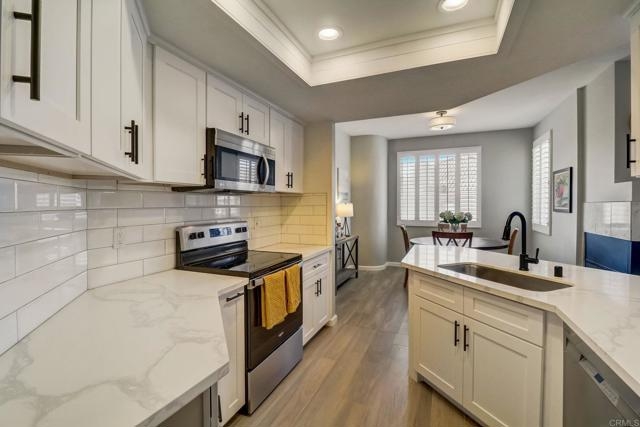Welcome to this stunning 3bed 2bath condo nestled on the third floor in Mission Valley's sought-after Rio Del Oro complex. This exquisite unit boasts an array of upgrades seamlessly blending convenience, comfort, and style. Step inside to discover an inviting open-concept layout that effortlessly connects the living, dining, and kitchen areas. The kitchen is a chef's dream, showcasing stainless steel appliances and elegant quartz countertops. Throughout most of the home you'll find luxury vinyl plank flooring, offering both durability and aesthetic appeal, with premium tile in the kitchen and bathrooms. Step out onto the West-facing balcony just off the living room. Ample closet space and abundant natural light enhance the comfort of this home. Indulge in all the amenities that Rio Del Oro has to offer, including a community pool and spa, a well-equipped fitness center, communal areas, and gated parking structure. Enjoy unparalleled access to major highways, shopping centers, and a plethora of dining options, along with some of San Diego's most renowned beaches.
