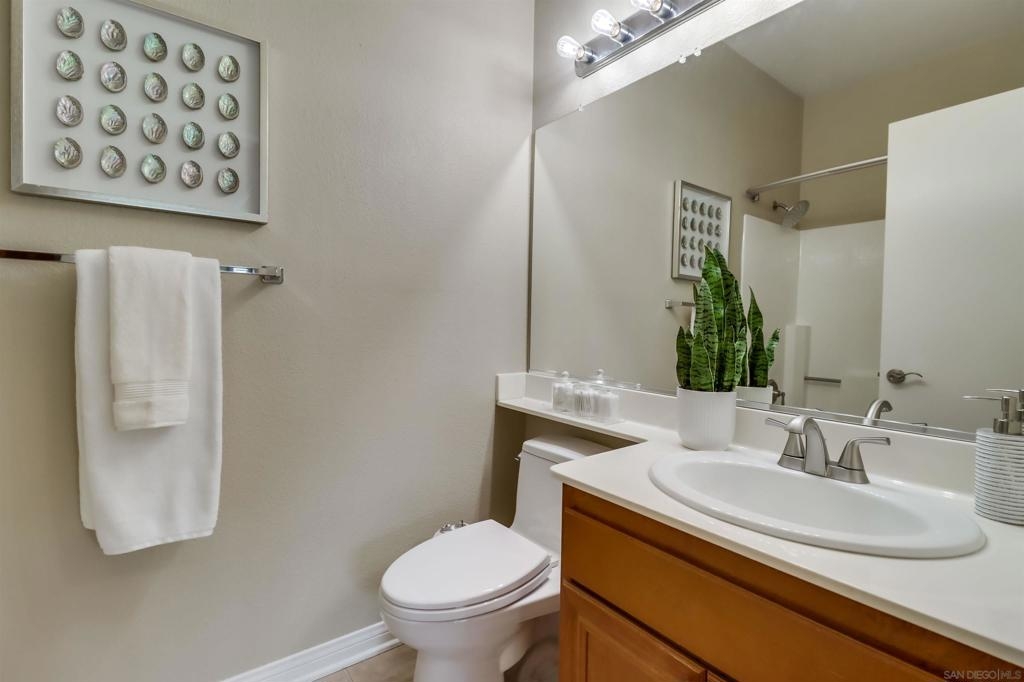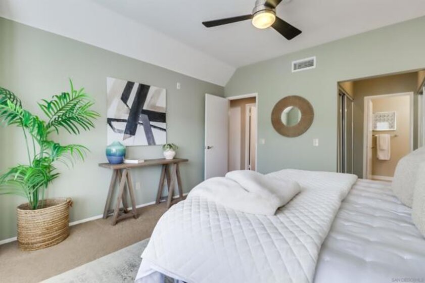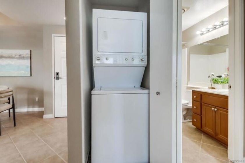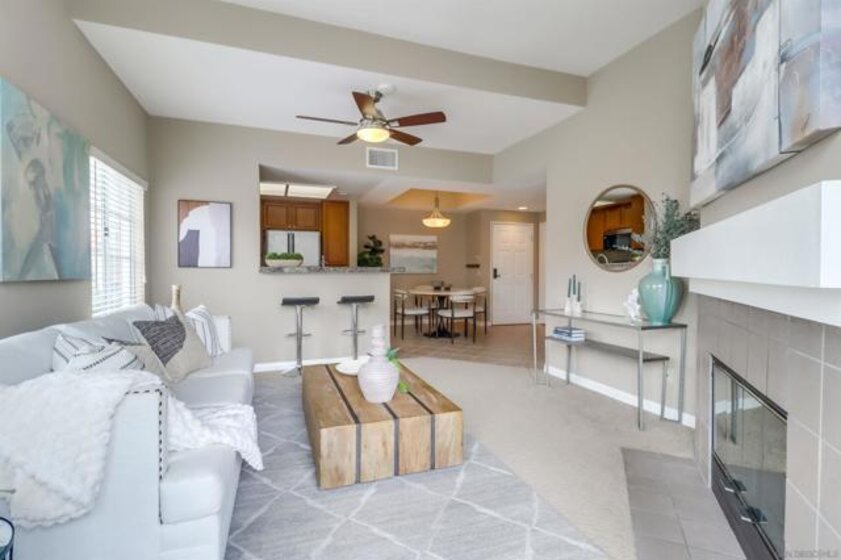 Your PENTHOUSE awaits! Welcome to this rarely available TOP FLOOR, SOUTHWEST facing, CORNER UNIT, offering green canyon VIEWS, and situated in one of Mission Valley’s most desirable communities - River Colony! Step inside to an inviting open layout featuring luxurious porcelain tile flooring, an upgraded kitchen with stainless steel appliances, and a cozy fireplace for those chilly evenings! Be amazed by an abundance of natural light from multiple windows that brighten every space, complemented by custom blinds, including room-darkening shades in the primary bedroom. Both bathrooms have been tastefully updated, and each room includes ceiling fans for added comfort. Enjoy the convenience of your own PRIVATE WASHER and DRYER, a recently maintained HVAC system, wired internal alarm system, and TWO assigned side-by-side parking spaces in the gated underground garage. A Ring doorbell, Google Nest thermostat, and BBQ grill adds extra value and modern convenience. River Colony residents enjoy resort-style living with access to a sparkling pool and spa, a fully equipped fitness center, a clubroom, and a Wi-Fi lounge, all maintained by a well-managed HOA. Ideally located near San Diego’s best shopping, dining, and trolley access, this home offers the perfect combination of comfort, style, and convenience. Don’t miss your opportunity to make this beautiful top-floor retreat yours, just in time for the holiday season!