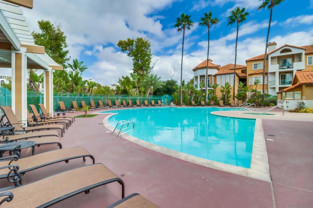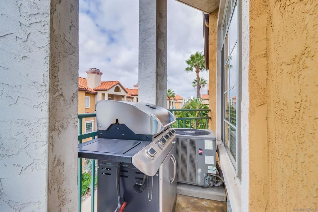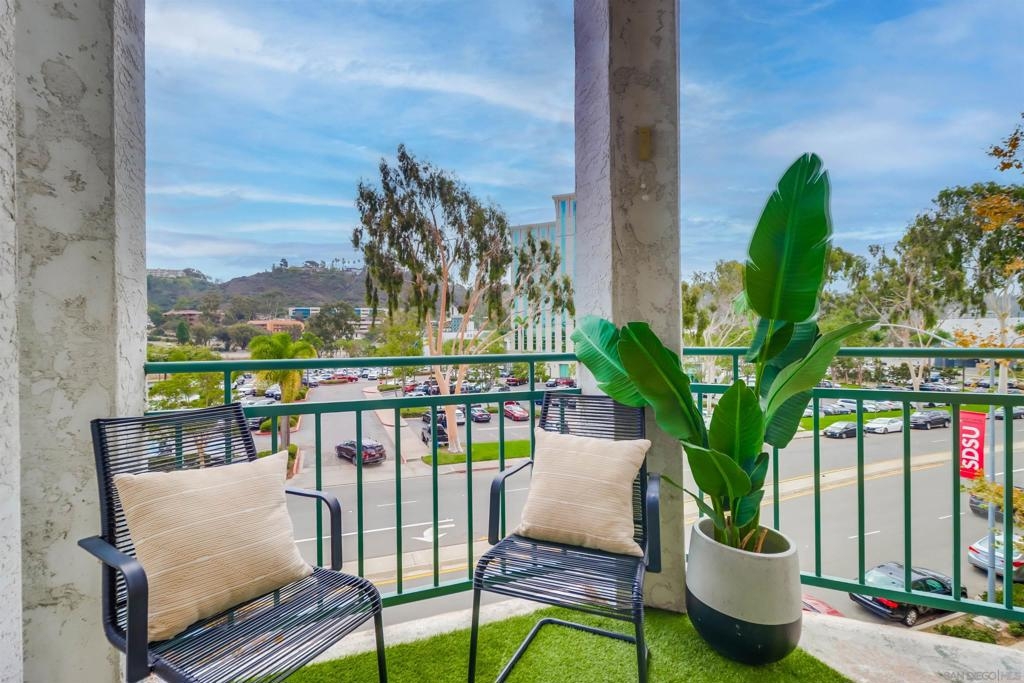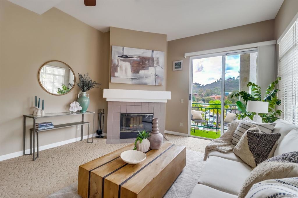 Your PENTHOUSE awaits! Welcome to this rarely available TOP FLOOR, SOUTHWEST facing, CORNER UNIT, offering green canyon VIEWS, and situated in one of Mission Valley’s most desirable communities - River Colony! Step inside to an inviting open layout featuring luxurious porcelain tile flooring, an upgraded kitchen with stainless steel appliances, and a cozy fireplace for those chilly evenings! Be amazed by an abundance of natural light from multiple windows that brighten every space, complemented by custom blinds, including room-darkening shades in the primary bedroom. Both bathrooms have been tastefully updated, and each room includes ceiling fans for added comfort. Enjoy the convenience of your own PRIVATE WASHER and DRYER, a recently maintained HVAC system, wired internal alarm system, and TWO assigned side-by-side parking spaces in the gated underground garage. A Ring doorbell, Google Nest thermostat, and BBQ grill adds extra value and modern convenience. River Colony residents enjoy resort-style living with access to a sparkling pool and spa, a fully equipped fitness center, a clubroom, and a Wi-Fi lounge, all maintained by a well-managed HOA. Ideally located near San Diego’s best shopping, dining, and trolley access, this home offers the perfect combination of comfort, style, and convenience. Don’t miss your opportunity to make this beautiful top-floor retreat yours, just in time for the holiday season!