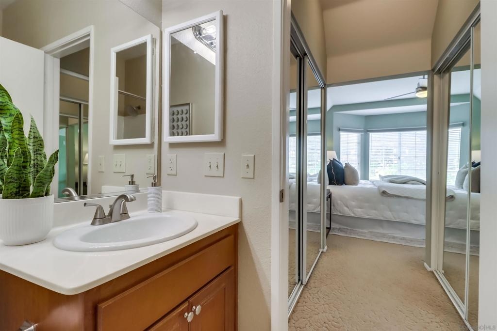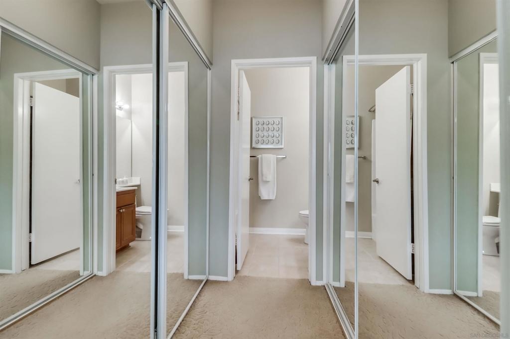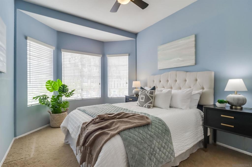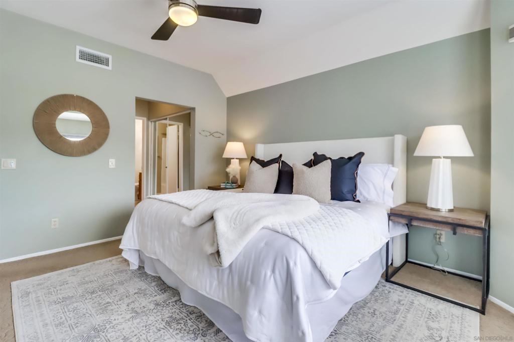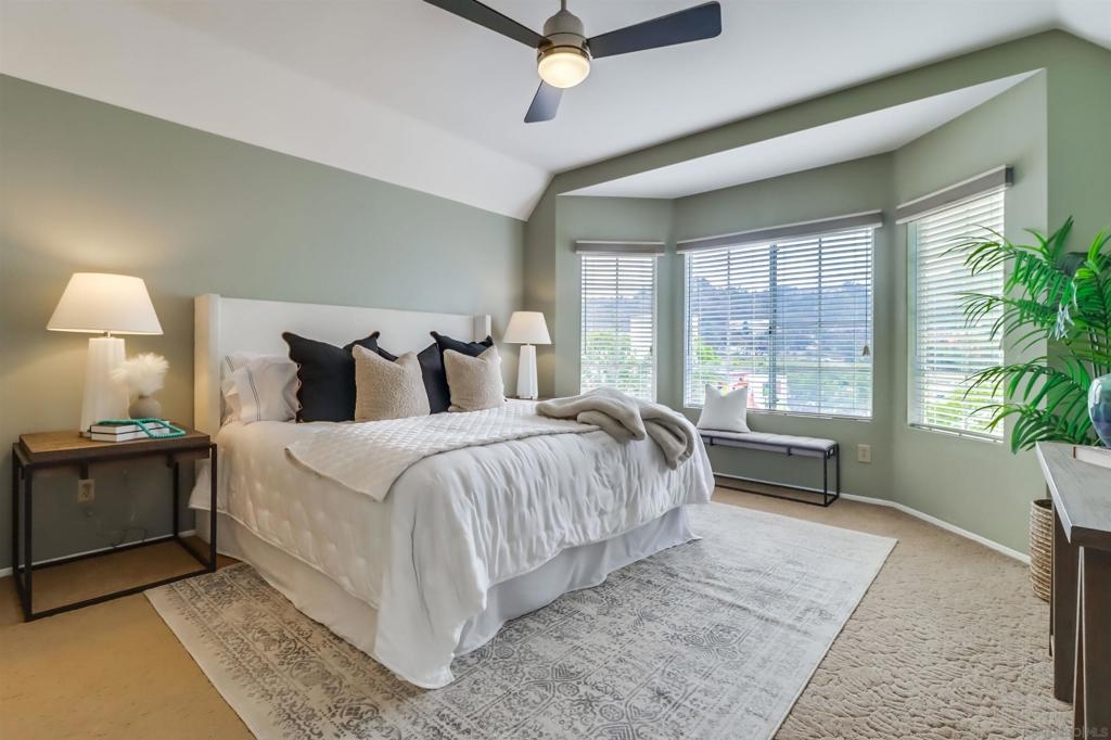Your PENTHOUSE awaits! Welcome to this rarely available TOP FLOOR, SOUTHWEST facing, CORNER UNIT, offering green canyon VIEWS, and situated in one of Mission Valley’s most desirable communities - River Colony! Step inside to an inviting open layout featuring luxurious porcelain tile flooring, an upgraded kitchen with stainless steel appliances, and a cozy fireplace for those chilly evenings! Be amazed by an abundance of natural light from multiple windows that brighten every space, complemented by custom blinds, including room-darkening shades in the primary bedroom. Both bathrooms have been tastefully updated, and each room includes ceiling fans for added comfort. Enjoy the convenience of your own PRIVATE WASHER and DRYER, a recently maintained HVAC system, wired internal alarm system, and TWO assigned side-by-side parking spaces in the gated underground garage. A Ring doorbell, Google Nest thermostat, and BBQ grill adds extra value and modern convenience. River Colony residents enjoy resort-style living with access to a sparkling pool and spa, a fully equipped fitness center, a clubroom, and a Wi-Fi lounge, all maintained by a well-managed HOA. Ideally located near San Diego’s best shopping, dining, and trolley access, this home offers the perfect combination of comfort, style, and convenience. Don’t miss your opportunity to make this beautiful top-floor retreat yours, just in time for the holiday season!