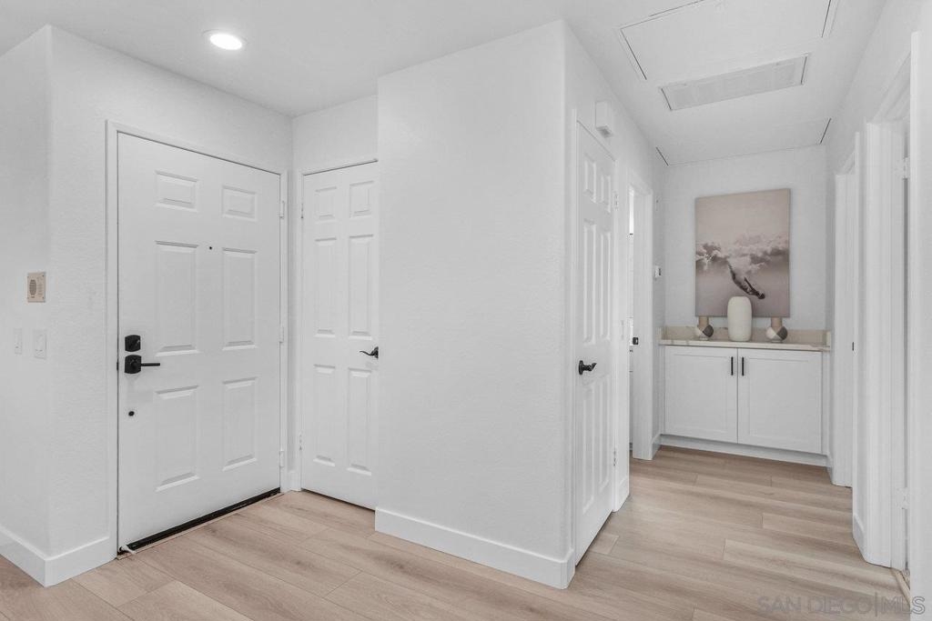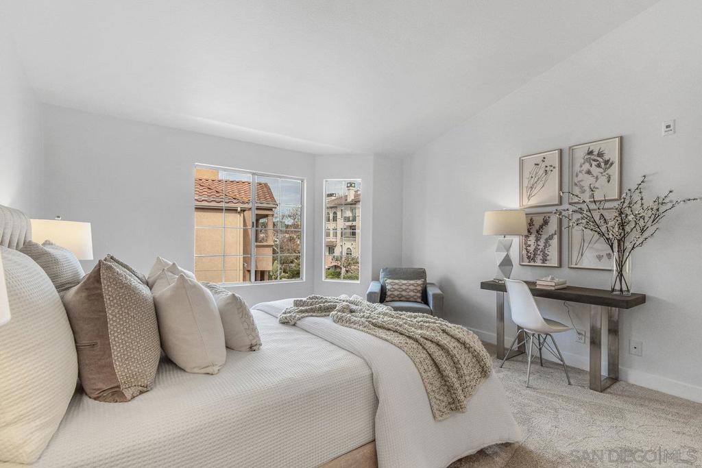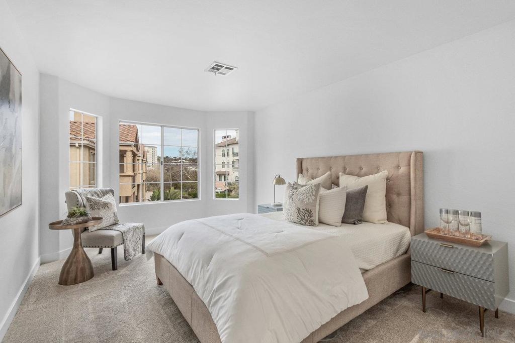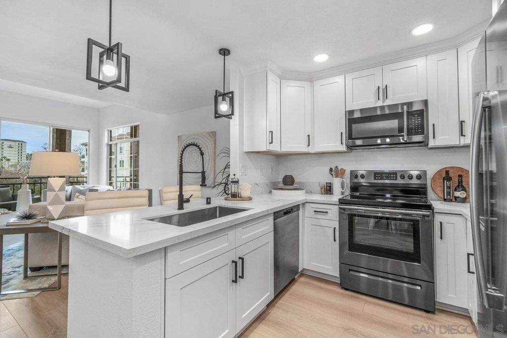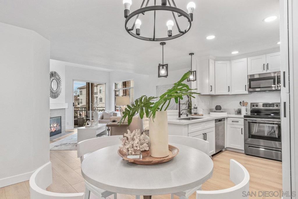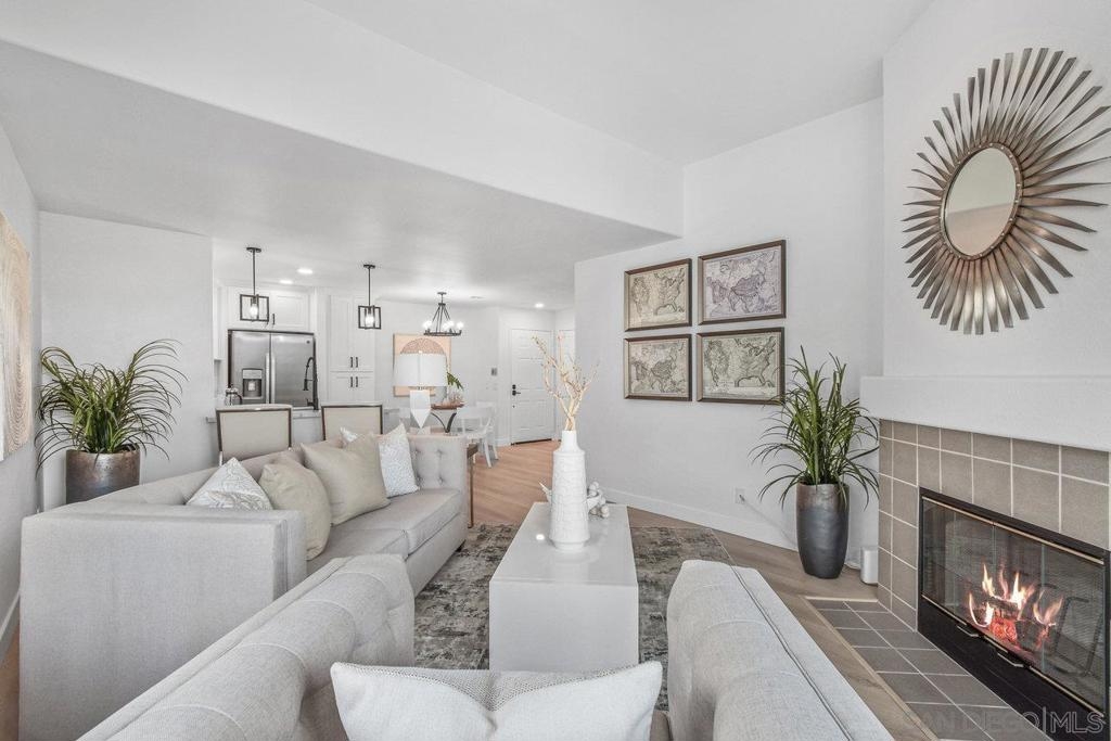 This gorgeous, remodeled, almost-everything-is-new top floor corner condo is ready for its new owner! The original owner has invested in updating the property and you get to enjoy it. Spacious new kitchen, on trend wide plank LVP flooring, new heat and A/C, stylish white paint and brand new carpet, plus lighting fixtures/bulbs with smart Cync tech, which allows all home lighting to be controlled by an app. The stunning kitchen, with white shaker cabinets, quartz countertops, new stainless appliances and plenty of storage, is ready for gourmet entertaining. The open concept living area is centered by a tile fireplace and is flanked by windows on two corners, and large glass sliders, providing a sense of openness along with access to the outdoor balcony area. The primary suite features high ceilings, peaceful views, new built-in storage and dual closets. The large second bedroom offers a bay window which brings in tons of natural light. Each bathroom showcases shaker cabinets with quartz counters, new flooring, fixtures and mirrors.Two side by side parking spots in the secure parking garage, a large sunny pool and spa area, community room and a well equipped gym round out the amenities at River Scene. Enjoy direct access from the complex to the San Diego River walking and biking trail system. Great central location with easy access to beaches, shopping, dining and transportation options. The River Scene complex is VA and FHA approved.
