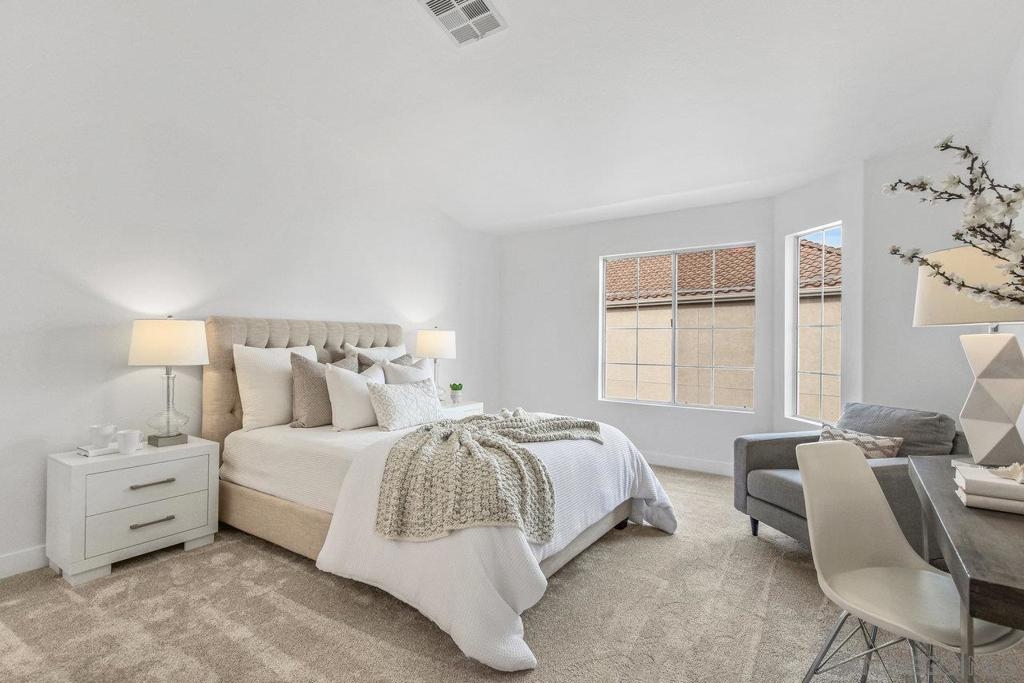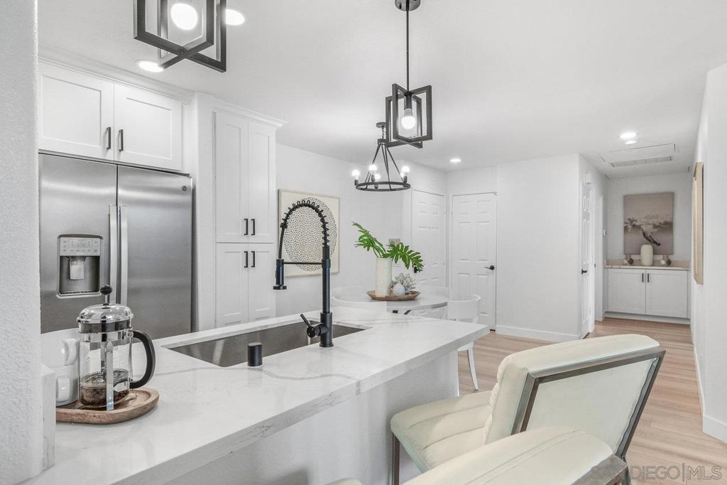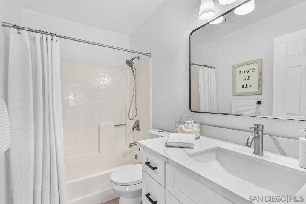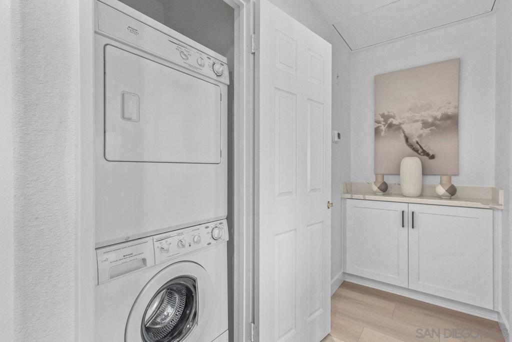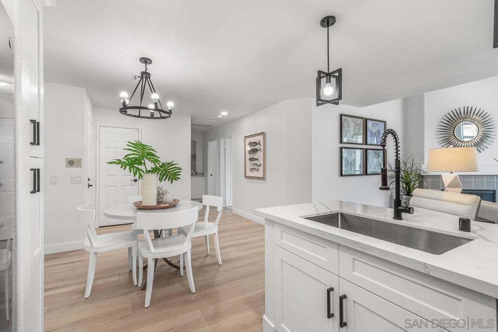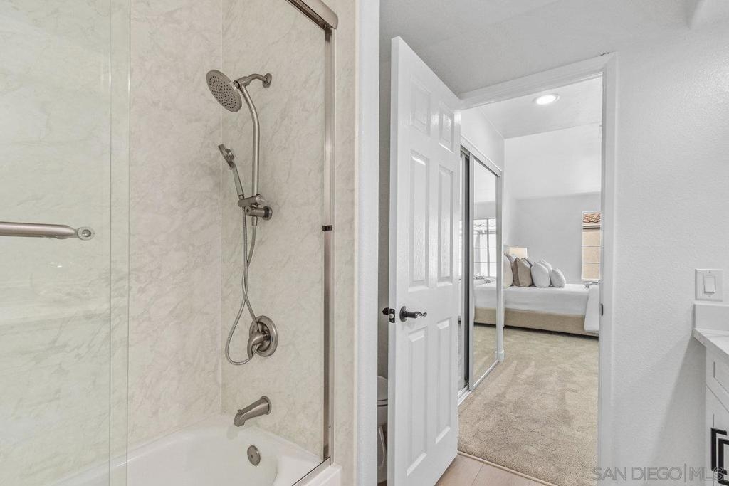 This gorgeous, remodeled, almost-everything-is-new top floor corner condo is ready for its new owner! The original owner has invested in updating the property and you get to enjoy it. Spacious new kitchen, on trend wide plank LVP flooring, new heat and A/C, stylish white paint and brand new carpet, plus lighting fixtures/bulbs with smart Cync tech, which allows all home lighting to be controlled by an app. The stunning kitchen, with white shaker cabinets, quartz countertops, new stainless appliances and plenty of storage, is ready for gourmet entertaining. The open concept living area is centered by a tile fireplace and is flanked by windows on two corners, and large glass sliders, providing a sense of openness along with access to the outdoor balcony area. The primary suite features high ceilings, peaceful views, new built-in storage and dual closets. The large second bedroom offers a bay window which brings in tons of natural light. Each bathroom showcases shaker cabinets with quartz counters, new flooring, fixtures and mirrors.Two side by side parking spots in the secure parking garage, a large sunny pool and spa area, community room and a well equipped gym round out the amenities at River Scene. Enjoy direct access from the complex to the San Diego River walking and biking trail system. Great central location with easy access to beaches, shopping, dining and transportation options. The River Scene complex is VA and FHA approved.