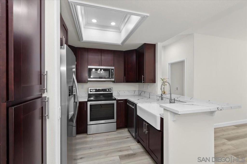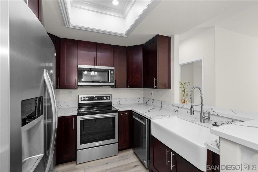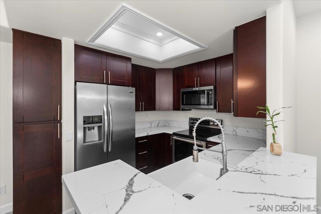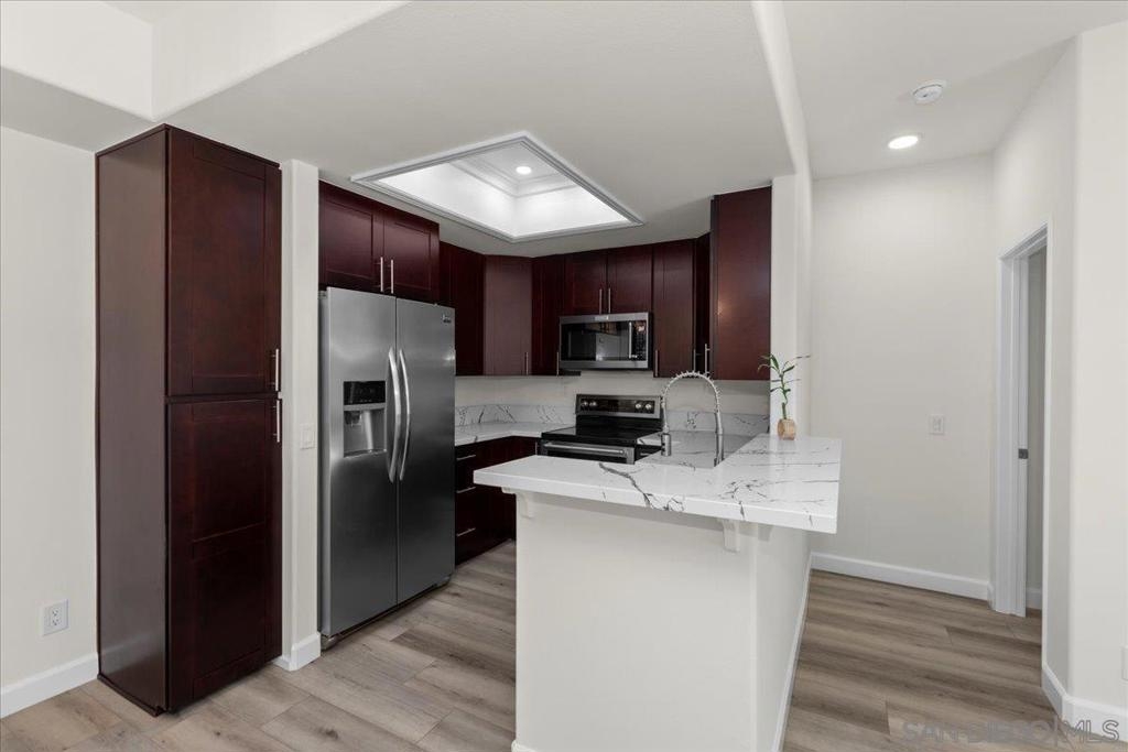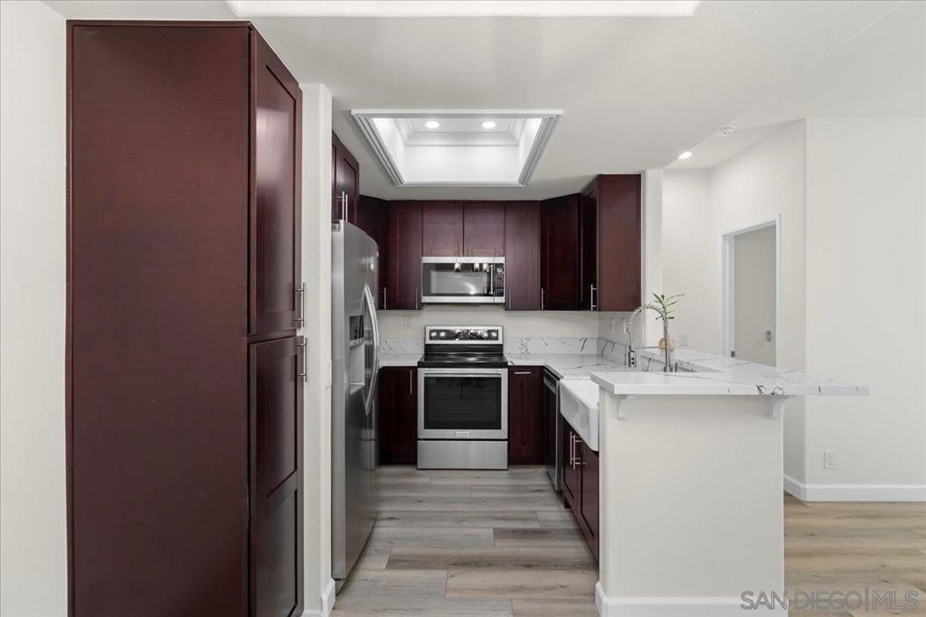 Experience modern luxury in this spacious, fully remodeled 2-bedroom, 2-bathroom condo, perfectly situated in the highly desirable River Scene complex. Tucked away on the second floor for added privacy, this home offers picturesque views of magnolia trees, palm trees, and the beautifully maintained pool area off the balcony. Upon entry, the open-concept living space welcomes you with contemporary elegance and high-end finishes. The stunning floor-to-ceiling quartz fireplace serves as a focal point, complementing the sleek quartz countertops and state-of-the-art stainless steel appliances in the kitchen. With brand-new flooring, fresh paint, and completely renovated bathrooms, in-unit fulll-size laundry, every detail has been carefully curated for a modern and sophisticated living experience. Residents of River Scene enjoy exceptional amenities, including a resort-style pool, a well-equipped fitness center, and water utilities covered by the HOA. Conveniently located near SDSU, USD, major freeways, and an abundance of shopping and dining options, this home is just minutes from Downtown San Diego and the SAN Airport. Completely move-in ready, this exceptional condo presents a rare opportunity for refined riverfront living. This home is in the census tract that qualifies for the Home Advantage program. A key advantage of Home Advantage is a 3% down payment and no mortgage insurance! Ask me for more details.