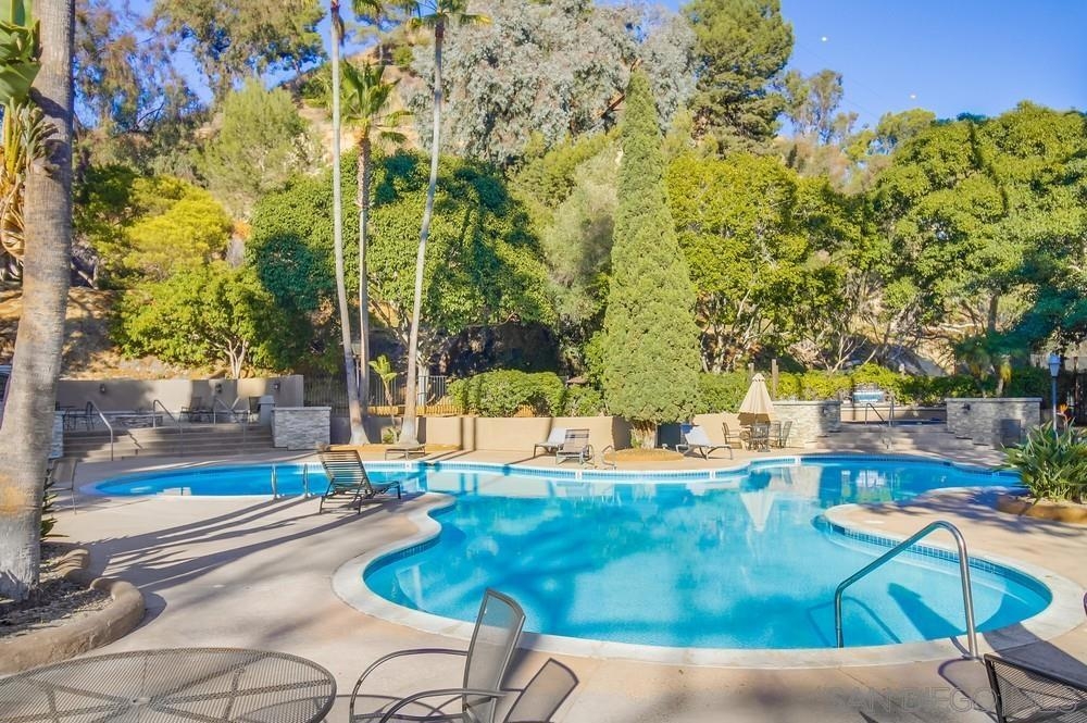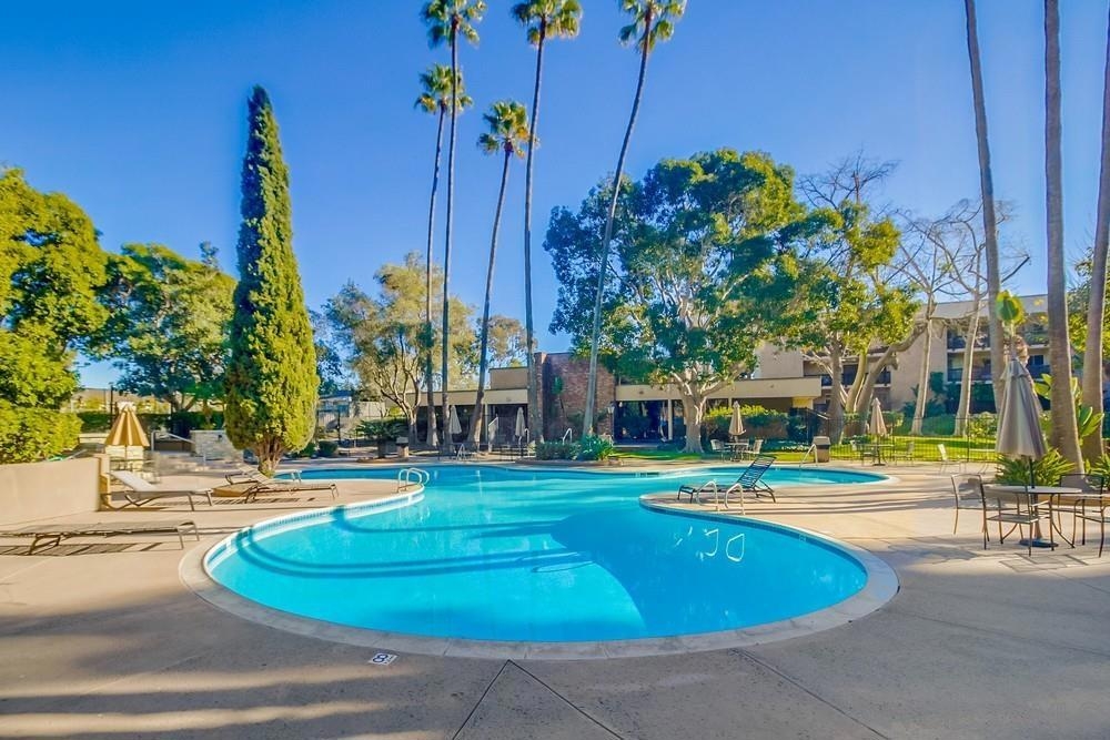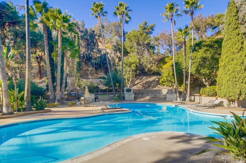 Charming second floor end unit in the beautiful The Bluffs at Fashion Valley condominium. This unit has one of the best quiet locations with a large private balcony with nice views to the bluffs. This light and bright condo has a great floor plan, and it offers special features such as central AC/Heating, access to the balcony from the living room, bedroom and dining room. The Bluffs is a resort style complex offering 2 sparkling pools, SPA, tennis courts, club house, gym, BBQs and much more... The Bluffs at Fashion Valley offers resort-style living with unparalleled amenities. Enjoy two stunning pools nestled amidst natural surroundings, lush landscaping with palm trees, a relaxing spa, tennis courts, clubhouse, gym, game room, meeting room, and BBQ areas. Complex is perfectly situated near Fashion Valley Mall, YMCA, trolley stations, and just minutes from Downtown San Diego, Hillcrest, Balboa Park, the bay, Sea World, and San Diego International Airport. Convenient access to major freeways including I-5, I-8, I-805, and SR-163. The HOA provides exceptional value covering cable TV, water, trash pickup, and more. This centrally located gem presents an outstanding opportunity. VA and FHA approved complex.