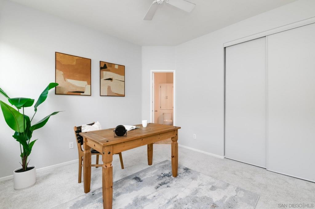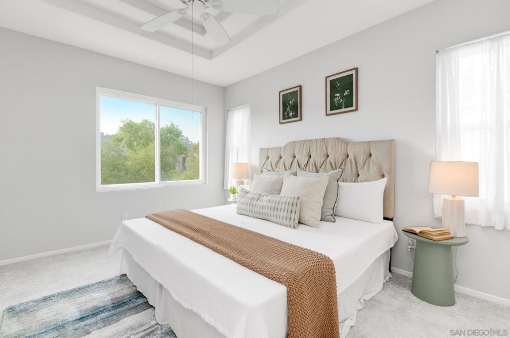 Prepare to be enchanted. Imagine waking up to the melody of songbirds and a tree top view of protected open space. Enjoy the brand new plush carpet underfoot as you make your way to your bathroom with its extra deep soaking tub. Or imagine coming home to your bright living room, with 10’ tall ceilings, fireplace and gleaming, durable laminate flooring. Clerestory windows and handsome Roman shades provide a classy touch. The kitchen features black granite countertops, a walk in pantry and under-counter lighting. Your private backyard includes low-maintenance turf and landscaping. Other features include a second ensuite bedroom upstairs and abundant storage. The stairwell is bathed in light by an enormous skylight, while downstairs provides direct access to your garage as well as a ½ bath. This home has been freshly painted throughout in a soothing, neutral palette. On the market for the first time in 23 years, it has been meticulously maintained and shows real pride of ownership. There are almost too many amenities and conveniences to mention. Common areas are distinguished by lush, mature landscaping, pool, spa and BBQ area. The San Diego River trail runs adjacent to the community, and will connect to the ocean upon completion. The trolley stop just outside the main gate provides easy access to shopping, Snapdragon Stadium, SDSU, downtown, Gaslamp District, Petco Park and UCSD. Just across the street you'll find a real bricks & mortar book store! This home has it all, with privacy, views and easy access to the best of everything. The only thing missing is YOU!