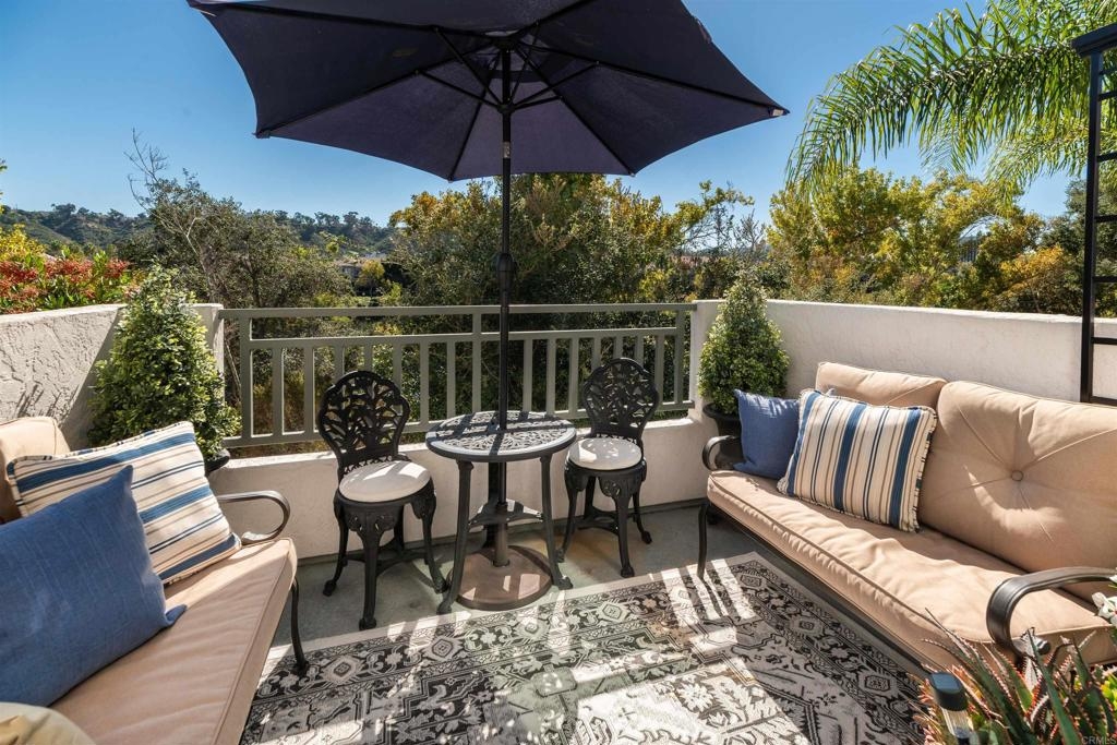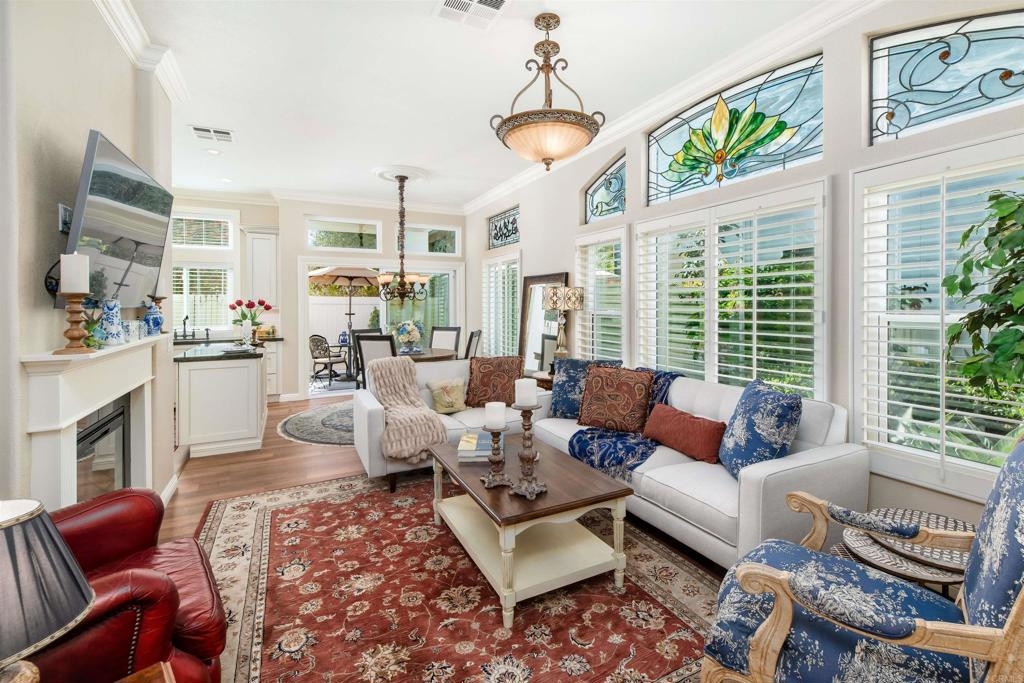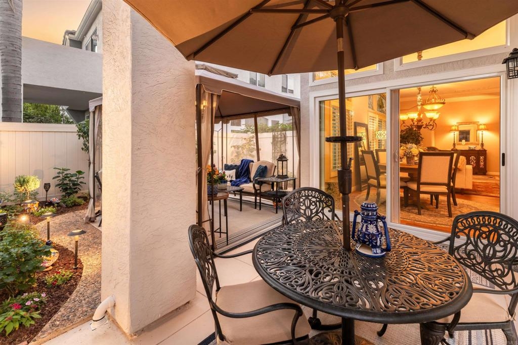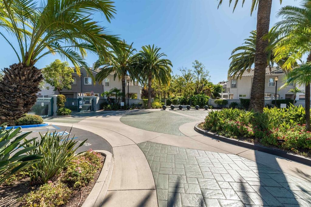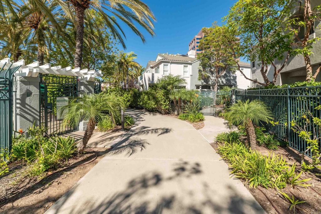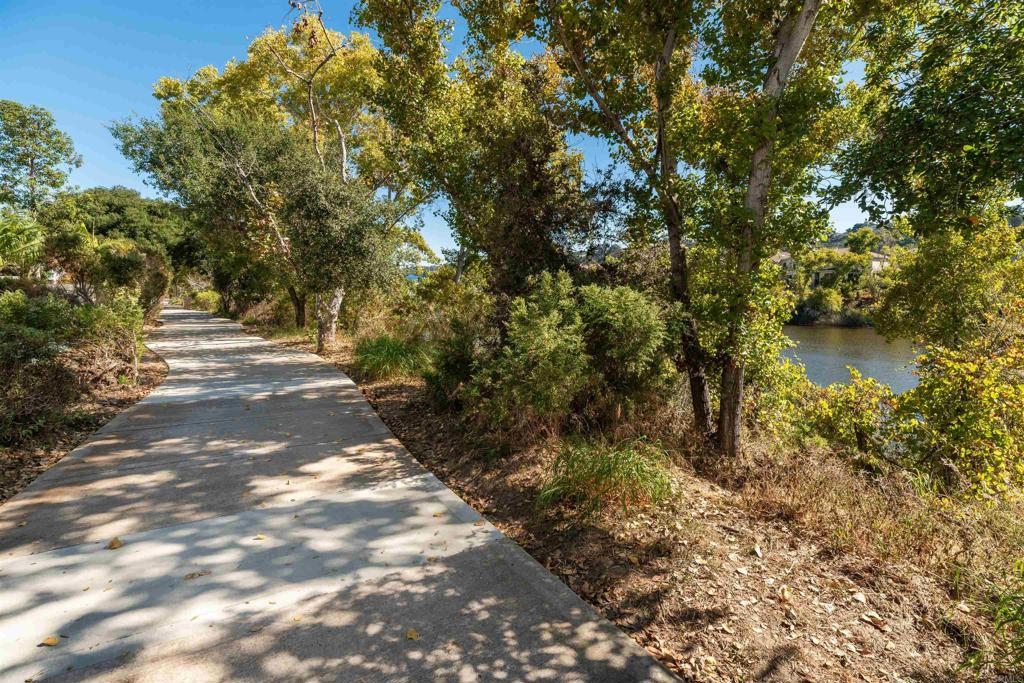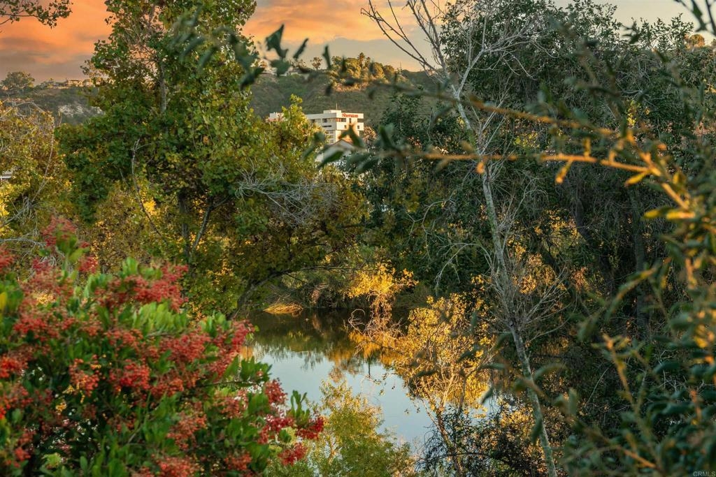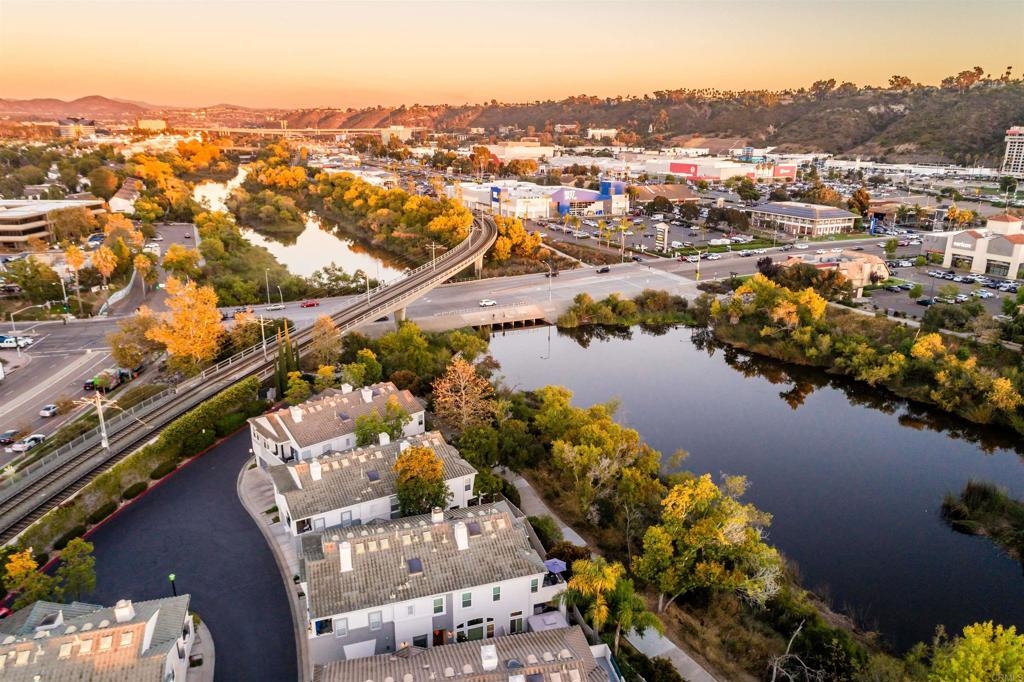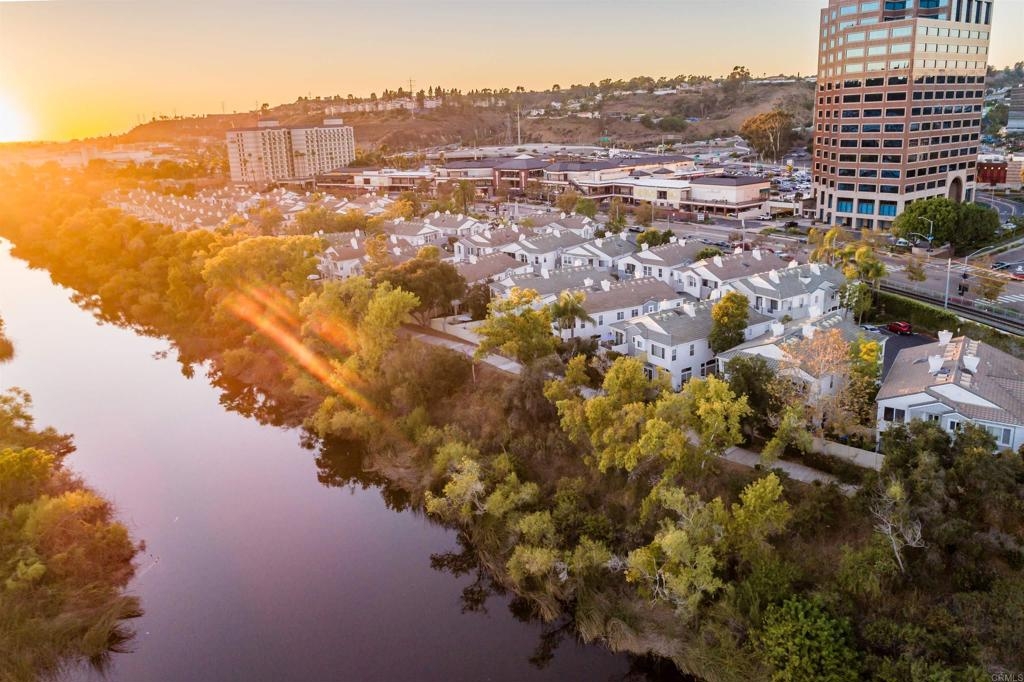 Rarely available South facing end unit overlooking the San Diego River! Peacefully situated in the gated community of Union Square in the heart of Mission Valley, this immaculate townhome offers privacy & comfortable sophistication w/ its refined open interior, contemporary design elements & the only Model 2 unit in the complex w/ private view balcony off the primary suite. Quintessential location: Steps to Hazard Center & shopping centers w/ a conveniently located Trolley stop & easy freeway access to the beaches, downtown, & airport all while maintaining privacy & exclusivity. Once inside, crown molding, luxury vinyl floors & new windows throughout work to create a captivating interior offering a spacious high-end feel. Bathed in natural light & accented w/ high ceilings, beautiful stained glass windows & an elegant electric fireplace, the spacious living room & adjacent dining room offers a perfect balance for casual lounging or hosting elevated gatherings alike while sliding glass doors work to unite the interior to the private outdoor patio. Remodeled kitchen equipped w/ granite counters, white shaker style cabinetry, instant hot water faucet, island & walk-in pantry. Mainl-level half BA. Continue upstairs w/ gorgeous wainscoting. Affording the timeless charm of sunset views, the primary suite features a large balcony, tray ceilings, plantation shutters, California closets and folding closet door to maximize space. Spa quality BA w/ dual sinks & walk-in shower. Secondary BR w/ crown molding & upgraded ensuite BA. Both BRs feature new ceiling fans. Attached 1 car garage w/ resurfaced floors. 1 assigned parking space. Backyard offers a perfect balance of beauty & function w/ irrigation system, dusk to dawn LED lighting & pergola. Welcome home!