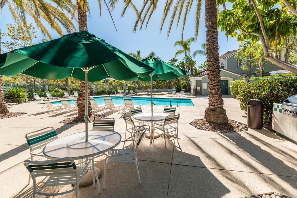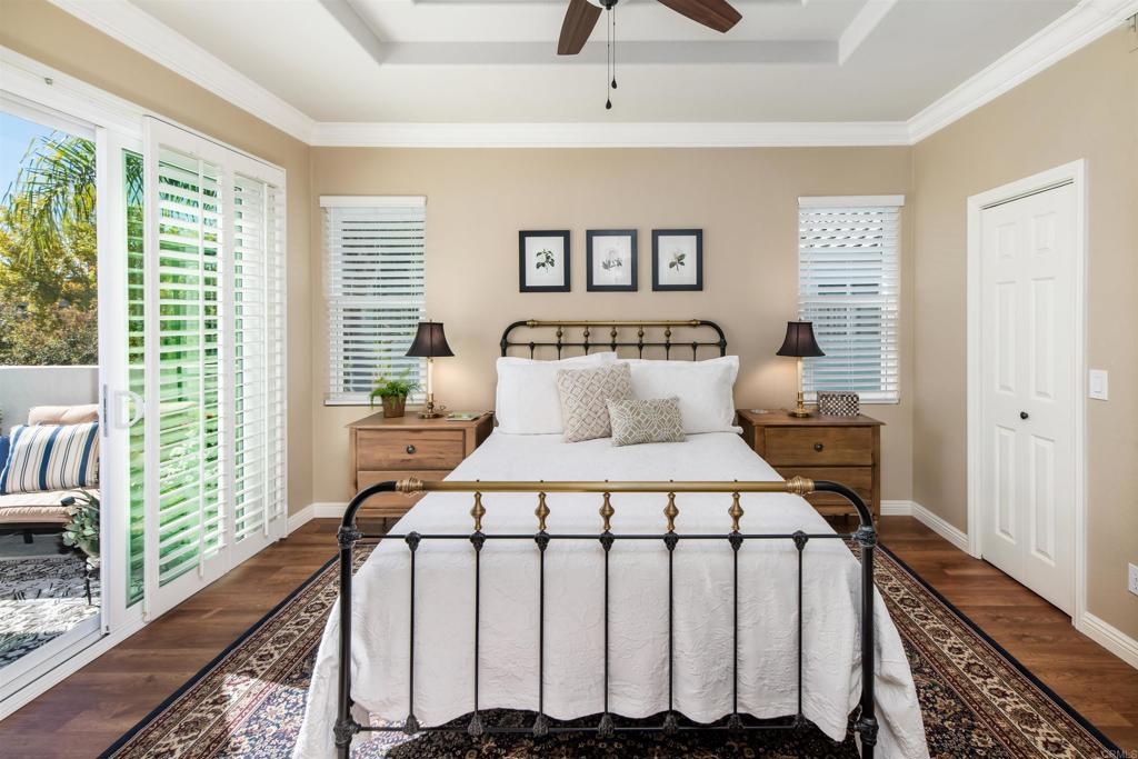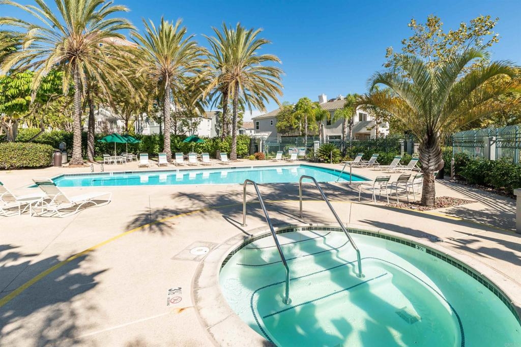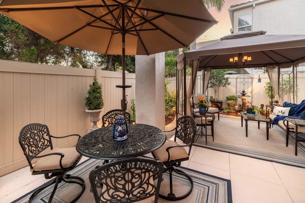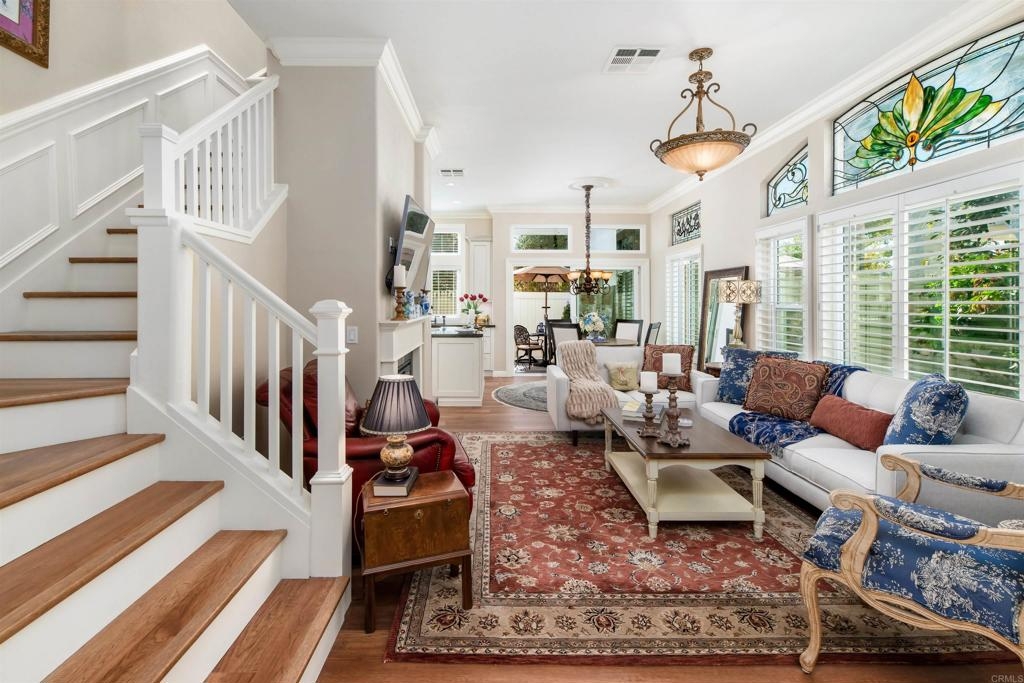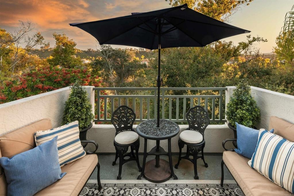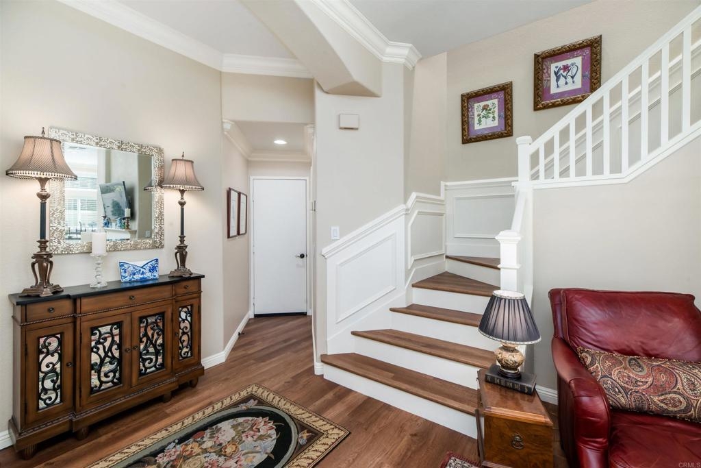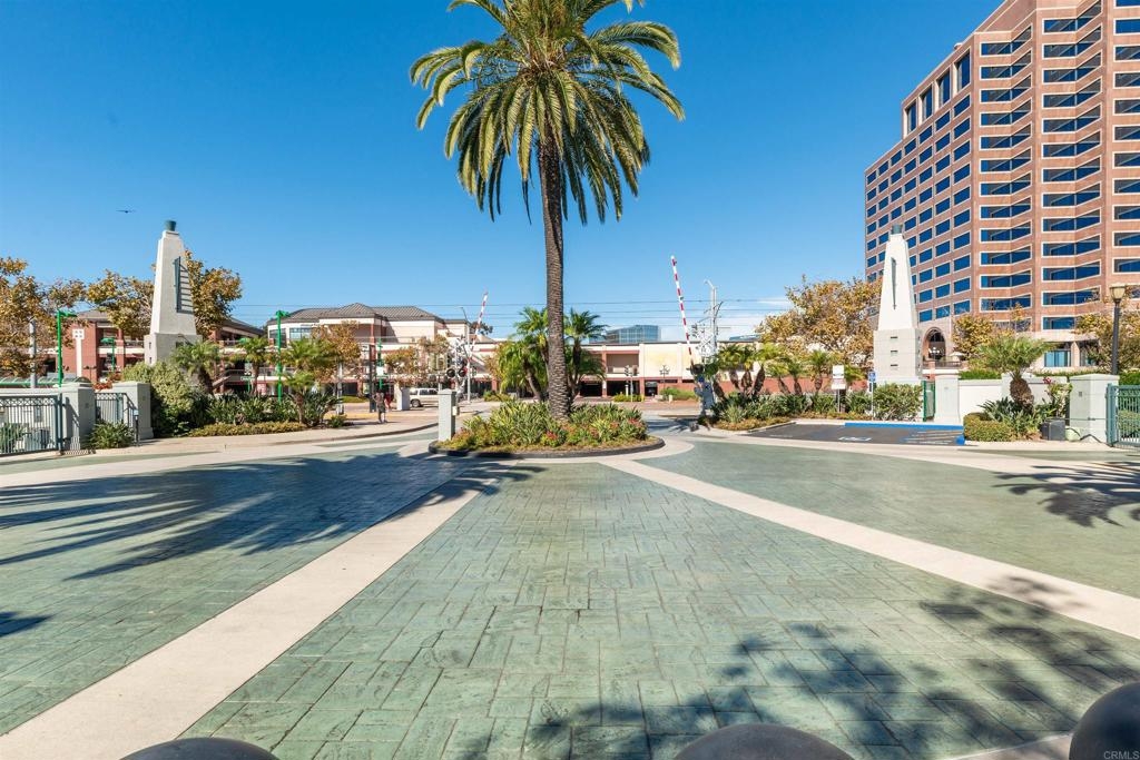 Rarely available South facing end unit overlooking the San Diego River! Peacefully situated in the gated community of Union Square in the heart of Mission Valley, this immaculate townhome offers privacy & comfortable sophistication w/ its refined open interior, contemporary design elements & the only Model 2 unit in the complex w/ private view balcony off the primary suite. Quintessential location: Steps to Hazard Center & shopping centers w/ a conveniently located Trolley stop & easy freeway access to the beaches, downtown, & airport all while maintaining privacy & exclusivity. Once inside, crown molding, luxury vinyl floors & new windows throughout work to create a captivating interior offering a spacious high-end feel. Bathed in natural light & accented w/ high ceilings, beautiful stained glass windows & an elegant electric fireplace, the spacious living room & adjacent dining room offers a perfect balance for casual lounging or hosting elevated gatherings alike while sliding glass doors work to unite the interior to the private outdoor patio. Remodeled kitchen equipped w/ granite counters, white shaker style cabinetry, instant hot water faucet, island & walk-in pantry. Mainl-level half BA. Continue upstairs w/ gorgeous wainscoting. Affording the timeless charm of sunset views, the primary suite features a large balcony, tray ceilings, plantation shutters, California closets and folding closet door to maximize space. Spa quality BA w/ dual sinks & walk-in shower. Secondary BR w/ crown molding & upgraded ensuite BA. Both BRs feature new ceiling fans. Attached 1 car garage w/ resurfaced floors. 1 assigned parking space. Backyard offers a perfect balance of beauty & function w/ irrigation system, dusk to dawn LED lighting & pergola. Welcome home!