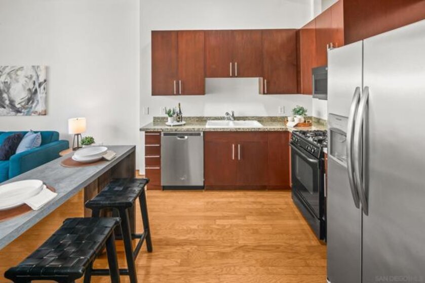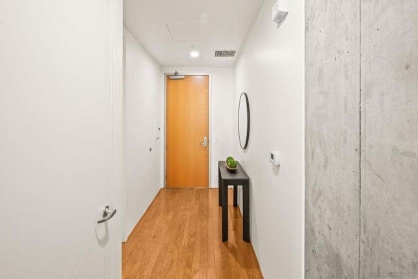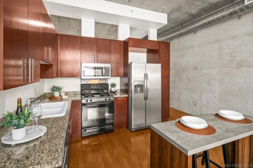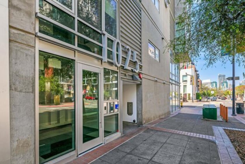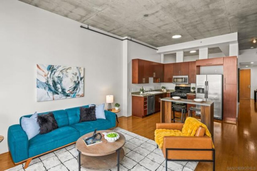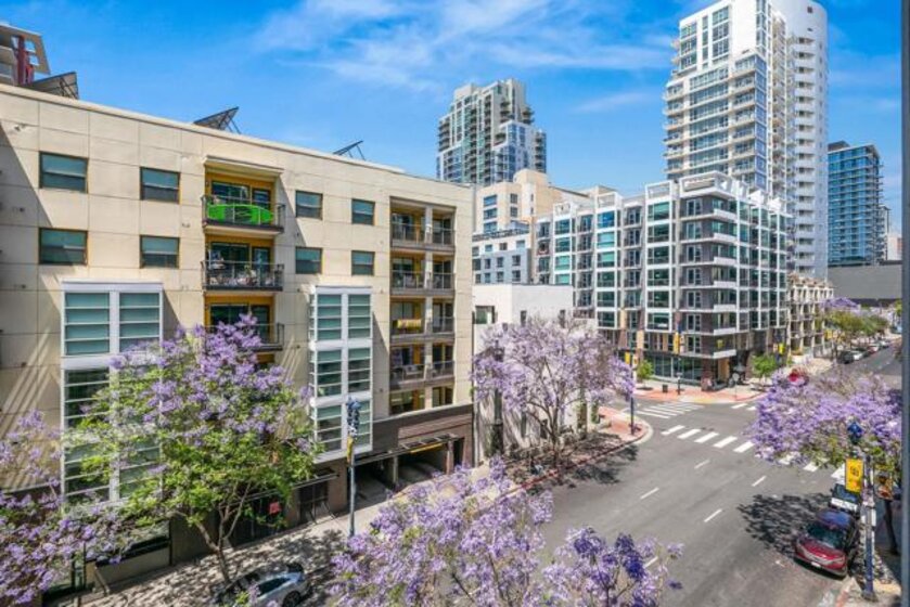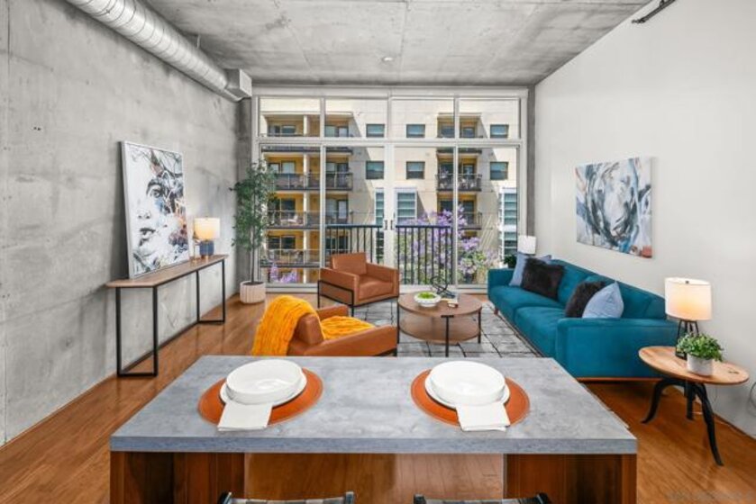 A modern loft with a distinctly urban point of view, this East Village residence pairs industrial texture with natural light and open spatial flow. Exposed 11-foot cement ceilings and walls create a striking architectural backdrop, while floor-to-ceiling windows bring in sunlight and showcase city skyline views. The open-concept floor plan flows seamlessly between the kitchen, dining, and living areas, offering both flexibility and ease. Dual sliding doors open to a Juliet balcony, creating a subtle indoor-outdoor connection and inviting fresh air into the space. A thoughtful blend of volume, light, and downtown energy defines this unique home. Located in a vibrant neighborhood, you'll have easy access to top-rated restaurants, trendy boutiques, and cultural hotspots. Plus, with off-street parking included, you can explore all that downtown has to offer without any hassle. Fahrenheit is one of Downtown San Diego's most notable condo buildings and a recipient of a prestigious design award from the American Institute of Architects. It's central location is just 2 blocks from PetCo Park, and a short walk to the Bayfront, Gaslamp Quarter and Little Italy. It has one of the lowest monthly HOA fees in the East Village.