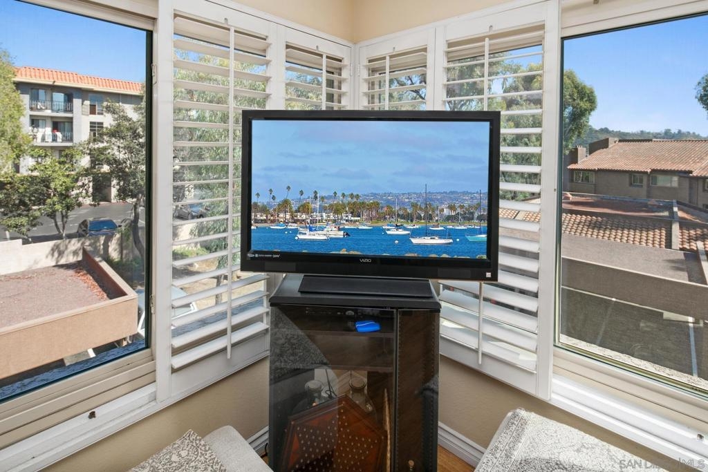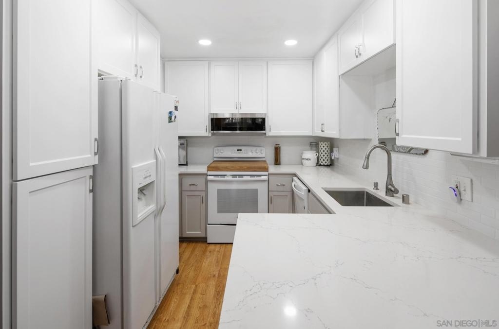 Experience elevated living in this stunning CORNER END unit at Mission Ridge, Mission Valley! This bright and airy 1 bed/1.5 bath condo features a spacious open floor plan and a fully upgraded kitchen with quartz countertops, custom cabinets and modern fixtures. The southeast-facing unit is bathed in natural light, with peaceful views and a tranquil setting. With new windows, elegant window shutters, and a newer air conditioning unit, this condo combines comfort and style. The generously sized bedroom includes an en-suite bath, while the convenience of in-unit washer/dryer hookups, along with an upgraded electrical panel, central A/C, and a prime location near elevators and mailboxes make daily living a breeze. Just steps from resort-style amenities including a pool, spa, racquetball court, 2 tennis courts and a gym, this home offers both luxury and convenience. Mission Ridge is a beautifully maintained complex offering a large pool, spa, dog park and dog stations, 2 tennis courts, saunas, racquetball court, gym, and clubhouse. The location is unbeatable with easy access to multiple freeways, the trolley and is only about a 15 minute drive to downtown San Diego, the airport, SeaWorld, the beaches and the bays. Enjoy being close to Snapdragon Stadium, SDSU, and the vibrant shopping and dining of Mission Valley. With easy commutes to practically anywhere in the city, this condo offers the ultimate blend of convenience and leisure. The HOA covers water, trash, and includes resurfaced streets, new exterior painting and secure Amazon delivery cubbies in the Lobbies. This unit has 1 parking space with extra (approved) storage cabinets that many units do not, another parking space may be possibly acquired through the HOA if available. Don’t miss out on this prime opportunity for comfortable, convenient living in one of the best locations in the complex. All offers considered.