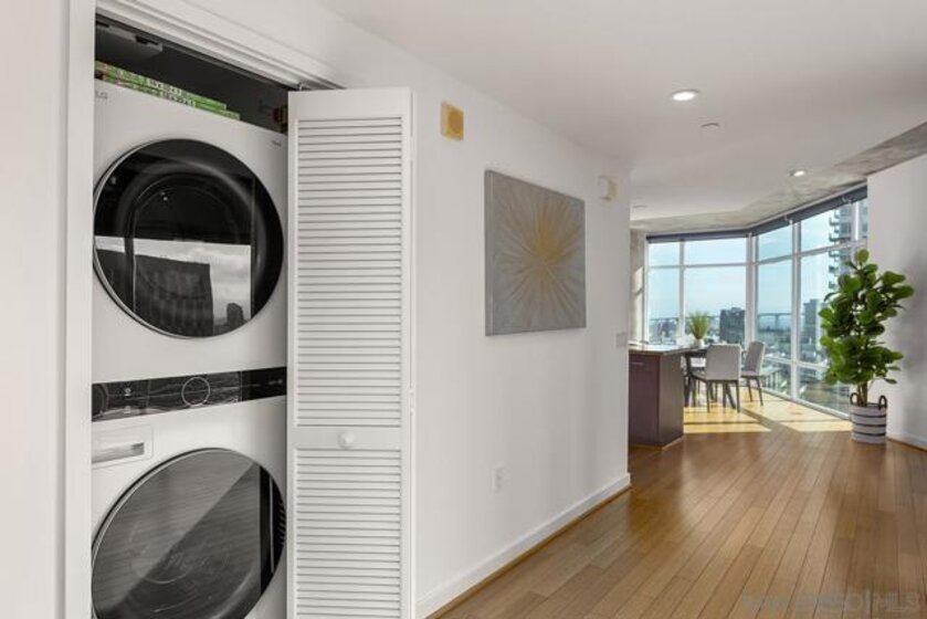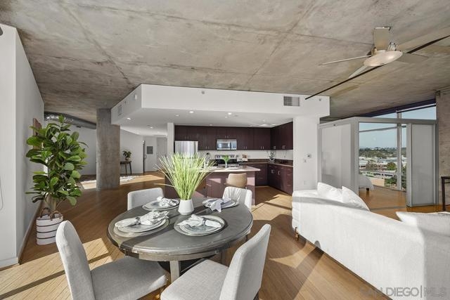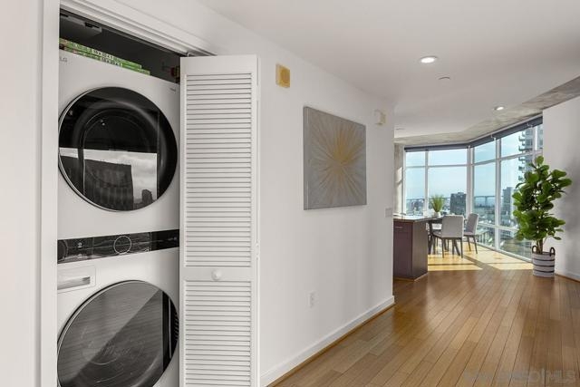 Welcome to the prime locale in Smart Corner, “The Point” floorplan, where walls of glass showcase panoramic views spanning Point Loma, the Pacific Ocean, San Diego Bay, and the Coronado Bridge from this premier south-facing residence. Perfectly positioned in vibrant East Village, this spacious 1-bedroom plus bonus area (1,422 sq. ft.) blends modern style with loft-inspired character, complete with original bamboo flooring, exposed concrete accents, and ductwork. You’ll love the open-concept layout flowing from the kitchen through the dining and living areas, all opening to a huge balcony, a true standout feature ideal for entertaining, dining al fresco, or simply relaxing while soaking in the sweeping skyline and coastal vistas. The kitchen features stainless appliances, recessed lighting, and an eat-at bar for casual dining. Additional highlights include an upgraded washer and dryer, two excellent, separate parking spaces (rare P1 and a P3). Whether you’re seeking a stylish city residence, a smart investment, or a flexible live/workspace, this home offers unmatched views with a central Downtown location! VA approved. Smart Corner is an all-encompassing hub of work, play, shop, and live! It is conveniently located near the 163 freeway, I-5, Highway 94, Petco Park, the Gaslamp Quarter, San Diego City College, and Balboa Park. A trolley station located below the development ensures Smart Corner has all an urban dweller could want. Amenities include 20th floor roof-top sun deck with forever views of the city skyline, 10-person hot tub, barbecue area, wet bar, 2nd floor Fitness Center, PLUS on-site management, and security.