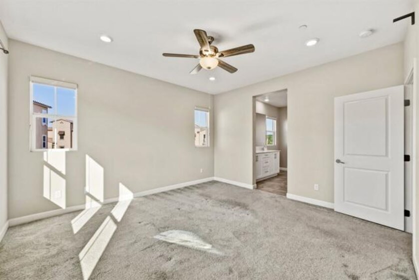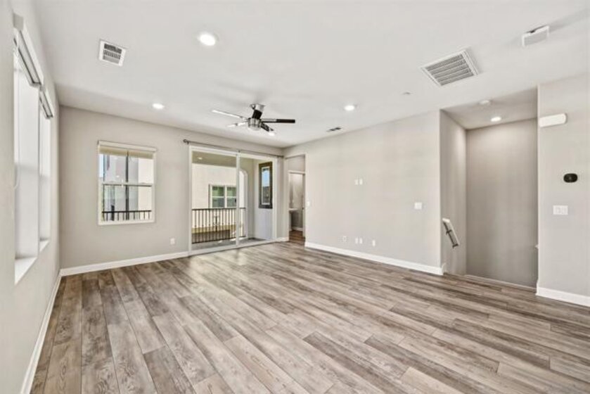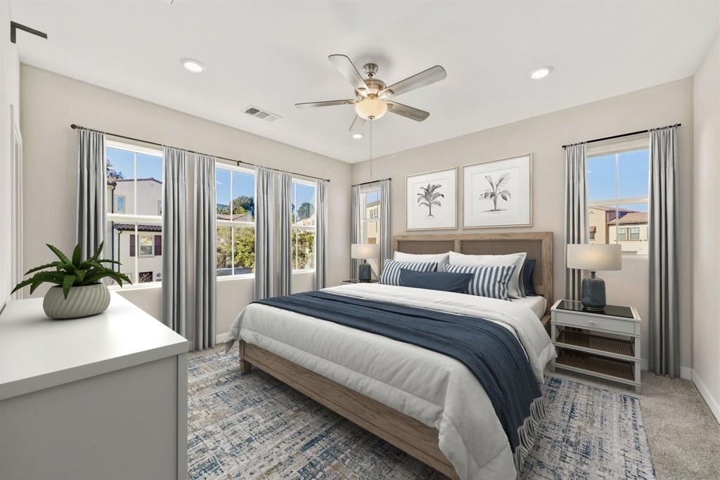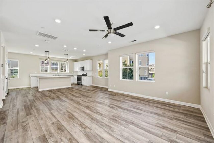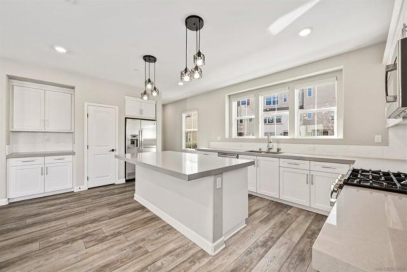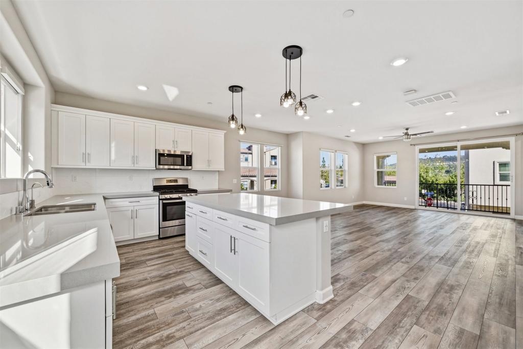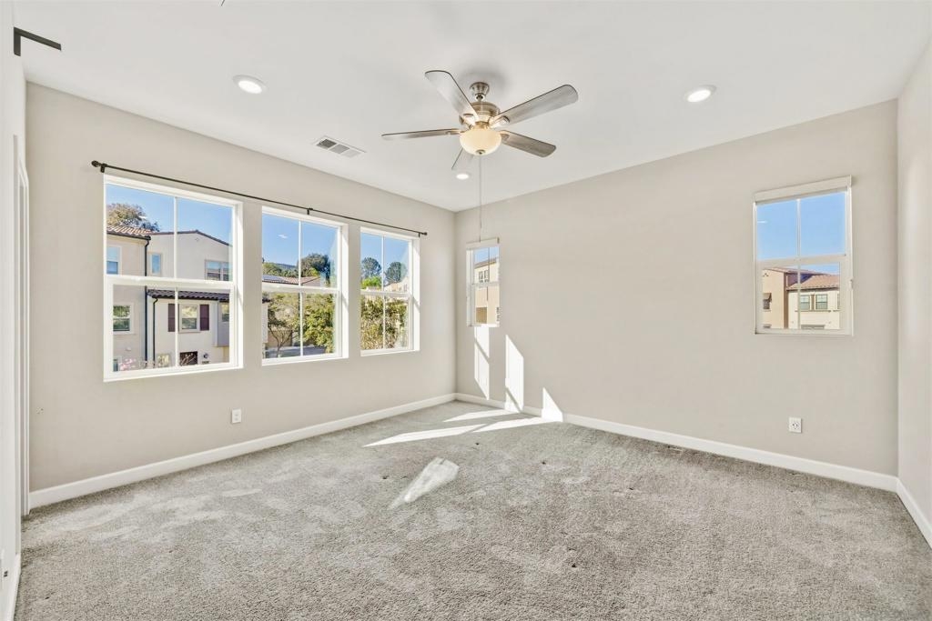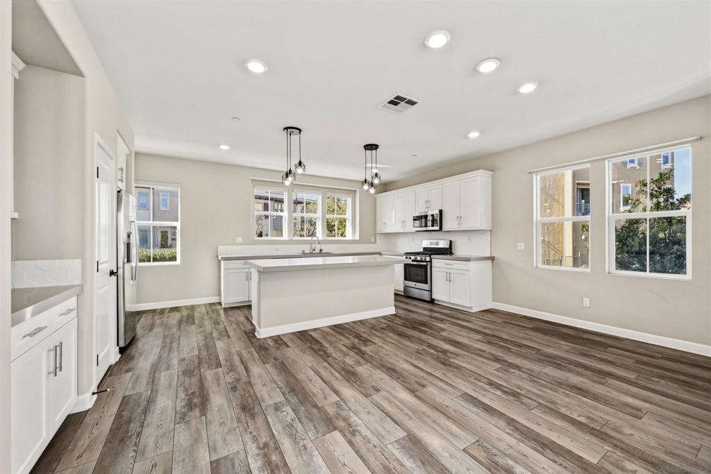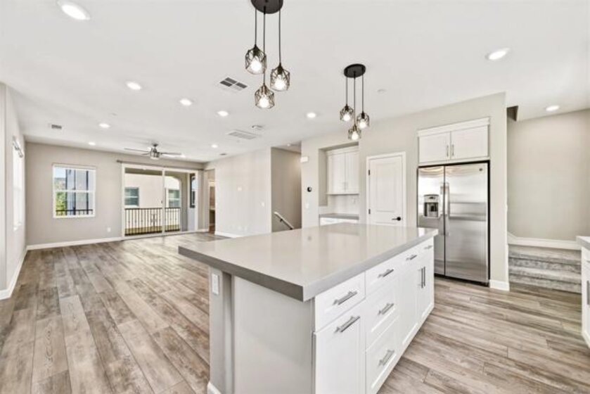 Welcome to this beautifully maintained 2020-built end-unit townhome located in the highly desirable Promenade at Pacific Village community. Designed for modern living, this home features 9-foot ceilings and a bright open-concept floor plan anchored by a gourmet kitchen boasting sleek quartz countertops, a large island, a pantry closet, and generous counter space—perfect for both relaxing and entertaining. This tech-forward residence is "Wi-Fi Certified" with a whole-home mesh system for no-drop-off connectivity and comes equipped with a Schlage smart lock and Ring monitoring for ultimate security. Efficiency is at the forefront with a Solar Power Purchase Agreement (PPA), an ecobee app-controlled thermostat, and a Rinnai tankless water heater also managed via app. For added convenience, the home includes a dedicated laundry room and a whole-home water softener system. As an end unit, it enjoys additional privacy and natural light throughout the living spaces. Residents benefit from resort-style amenities, including a sparkling pool, playground, BBQ areas, dog parks, and scenic trails surrounding the community. Ideally located with no Mello Roos, this home offers easy access to major freeways and shopping while being served by the top-rated Poway Unified School District. This is an excellent opportunity to enjoy modern, connected living in one of the area's most sought-after communities.