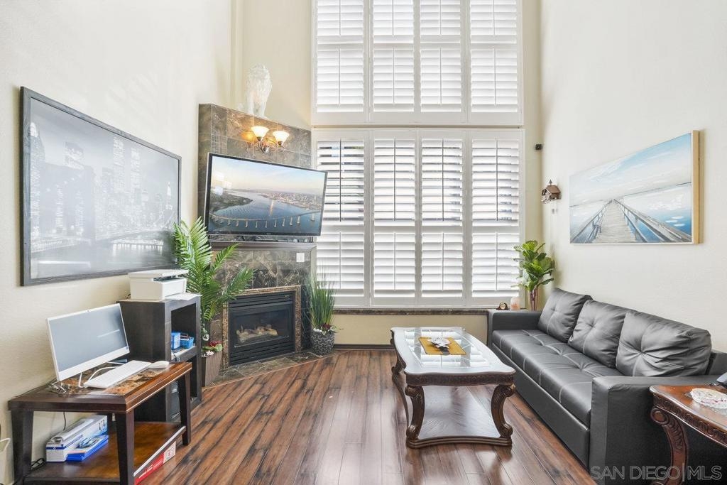 Experience the best of downtown living in this two-story loft, ideally located in San Diego’s sought-after Columbia District—just steps from Little Italy, the waterfront, and the city’s top dining and entertainment destinations. This bright and spacious 1-bedroom, 1.5-bath home offers a spacious two-story floorplan with nearly 1,000 square feet of living space. Soaring 18-foot ceilings and floor-to-ceiling windows create a sense of openness and provide ample natural light. On the main level, the large kitchen has ample cabinet space and is open to the spacious living room, which includes a gas fireplace. Also, on the main level, there is a half-bath. Upstairs, a generous loft-style bedroom offers privacy and includes a full bathroom. The home is located on the first floor, and the entry is on the interior of the building, giving you an additional level of privacy and convenience. This home is available fully furnished, making it a turnkey option for a primary residence, second home, or investment property. Located in the TREO community, you’ll enjoy resort-style amenities, including a pool, spa, BBQ area, community room, fitness center, front desk attendant, and 24-hour security—all with reasonable HOA dues. Just two blocks from Waterfront Park and minutes from Petco Park and the Gaslamp Quarter, this location truly has it all. Don’t miss your chance to own a rare urban gem in one of San Diego’s most vibrant neighborhoods!