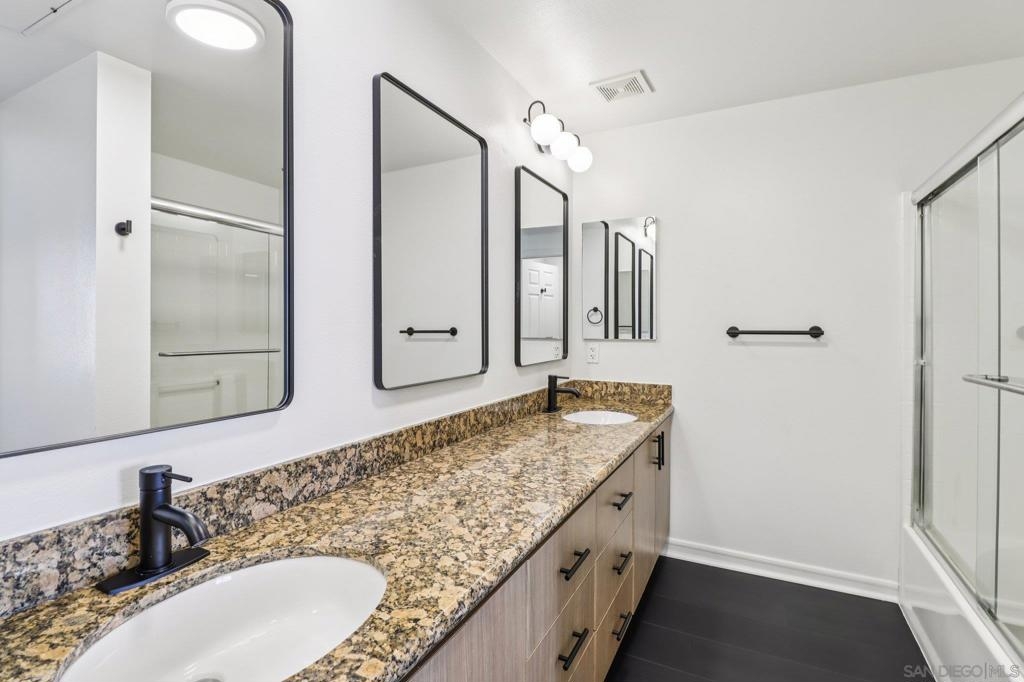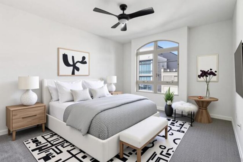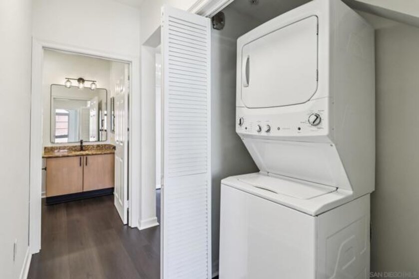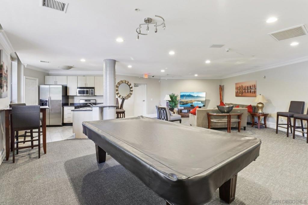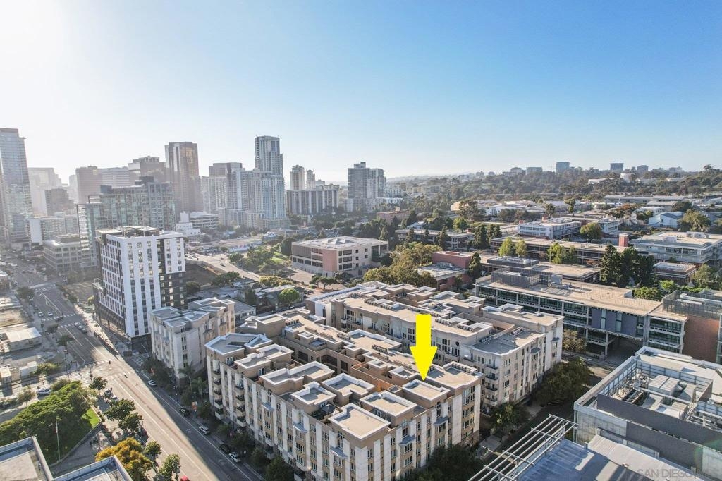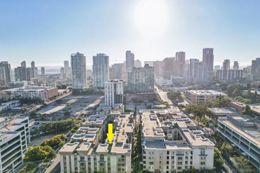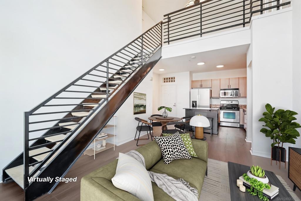 Spacious and light-filled, this nearly 1,300 sq. ft. top-floor condo impresses with vaulted ceilings, clerestory windows, and an open floor plan designed for modern living. The living room features a cozy fireplace and flows seamlessly to the dining area and kitchen—ideal for entertaining. A versatile bonus loft offers space for a home office, family room, or guest suite, and opens to a rare oversized private balcony of nearly 300 sq. ft., perfect for outdoor living. The split-bedroom layout provides flexibility, each bedroom with generous walk-in closets. The primary suite boasts a large bath with dual sinks and plenty of counter space. Fresh paint, new flooring, in-unit laundry with storage, and two secure tandem parking spaces add convenience. Located in a gated, well-maintained community with lush landscaping, water features, a fitness center, rec room, and on-site management, this home offers both comfort and peace of mind. Just minutes from Balboa Park, East Village, Gaslamp, Little Italy, and more, with easy freeway and transit access, this is urban San Diego living at its best!