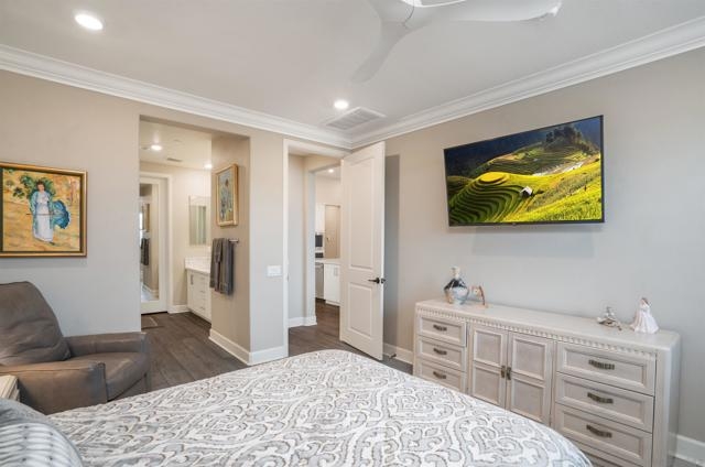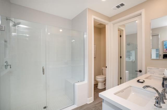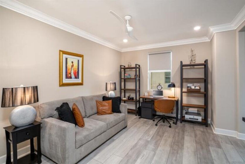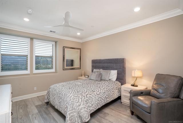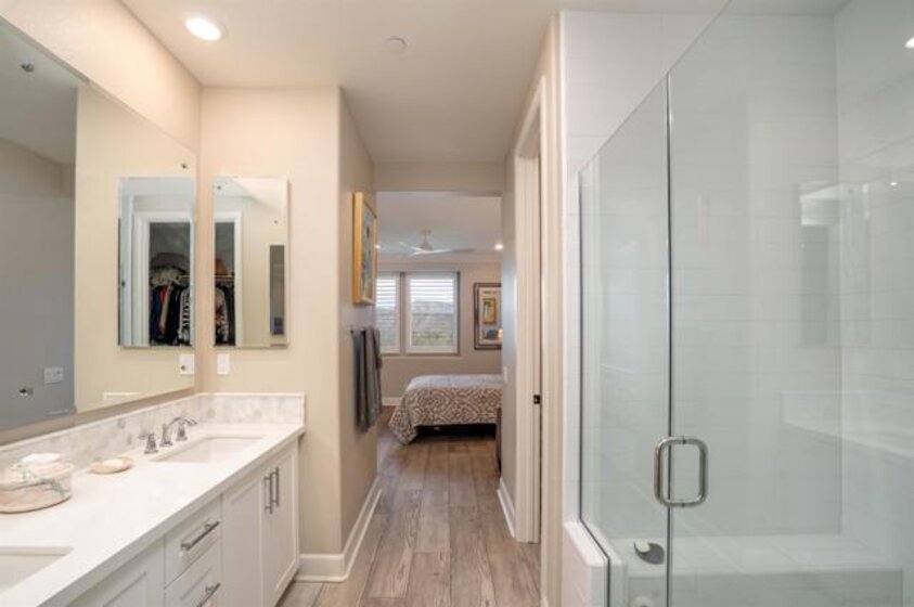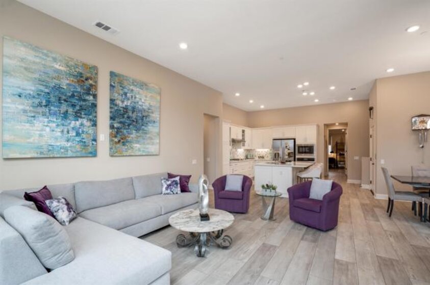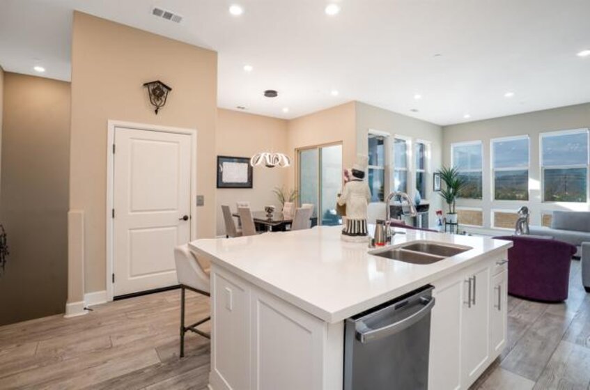 Beautiful dual-suite Avante Plan 3 home located in the 55+ gated community of Del Sur. This 2019-built residence offers a bright, open-concept layout with high ceilings, wide-plank upgraded flooring, recessed lighting, and custom shutters throughout. The gourmet kitchen features quartz countertops, stainless steel appliances, modern backsplash, abundant cabinetry, and a large center island overlooking the dining and living areas. Both bedrooms are private suites with walk-in closets and spa-inspired bathrooms. Additional highlights include a private in-home elevator for effortless access, a finished 2-car garage, spacious laundry room, and inviting outdoor spaces including a balcony and patio. Avante residents enjoy exclusive access to a resort-style clubhouse, pool, spa, fitness center, lounge, game room, BBQ area, and fire pits. As part of Del Sur, homeowners also have access to 11 community pools, 14 parks, walking trails, and nearby shopping and dining at the Del Sur Town Center. This home offers an exceptional blend of luxury, convenience, and 55+ lifestyle living.