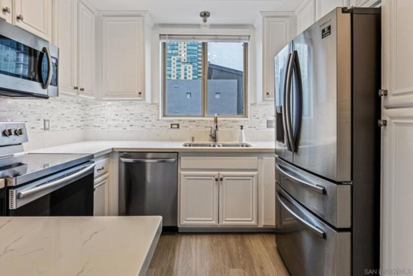 Welcome to urban living at its best in the heart of downtown San Diego. This beautifully updated end-unit condo at 235 Market St, Unit 301 is located in the highly desirable Marina District, offering an unbeatable walk score to the Gaslamp Quarter, Seaport Village, the Embarcadero, Petco Park, the Convention Center, parks, dining, entertainment, shopping, and freeway access. Recently renovated, this bright and open home features new flooring, fresh paint, upgraded lighting, a new dishwasher, modern backsplash, stainless steel appliances, and a Ring doorbell. Natural light fills the living area, which opens to one of two private balconies—perfect for morning coffee, unwinding in the evening, or simply enjoying the atmosphere of downtown living. A second balcony off the primary bedroom offers an additional outdoor retreat. The sleek kitchen showcases quartz countertops, brushed-nickel finishes, stainless steel appliances, and a window above the sink that brings in extra light. Both bedrooms are generously sized. The primary bedroom includes a walk-in closet and an en-suite bathroom with dual sinks, updated finishes, and LVP flooring. The guest bathroom offers excellent storage and a spacious layout. A newer A/C unit provides added comfort year-round. The community features secure underground parking with two assigned spaces, a well-maintained courtyard, fitness center, rooftop deck, and an impressive lobby. With only 57 units in the building, residents enjoy a boutique, private feel while still being steps away from the best that downtown San Diego has to offer!!!