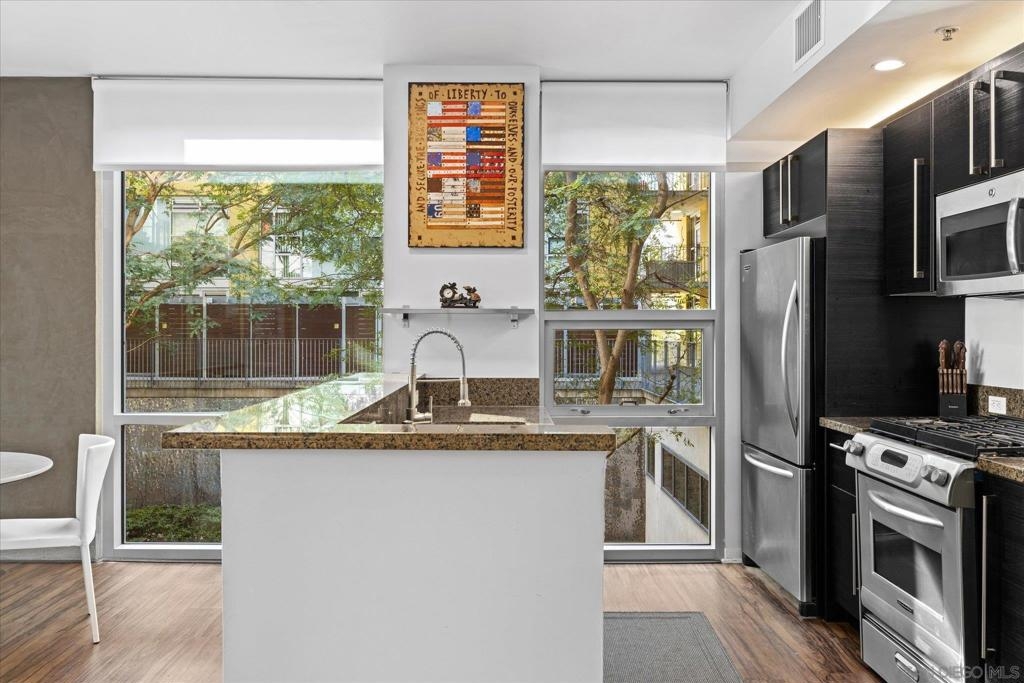 Get ready to upgrade your lifestyle here at the ICON high rise located in the heart of downtown San Diego. Having a walk score of 98/100, everything from restaurants, coffee shops, bars, shopping, grocery stores and of course Petco Park are all just a few steps away. Welcome to one of the largest one-bedroom, plus office space, floors plans in East Village, this SE corner residence gets an abundance of natural light and has lovely tree top views. This is one of the quietest units in all of downtown located on the inner sanctuary courtyard with eye catching sculptors and a radiating wall of glistening reflective wind elements to enhance your views. There is a separate area for a home office and an extra half bath for your guests. Bedroom en-suite has dual vanities and a walk-in closet. The expansive floor plan is flooded with natural light, thanks to the floor-to-ceiling windows that highlight the beauty of the courtyard. Enjoy a peaceful and private ambiance, with a thoughtful design that maximizes comfort and style. Ideal for those who appreciate a tranquil setting with easy access to city living, this condo truly feels like a sanctuary. Continued in supplement below... ICON has the best condo rooftop in all of downtown San Diego, named the ICON Skybox. This roof top has the most amazing views of the bay and downtown skyline. This amazing terrace has lots of seating, BBQs, a large screen TV and heaters. There is even a tiered seating section looking directly into Petco Park to watch baseball games and other events such as concerts etc. Other amenities include a large Fitness Center, Community Lounge with full kitchen, business center, TV, and workspace, Movie Theater, shared EV charger, 24/7 front desk staff and an onsite property manager. Don’t miss the opportunity to make this peaceful oasis your own!