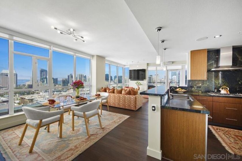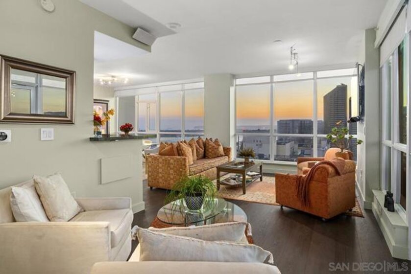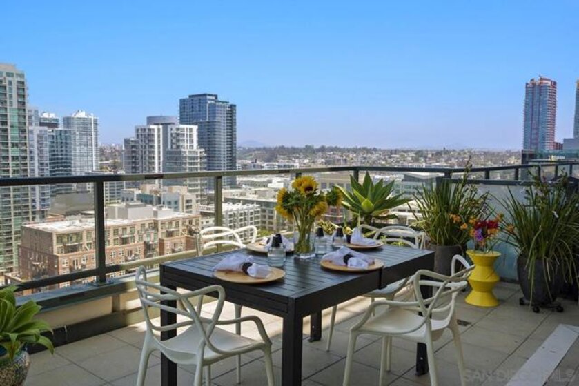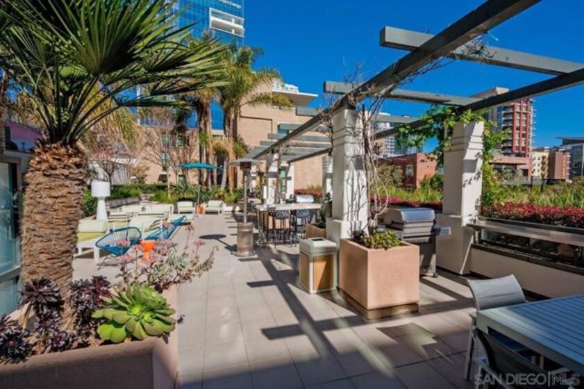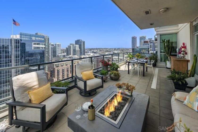 The epitome of Downtown living! Footsteps to the convention center, Gaslamp Quarter, restaurants, and Petco Park is realized in this extraordinary northwest corner penthouse series residence on the 21st floor of The Legend with a nearly 400 SQ FT ROOFTOP TERRACE! Stunning views span to the bay, ocean, and city skyline. Boasting a highly desirable floor plan with 2 separated bedrooms for enhanced privacy, PLUS a flex space, perfect for use a den, office, or media room. 2 side-by-side parking spaces plus a motorcycle space (owners have parked 3 cars in the spaces), 1 storage room and 1 storage cage! Complete with recently installed wood floors, upgraded lighting, ceiling fans, pre-wired for surround sound, and a stainless/granite kitchen with Sub-Zero refrigerator, you will love where you live. Quite possibly the best unit in the entire building with the combination of the views and roof deck – enjoy Petco Park events from ‘Club Legend’ but then retreat to the quietest corner of the building for some rest and relaxation! Dynamic views are framed by expansive windows in this fabulous residence at the Legend. An entertainer’s dream, you will love the space and functionality offered in this condo. Delight in a spacious kitchen with stainless steel appliances, granite counters including an eat-at bar, a convenient pantry closet, Sub-Zero refrigerator, and desirable gas range. Retreat to the primary bedroom boasting a generous walk-in closet with custom organizers. The primary en-suite bath features a dual vanity with upgraded granite counters, a walk-in shower, plus a Toto Washlet. Complete with additional storage and 2 side-by-side parking spaces plus a 3rd space for a motorcycle, this is an idyllic Downtown dwelling. The Legend is the only residential high-rise to be built inside the gates of our Major League Ballpark and the only residential tower to be built on the three-acre Park at the Park! This iconic building overlooking the Padres Ballpark will be treasured for generations with historic detailing preserved by Bosa to create a world-class residential tower. Enjoy a premium central location only steps away from the Gaslamp Quarter and Marina District for convenient access to endless shopping and dining options. The Legend’s amenities include a second-floor rooftop deck looking out over Park at the Park complete with pool and spa, a fully-equipped fitness room, rooftop garden, barbecue area, steam, sauna and changing rooms. Your guests and clients will also love 'Club Legend' located on the seventh floor, complete with a huge deck overlooking the ballpark and an outdoor fireplace lounge. An elegant courtyard entrance, creating a private enclave approaching the lobby provides a fitting and impressive sense of arrival for residents and their guests. The concierge service and 24-hour security add a sense of belonging while an ambiance of refinement and contemporary sophistication is apparent throughout the building.Builder's brochure indicated 1587 sqft, assessor's record indicates 1439 sqft.