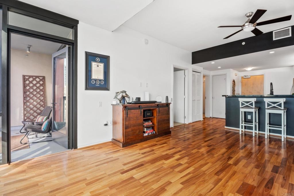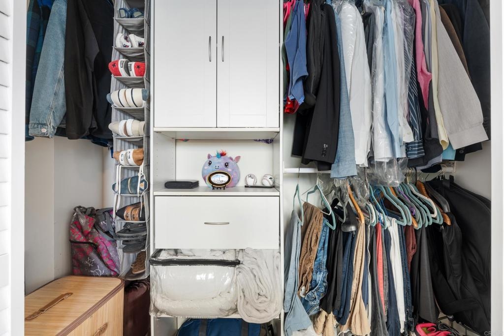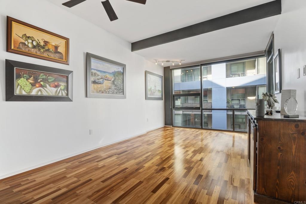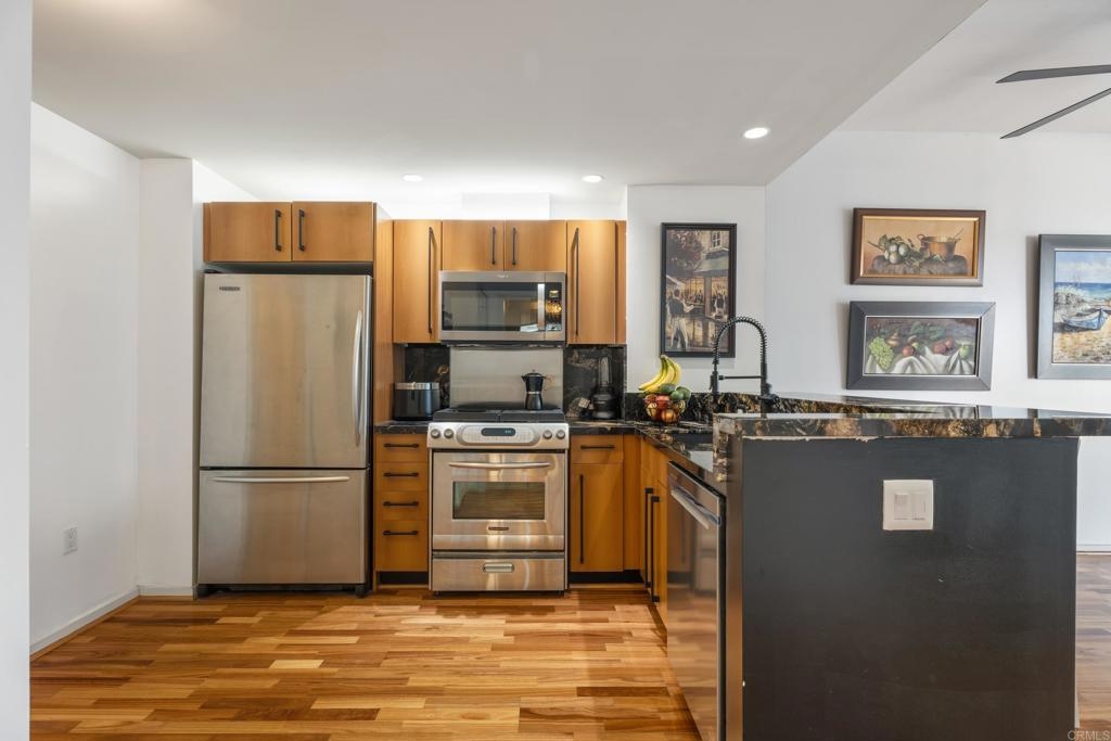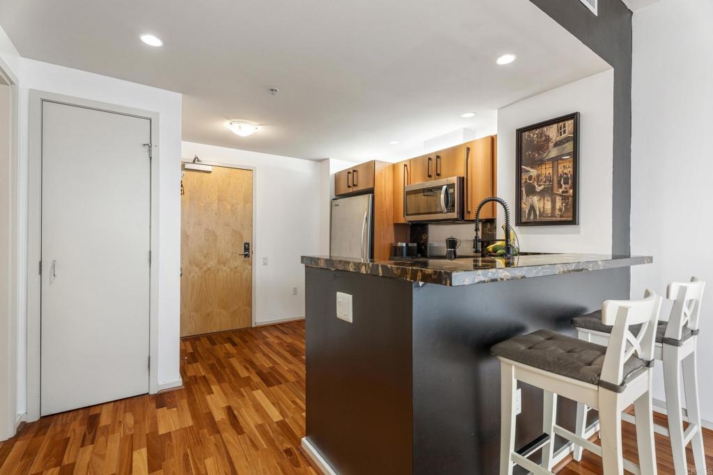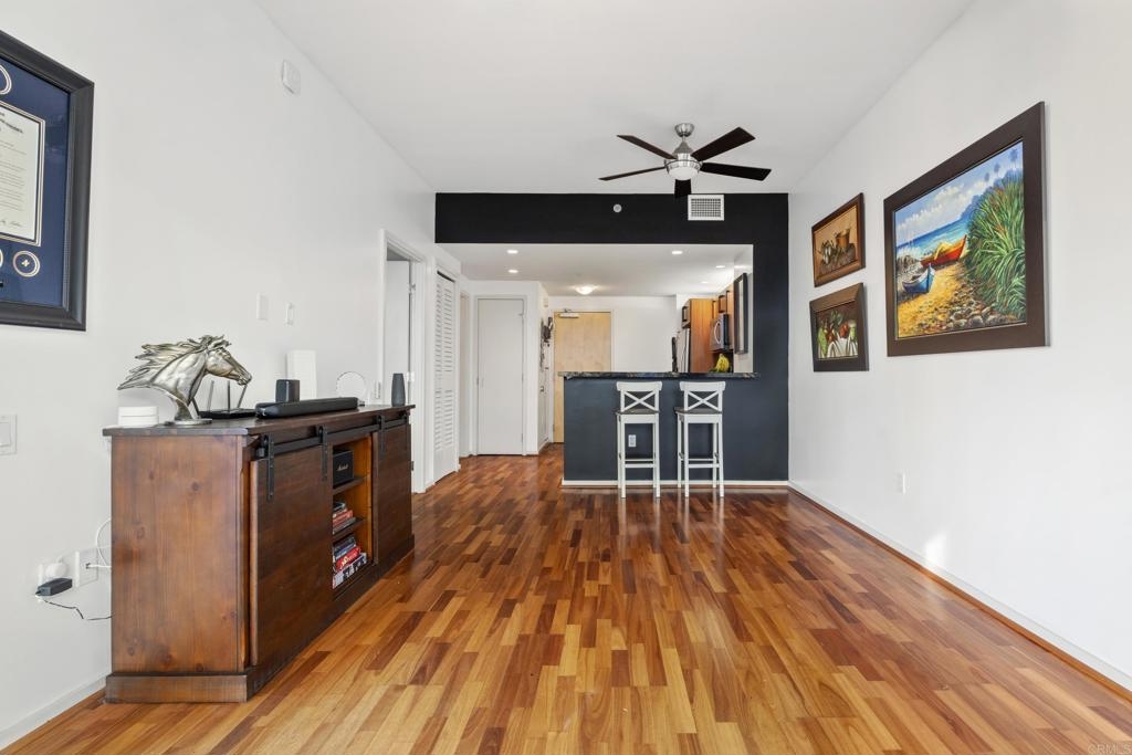 Downtown San Diego living! Ideally located in the popular Icon Building in East Village, enjoy the views/amenities in your new home. Super convenient, secured with an underground, permitted parking space right off street level. As you enter this nicely maintained one bedroom, one full bath condo, enjoy the open and bright spaciousness of the unit, with a wonderful kitchen, complete with refrigerator, microwave, dishwasher, gas stove and oven (convection too), pantry room, laundry closet with washer and dryer that all convey. Some amenities of the Icon building are a recently renovated lounge area with a full kitchen (available to reserve/rent) and a rooftop skybox with BBQs overlooking Petco Park. Enjoy the 1700 square foot gym and common areas including Community theater room with raised seating, featuring 135 inch HD screen, WiFi, Direct TV, Cox Cable, and Netflix capabilities. The renowned Icon Building has 24-hr front desk security and secure mail and package facilities. There are tons of restaurants, bars, and convenience stores just a short walk away. There is an Albertsons and a Ralphs supermarket about 10 minutes away on foot, and a Grocery Outlet just 2 minutes from your door. The Gaslamp Quarter is only a 10-minute walk, so there’s no need to drive or Uber to your favorite spots. The amenities at Icon are amazing! There’s a fully equipped gym, a common area with a full-size kitchen, TVs, couches, and tables for reunions, conferences, or meetings. The views are incredible—you can see the San Diego Harbor, Mexico, Coronado, Point Loma, and even PETCO Park. Watching Padres games or concerts from the rooftop is a huge bonus! Security here is top-notch, with roving watch standers checking the whole complex (and its surroundings) every 30 minutes. Cleaning staff are constantly maintaining all areas of the building, keeping everything spotless. The condo has a partial view of 10th Avenue, and the balcony is perfect for enjoying a quiet Sunday morning with a cup of coffee. You never had to turn on the A/C or heater, which keeps the electricity bill under $100 a month. The HOA fees cover water, gas, trash, and high-speed Wi-Fi (Google Fiber Webpass). The thick, soundproof windows also block out any noise from games, concerts, or the streets. See it to believe it!