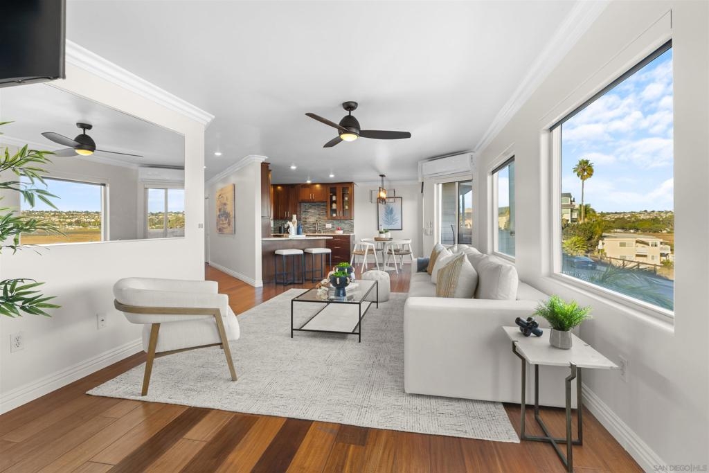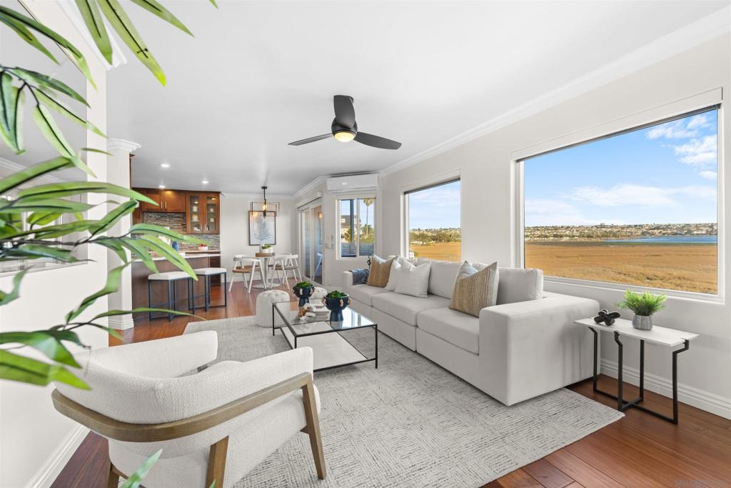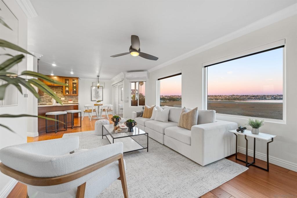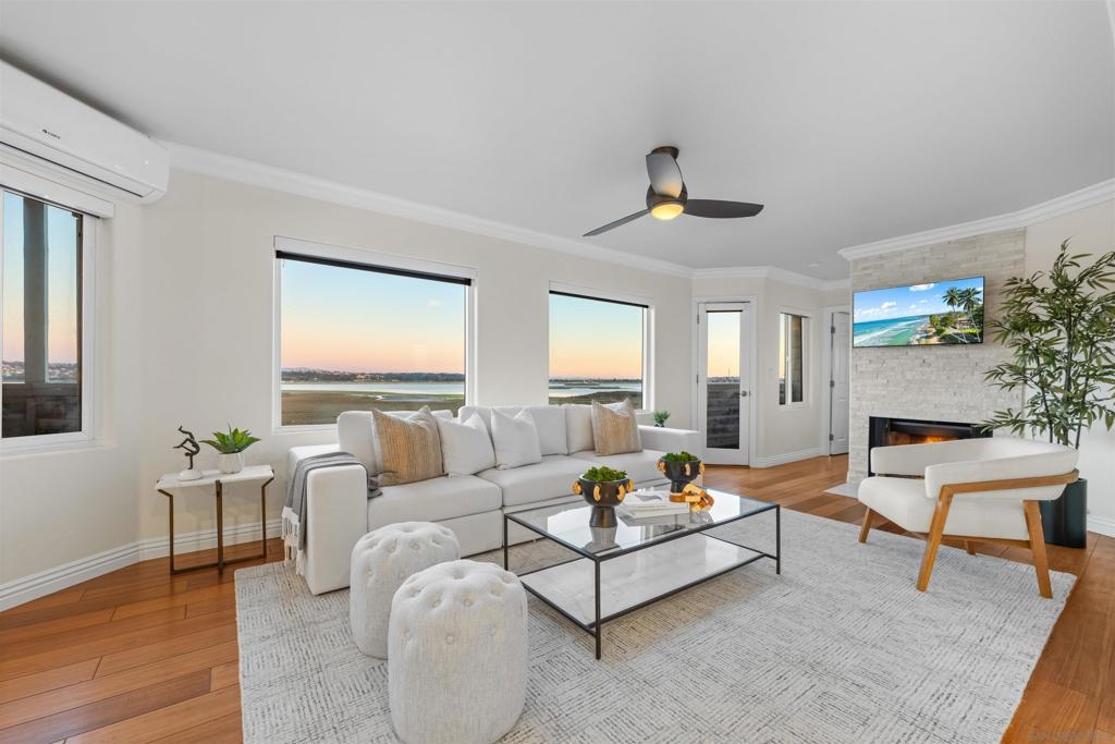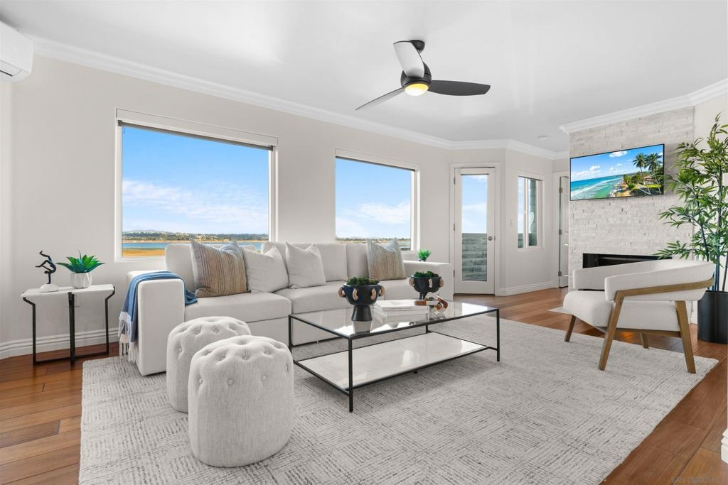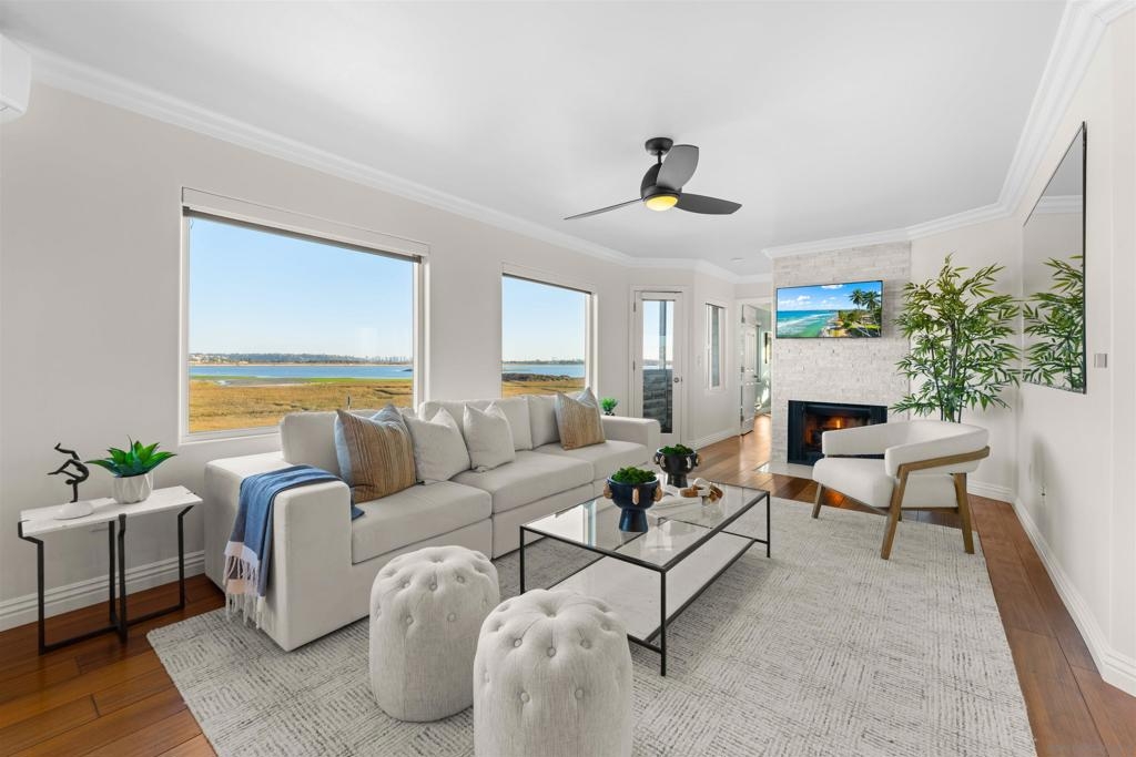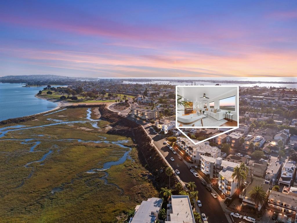 Turn-key, Remodeled, and jaw-dropping Panoramic Views of Mission Bay and the San Diego skyline! Wake up to the stunning sunrise over Mission Bay and wildlife estuary, or enjoy the nightly SeaWorld fireworks and dazzling city lights!! This 3BR 2BA corner-unit spans over 1,369 sq ft, with an open floor-plan flowing from the living room, family room, dining area, and open kitchen. 2 water-front balconies provide ample outdoor living and serene relaxation space. Other luxurious features include: remote electric blinds, gas fireplace, high end showers, 2 walk-in closets, 2 garaged parking spaces, full sized washer and dryer (in-unit)! Only 10 units in this fully gated complex, offering a quaint, and boutique community feel! This remarkable home is a testament to stylish and warm water-front living in one of California's most sought-after locations.