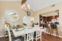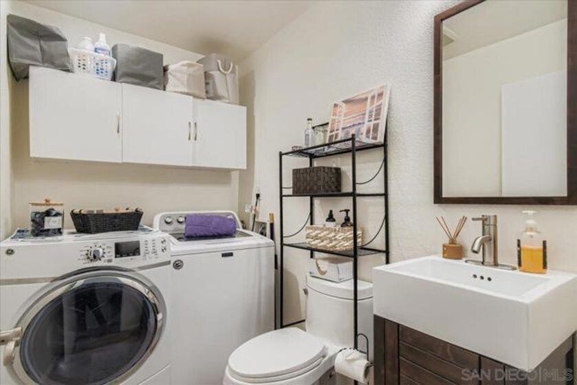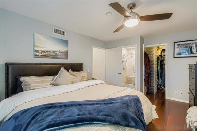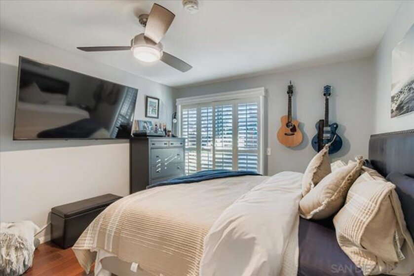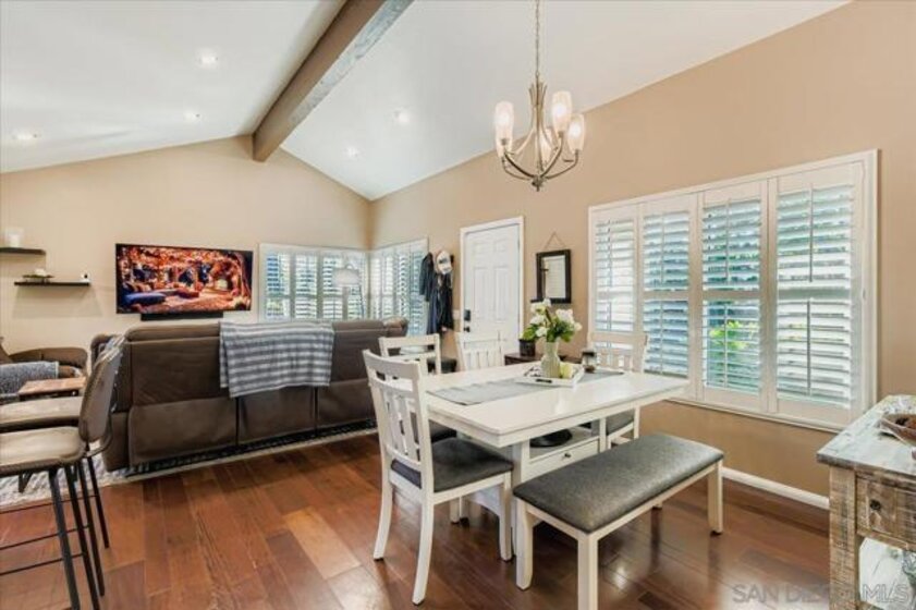 Luxurious corner townhome in the highly sought-after Tierrasanta community. This stunning residence offers vaulted ceilings, an expansive open-concept floor plan that lives like a detached home, and a versatile bonus den/family room that can easily be converted into a fourth bedroom. The entry welcomes you with dramatic high ceilings accented by a striking beam detail, flowing into the bright and modern dining and living room combination. The main level has been beautifully upgraded with cherry hardwood floors and custom shutters throughout. The gourmet kitchen is a showstopper, featuring rich cherry cabinetry, granite countertops, stainless steel appliances, a wine fridge, and French doors that open to the private patio. An additional bar area provides the perfect casual dining space. The spacious primary suite is conveniently located on first floor.