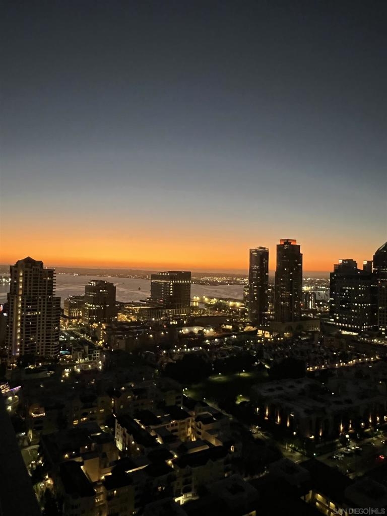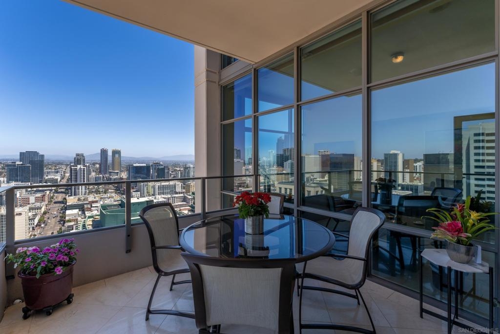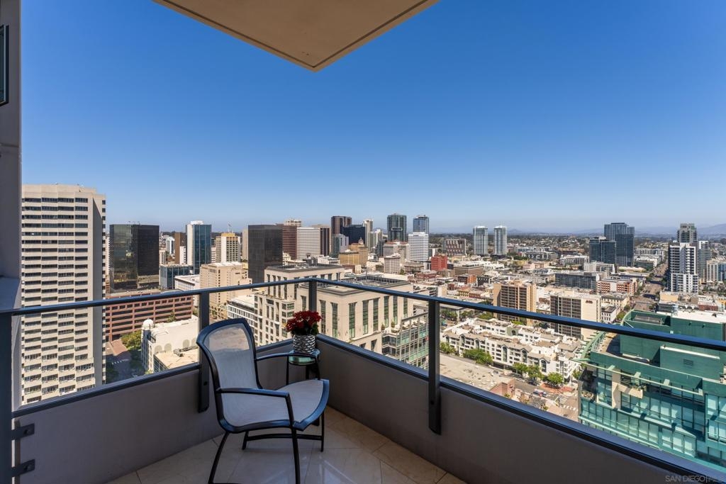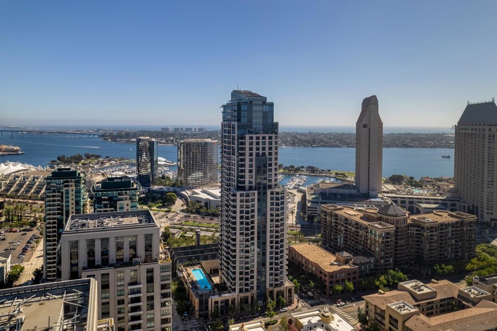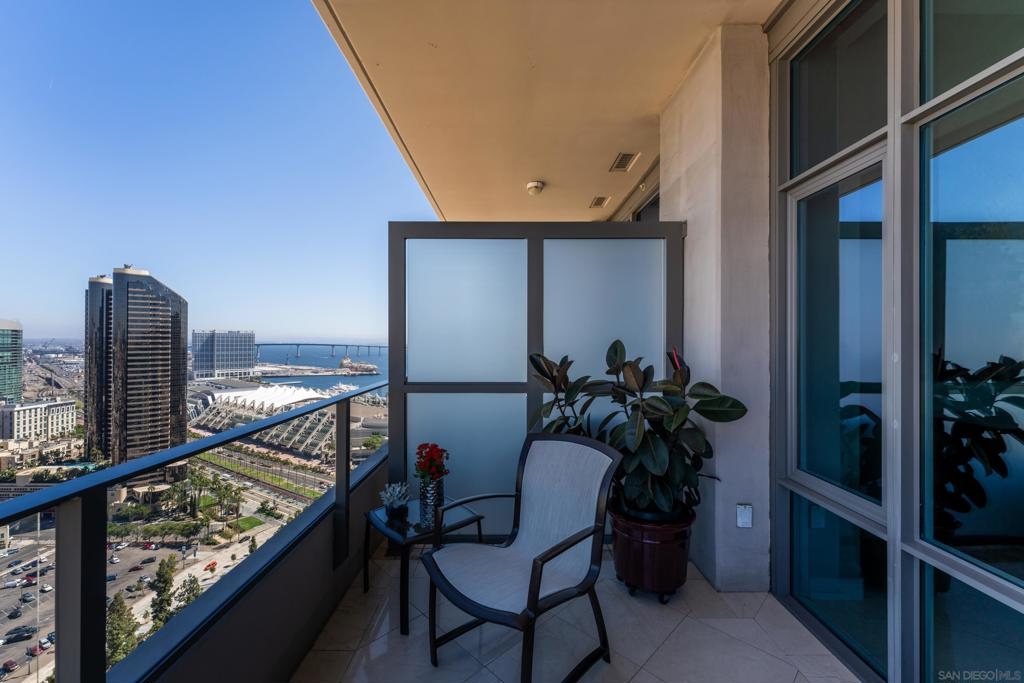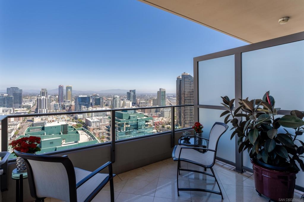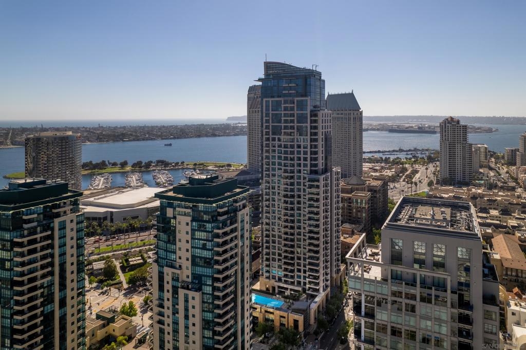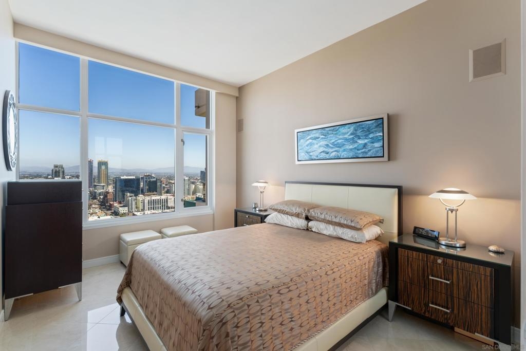 Over 300 feet above the city, this unit has incredible unobstructed 270-degree views from North San Diego Bay across the Downtown skyline to South Bay and even Mexico. Redesigned floor plan offers 10 Ft ceilings, THREE outdoor areas, 2 Bedrooms plus large office/den w/custom desk/AV area, 2 Baths, & 2 deeded parking spaces and storage area. Has motorized shades, artwork lighting, custom closets w/backing, audio speakers throughout and many more upgrades. Only 2 other units on the floor. One of the best locations and luxury bldgs. DT. SD living at it's finest! Pictures don't do it justice- must see in person!