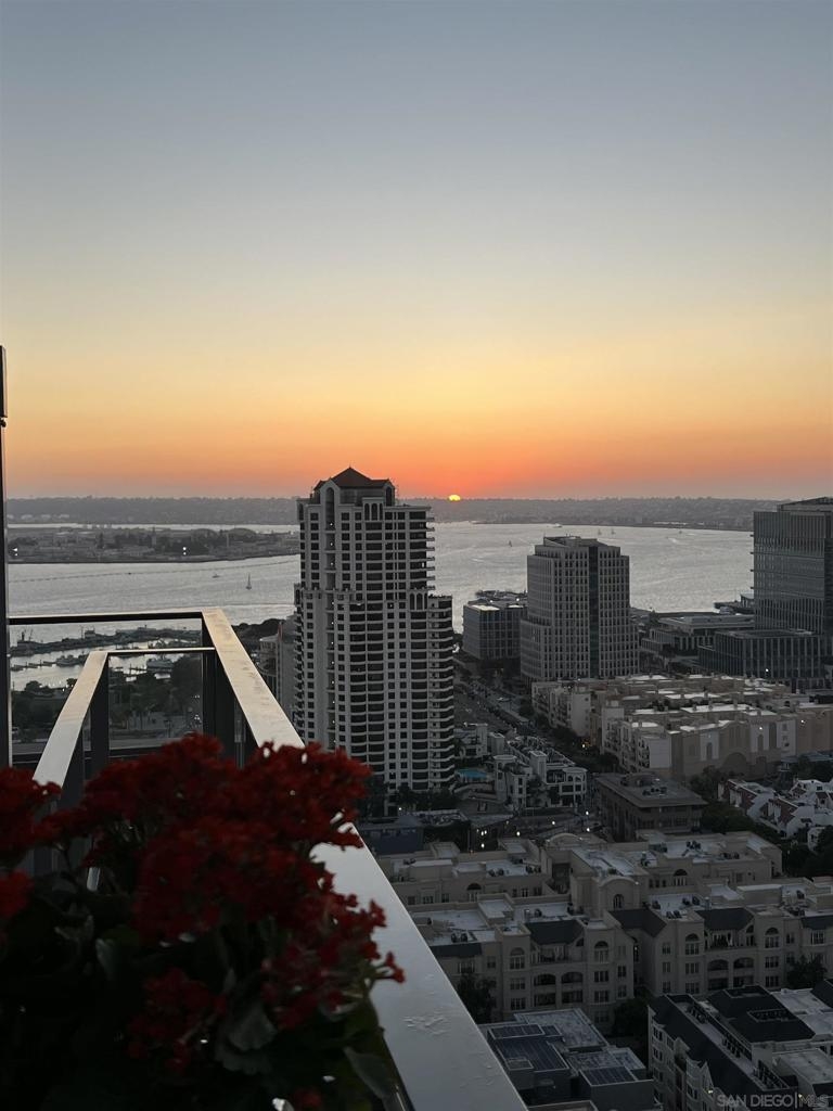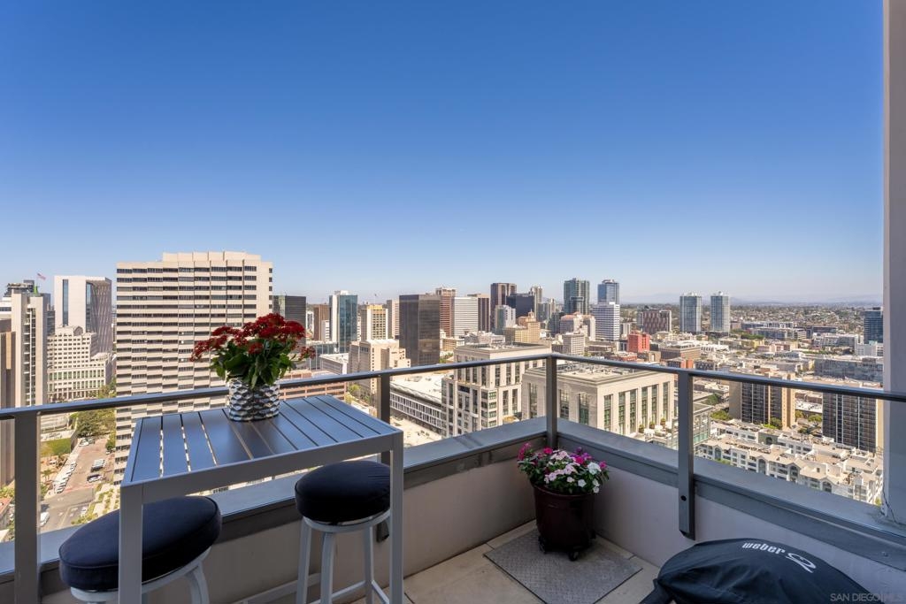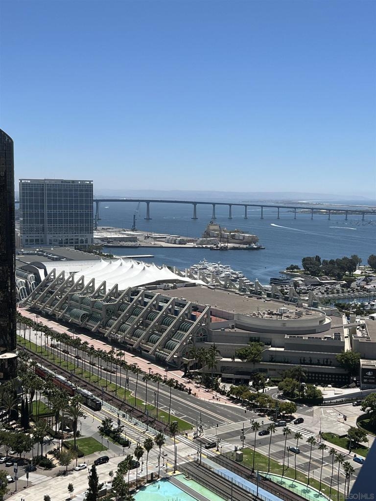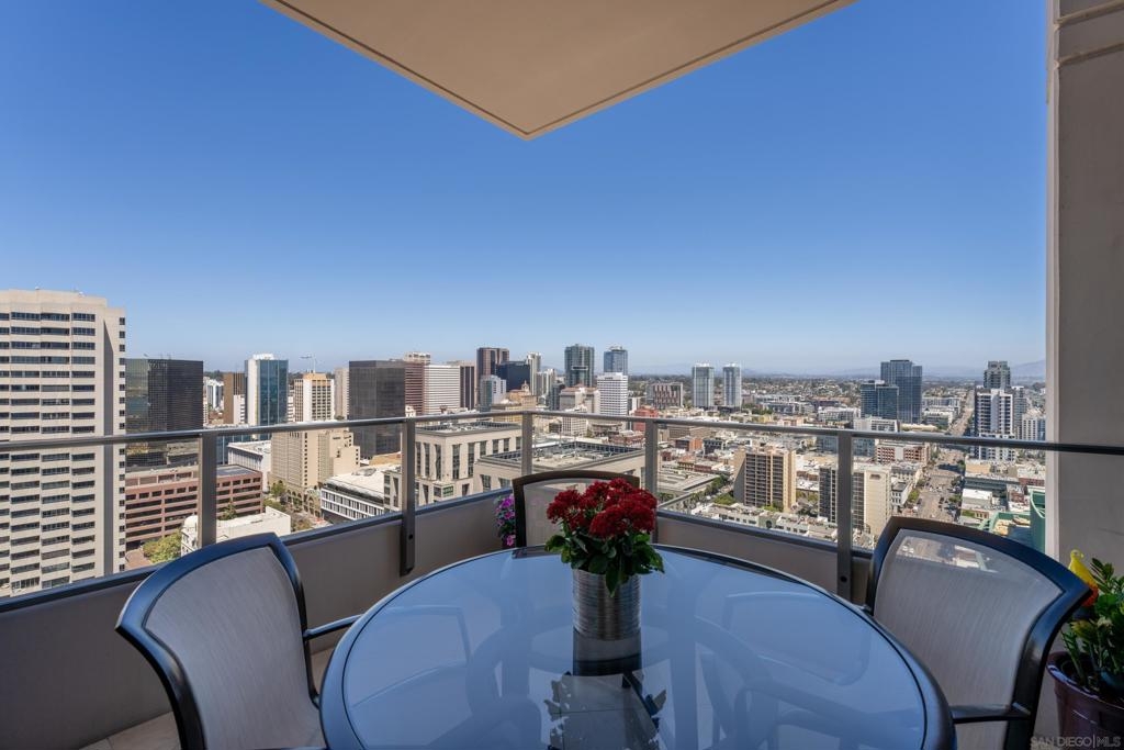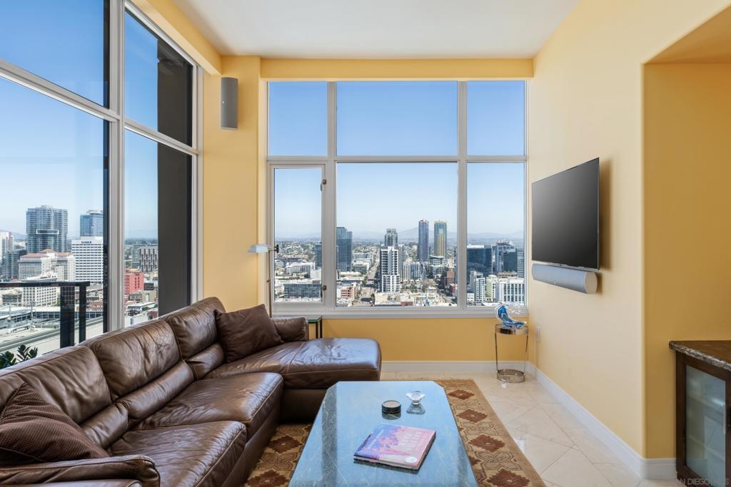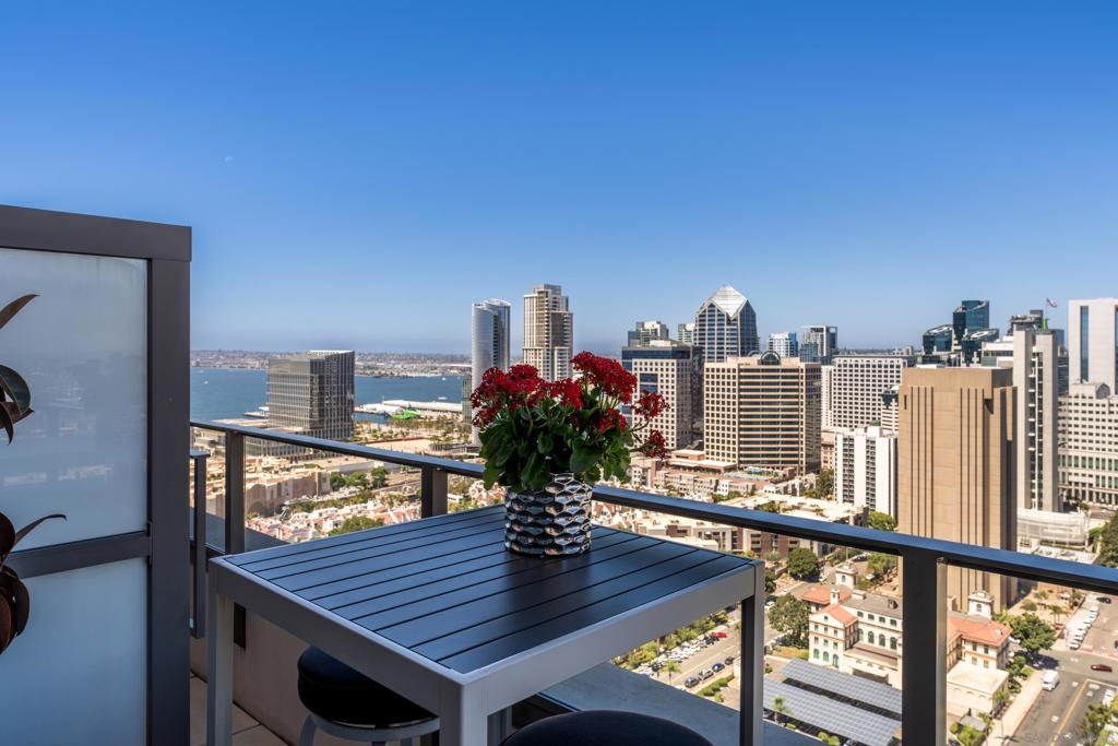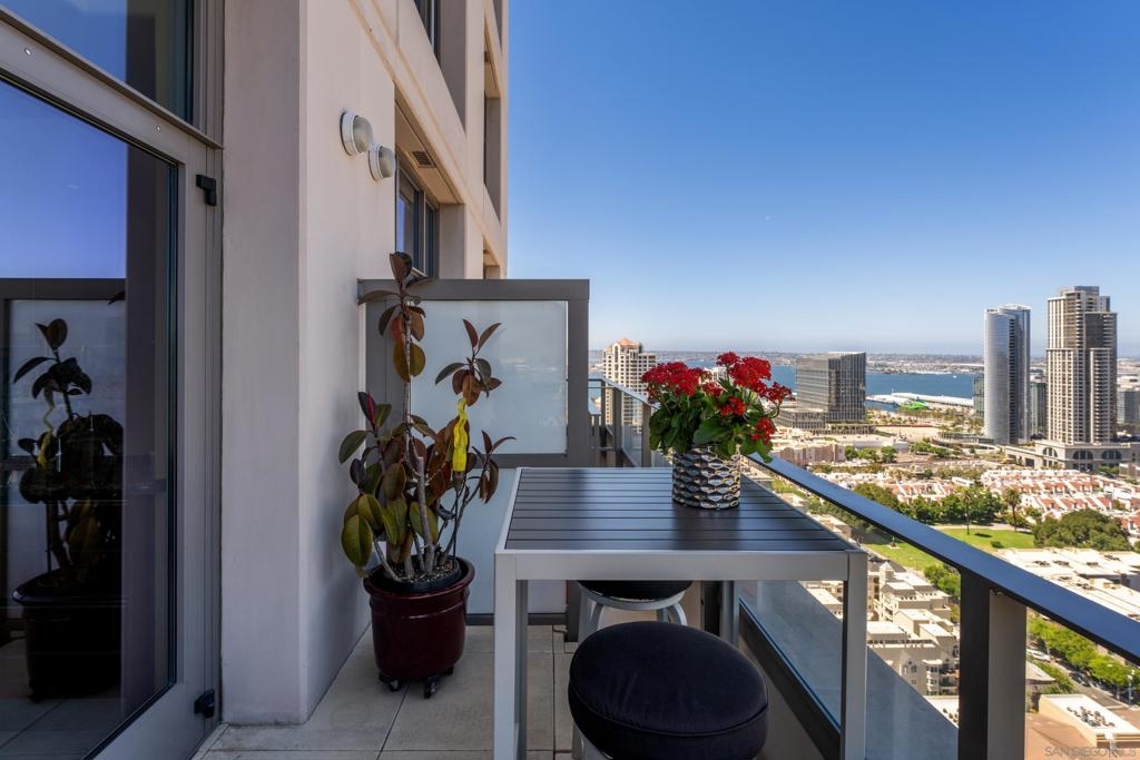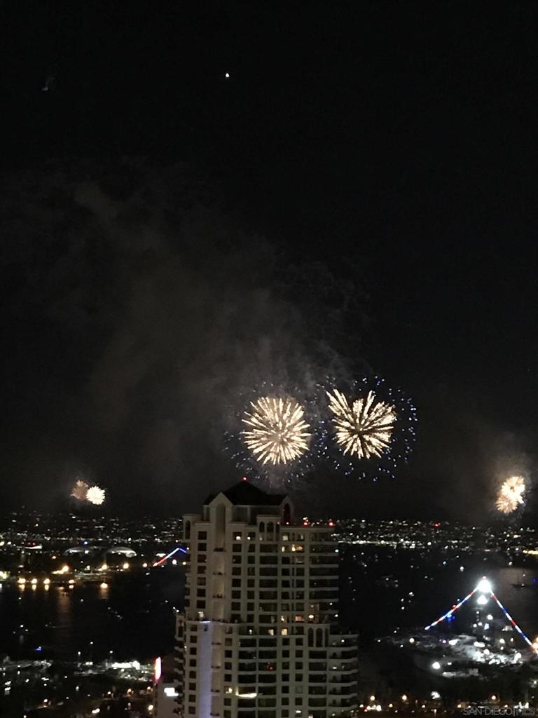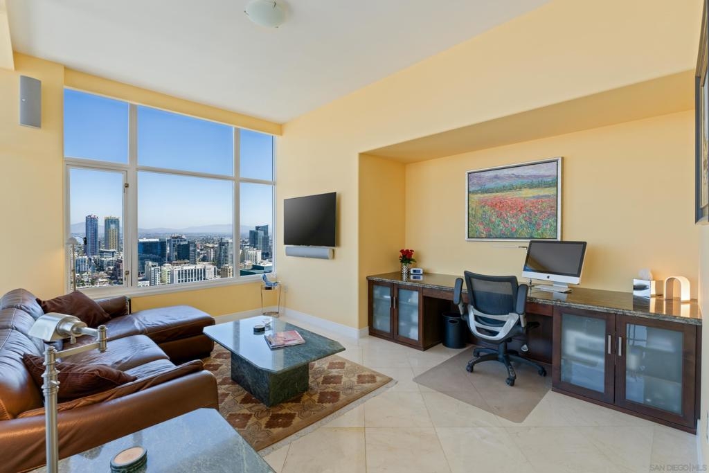 Over 300 feet above the city, this unit has incredible unobstructed 270-degree views from North San Diego Bay across the Downtown skyline to South Bay and even Mexico. Redesigned floor plan offers 10 Ft ceilings, THREE outdoor areas, 2 Bedrooms plus large office/den w/custom desk/AV area, 2 Baths, & 2 deeded parking spaces and storage area. Has motorized shades, artwork lighting, custom closets w/backing, audio speakers throughout and many more upgrades. Only 2 other units on the floor. One of the best locations and luxury bldgs. DT. SD living at it's finest! Pictures don't do it justice- must see in person!