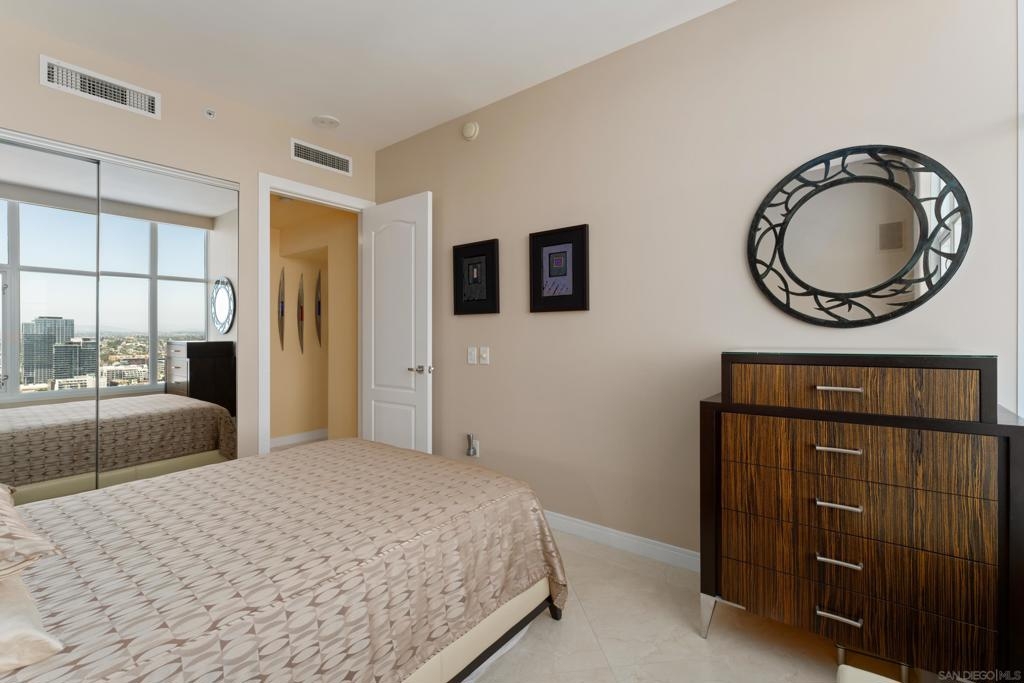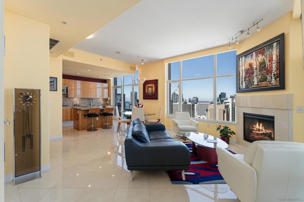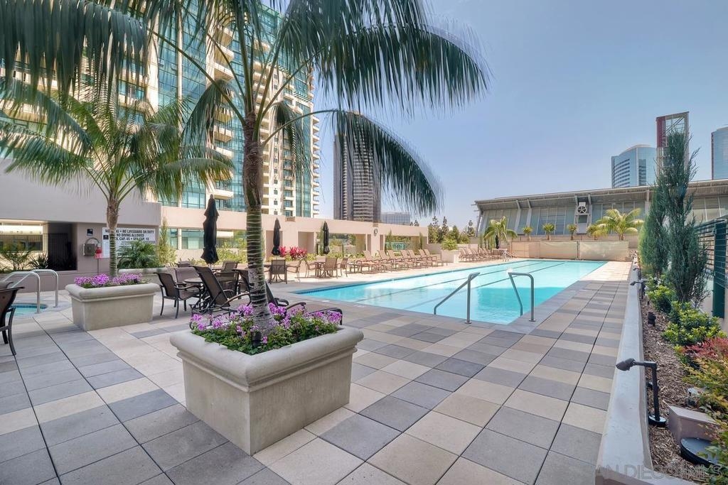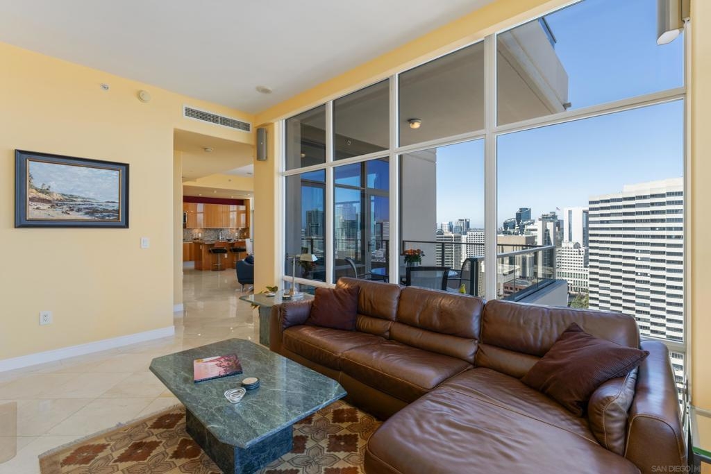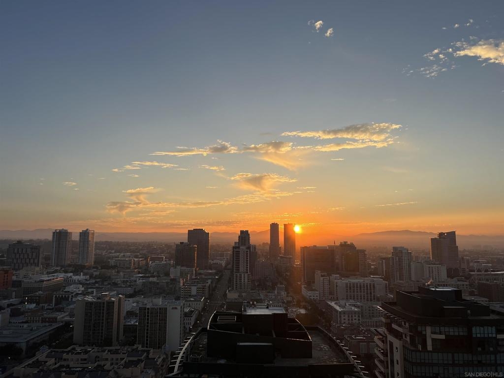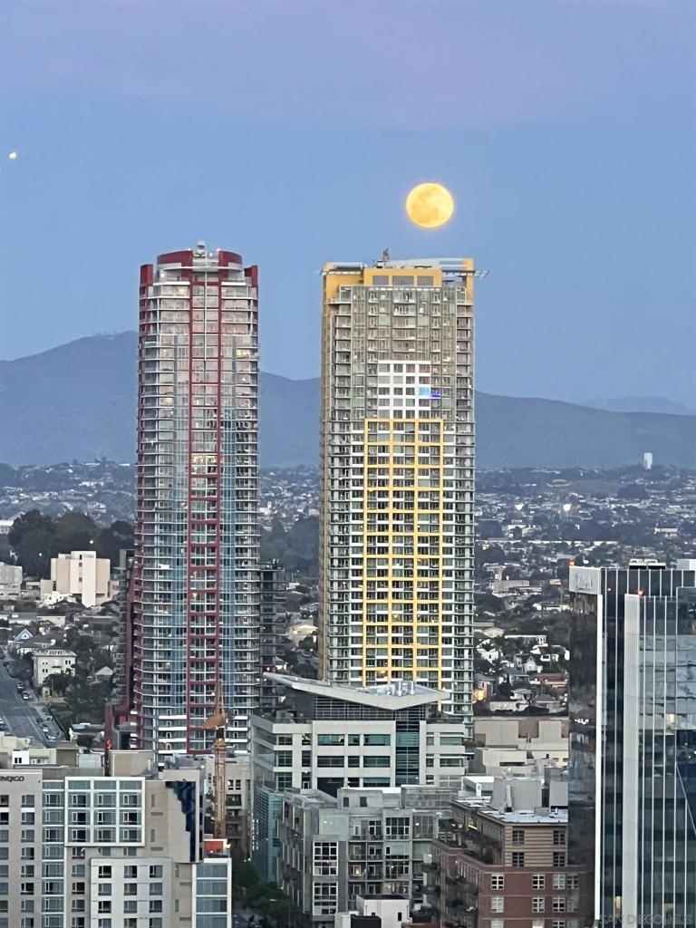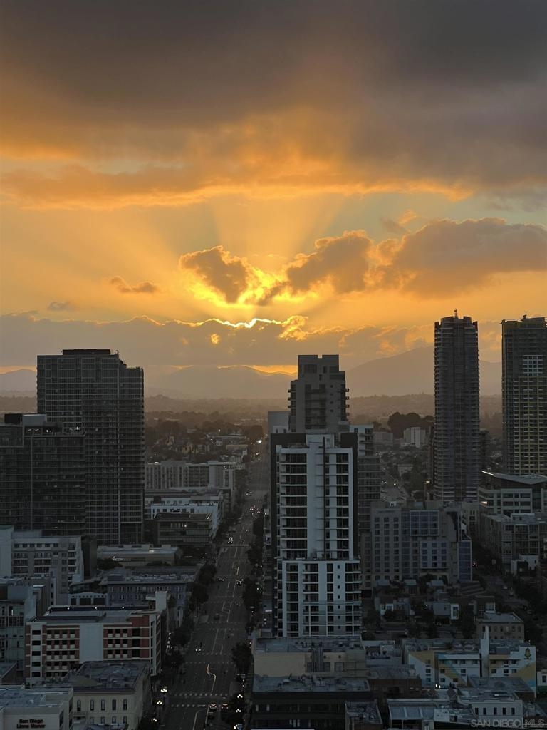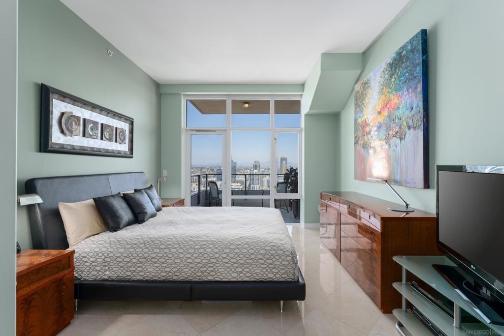 Over 300 feet above the city, this unit has incredible unobstructed 270-degree views from North San Diego Bay across the Downtown skyline to South Bay and even Mexico. Redesigned floor plan offers 10 Ft ceilings, THREE outdoor areas, 2 Bedrooms plus large office/den w/custom desk/AV area, 2 Baths, & 2 deeded parking spaces and storage area. Has motorized shades, artwork lighting, custom closets w/backing, audio speakers throughout and many more upgrades. Only 2 other units on the floor. One of the best locations and luxury bldgs. DT. SD living at it's finest! Pictures don't do it justice- must see in person!