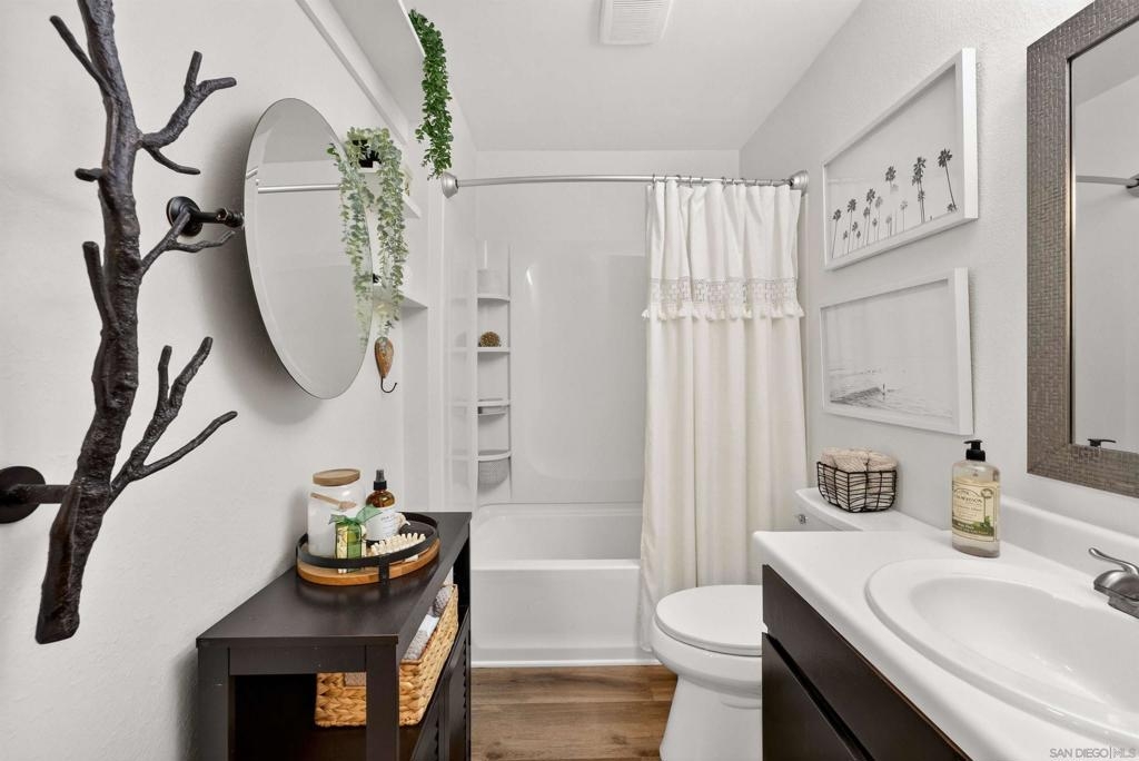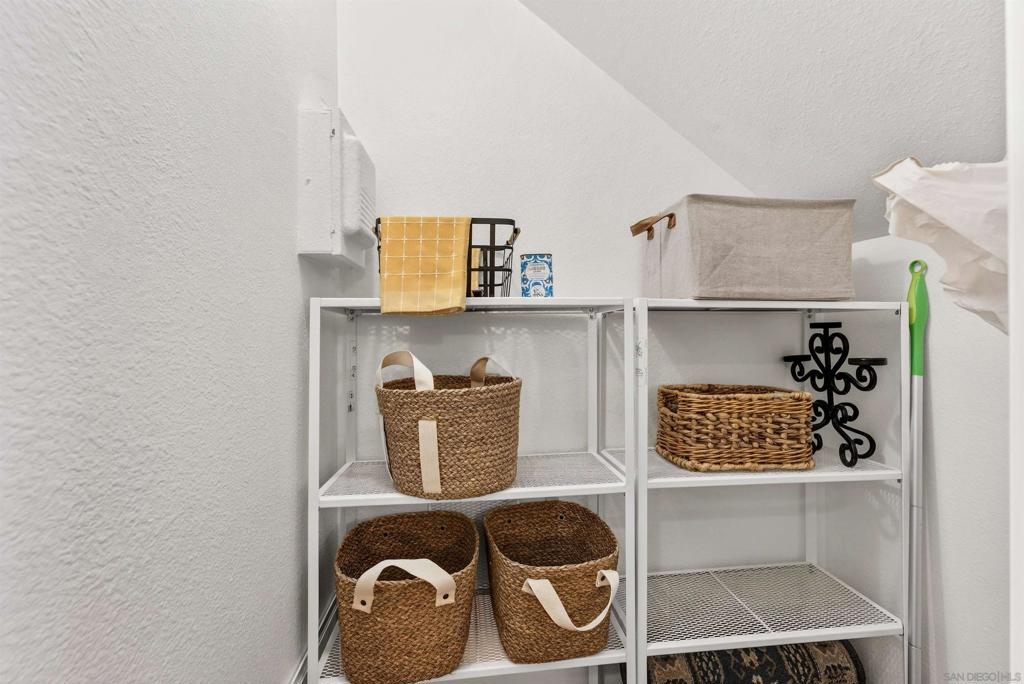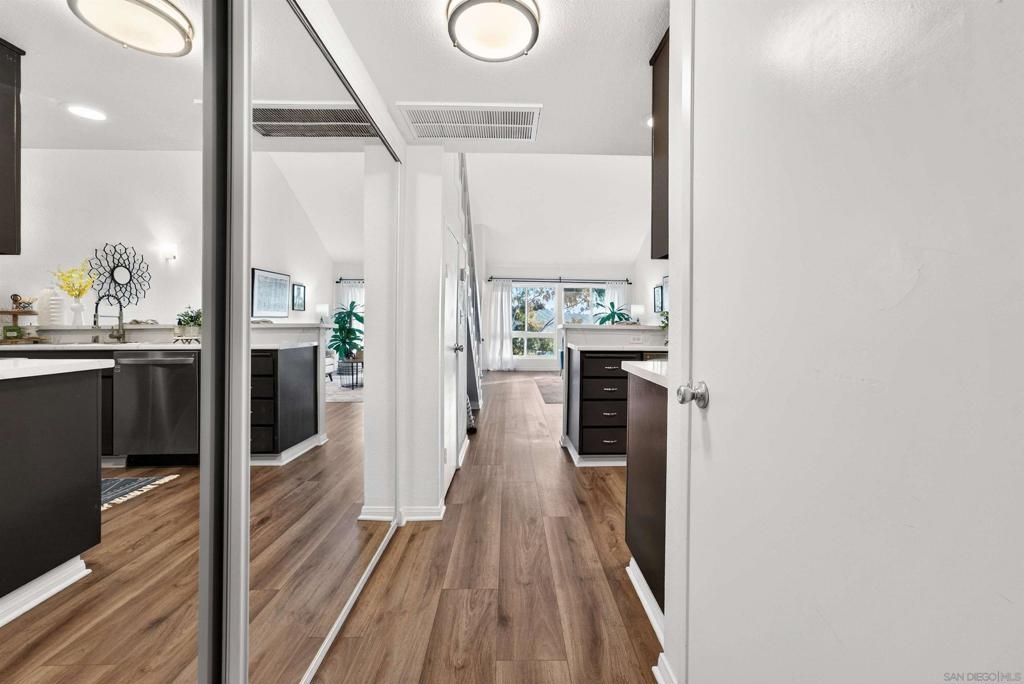 Top-floor loft-style condo with soaring vaulted ceilings and expansive valley & sunset views through newer oversized windows that fill the home with natural light. Open loft design creates a bright, airy feel. Turnkey with fresh designer paint, updated flooring, newer appliances, and quality fixtures. Loft features new double-door mirrored closets, plus an oversized mirrored closet downstairs and walk-in pantry for abundant storage. Flexible space with custom live edge wood countertop can be used as a workspace or bar. Additional features include central A/C, elevator access, and a well-maintained community with pool, spa, clubhouse, and laundry facilities. One assigned parking space. Ideally located in Mission Valley near trolley, shopping, dining, theaters, fitness centers, beaches, and major freeways. Furnishings negotiable—ideal for first-time buyers, investors, or those seeking central San Diego living. Top-floor loft-style condo with soaring vaulted ceilings, no neighbors above, and expansive valley & sunset views through newer oversized windows that flood the home with natural light. The open design creates a light-filled, airy environment that elevates the sense of space. Turnkey & recently refreshed with fresh designer interior paint, updated flooring, newer appliances, & quality fixtures. The home features new double-door mirrored closets, complemented by an oversized mirrored closet downstairs & a walk-in pantry—offering abundant & well-designed storage throughout. A versatile flex space with a custom live edge wood countertop can be configured as a workspace with existing dual monitor brackets, or reimagined as a dry bar or additional space. Additional upgrades include a Ring doorbell and keyless entry lock for added convenience and security. Enjoy central A/C, elevator access, and a well-maintained community with pool, spa, clubhouse, and laundry facilities, plus one assigned parking space. Ideally located in Mission Valley near major freeways, shopping, dining, theaters, fitness centers, beaches, and the Trolley. Turnkey opportunity with furnishings negotiable—well suited for first-time buyers or investors seeking central San Diego living.