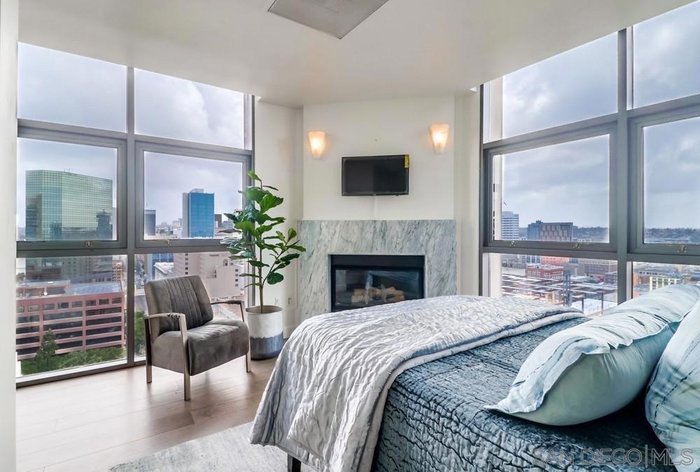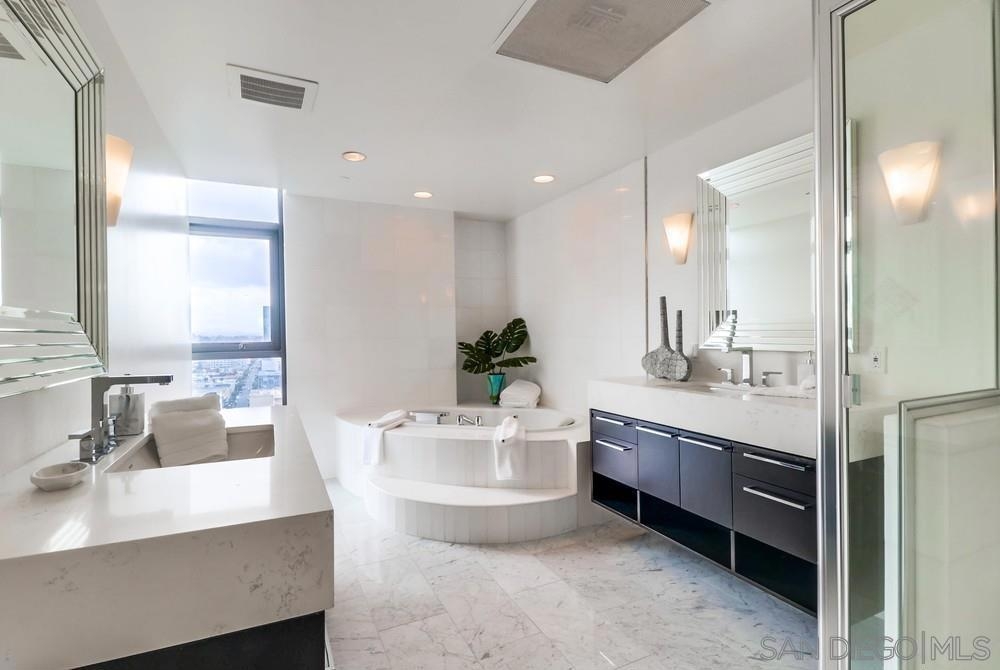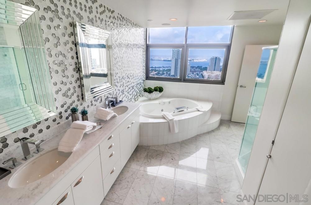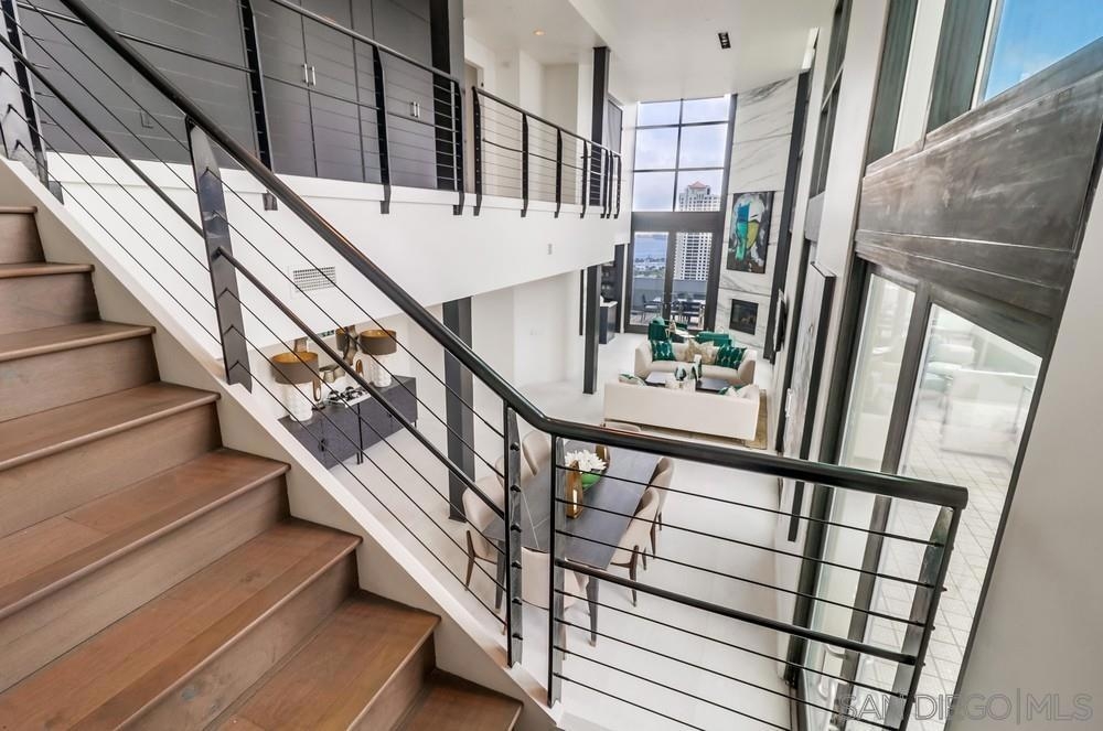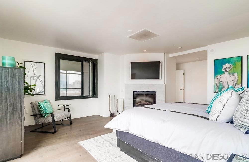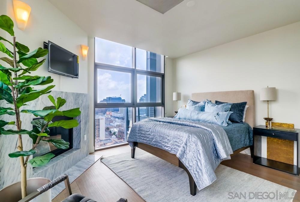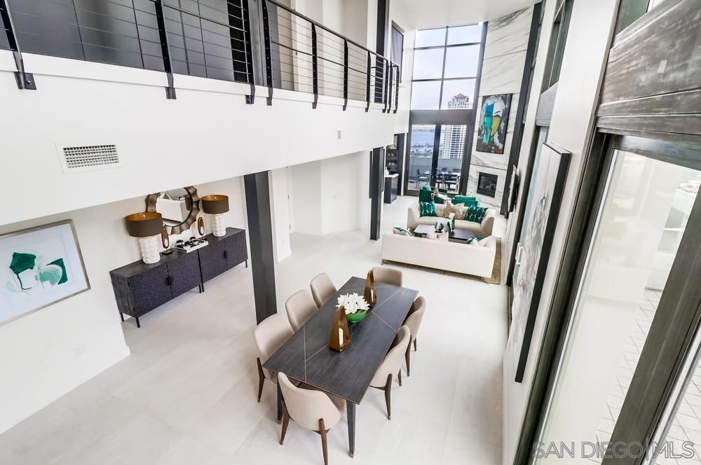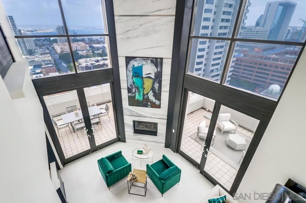 Crowning the Renaissance tower in the Marina District, this two level penthouse delivers sky-high luxury with 4 bedrooms, 6 baths and approximately 4,391 square feet of designer remodeled and furnished interiors. Wide plank hardwood, 18 by 36 porcelain tile, custom cabinetry, curated lighting and premium fixtures set a refined tone throughout. The dramatic living and dining great room rises to 20 foot window walls and showcases a marble clad fireplace, while sliding glass doors open to a spectacular wraparound terrace of more than 1,400 square feet that frames unobstructed views over San Diego Bay, the Pacific, Point Loma, Coronado and the city skyline. The gourmet kitchen offers professional appliances, slab stone counters, a breakfast nook and space for a full wine refrigerator, and an adjacent entertainment lounge features a full bar. A guest suite with fireplace and ensuite bath plus a private office sit on the main level. Upstairs, the primary retreat enjoys its own fireplace, boutique closet, dual vanities, sauna, oversized jetted tub and glass shower, while a loft style guest suite provides a sitting room, fireplace and spa bath with steam shower. Residence includes two side by side parking spaces and a storage room. Renaissance amenities encompass a twenty four hour concierge, pool and spa, fitness center and barbecue courtyard, all moments from Seaport Village, the Gaslamp Quarter and Petco Park. This is true penthouse living with no neighbors above and nothing comparable downtown.