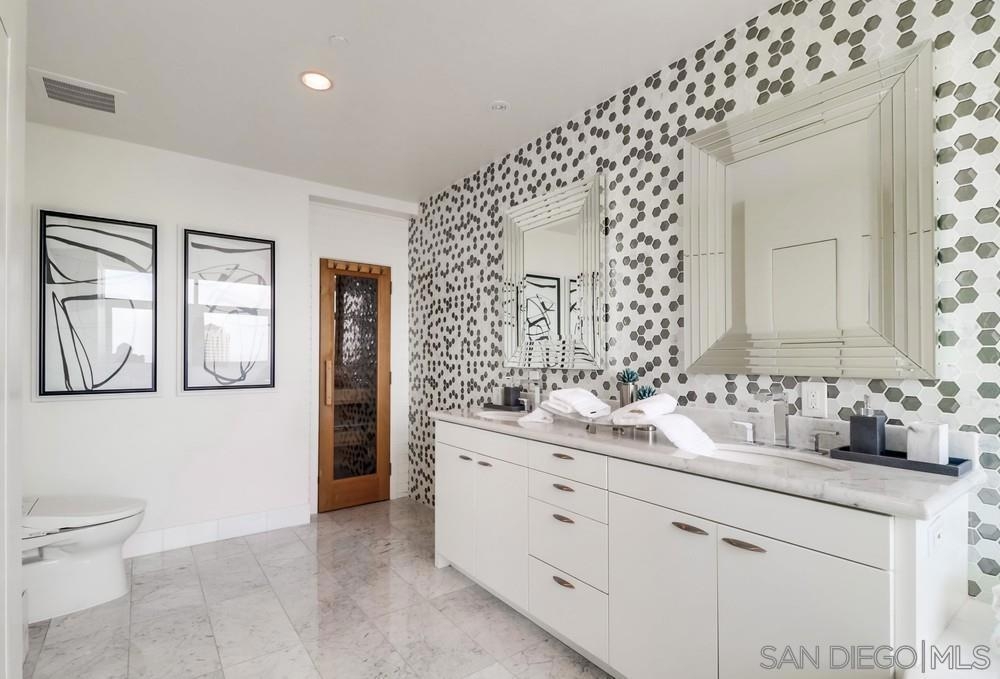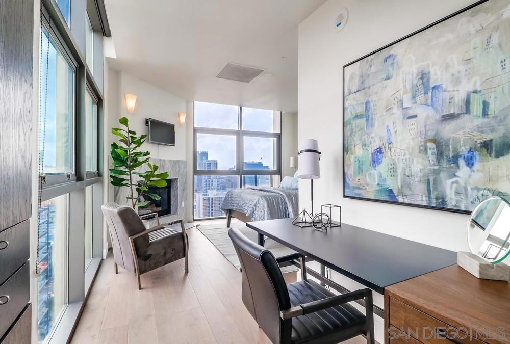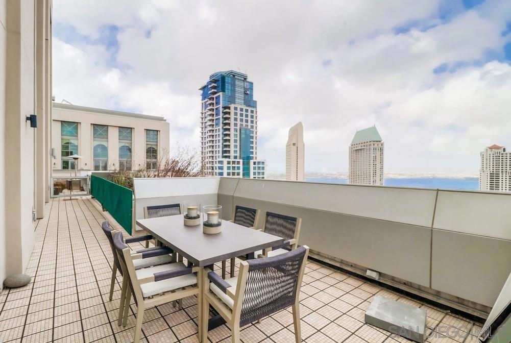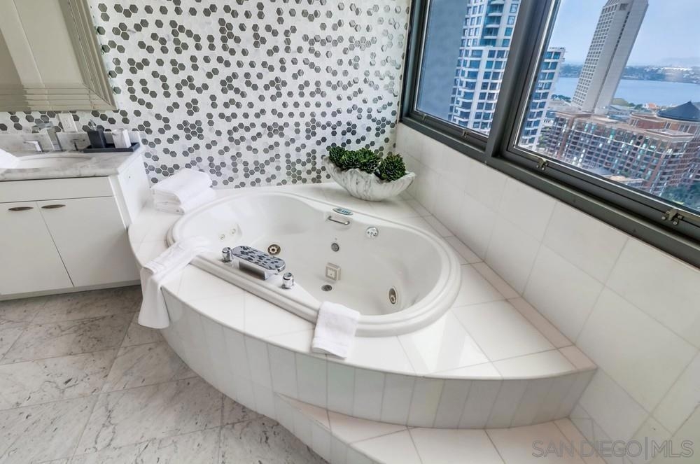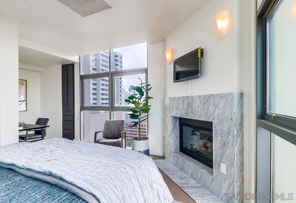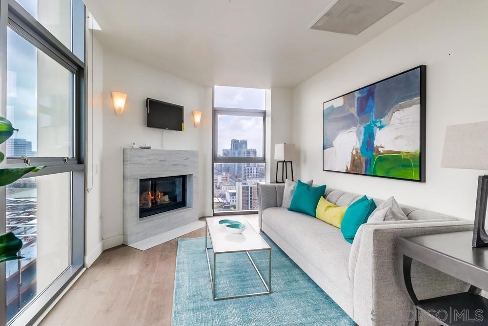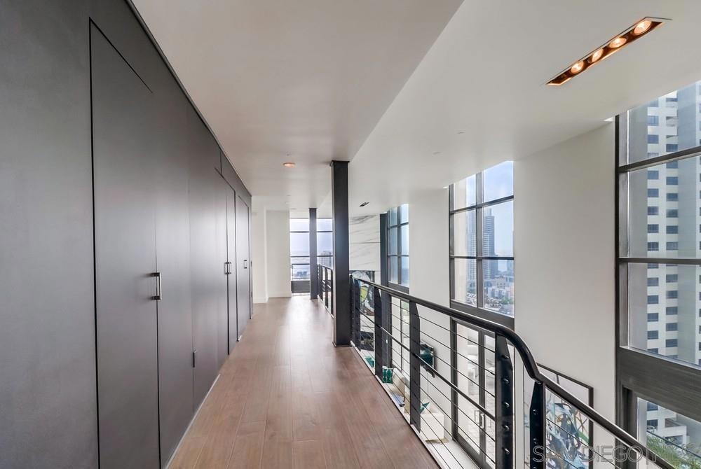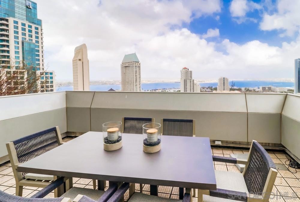 Crowning the Renaissance tower in the Marina District, this two level penthouse delivers sky-high luxury with 4 bedrooms, 6 baths and approximately 4,391 square feet of designer remodeled and furnished interiors. Wide plank hardwood, 18 by 36 porcelain tile, custom cabinetry, curated lighting and premium fixtures set a refined tone throughout. The dramatic living and dining great room rises to 20 foot window walls and showcases a marble clad fireplace, while sliding glass doors open to a spectacular wraparound terrace of more than 1,400 square feet that frames unobstructed views over San Diego Bay, the Pacific, Point Loma, Coronado and the city skyline. The gourmet kitchen offers professional appliances, slab stone counters, a breakfast nook and space for a full wine refrigerator, and an adjacent entertainment lounge features a full bar. A guest suite with fireplace and ensuite bath plus a private office sit on the main level. Upstairs, the primary retreat enjoys its own fireplace, boutique closet, dual vanities, sauna, oversized jetted tub and glass shower, while a loft style guest suite provides a sitting room, fireplace and spa bath with steam shower. Residence includes two side by side parking spaces and a storage room. Renaissance amenities encompass a twenty four hour concierge, pool and spa, fitness center and barbecue courtyard, all moments from Seaport Village, the Gaslamp Quarter and Petco Park. This is true penthouse living with no neighbors above and nothing comparable downtown.