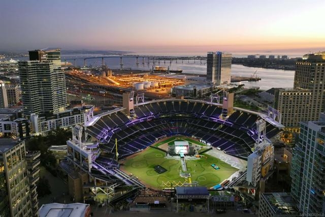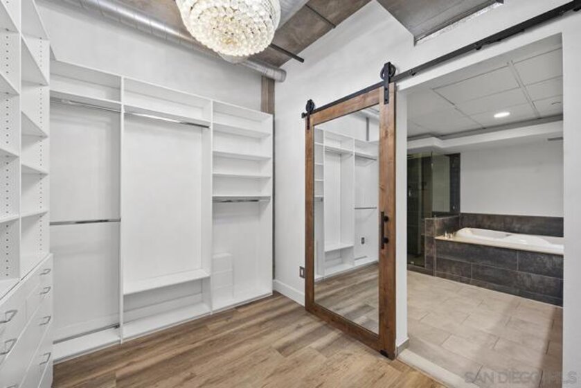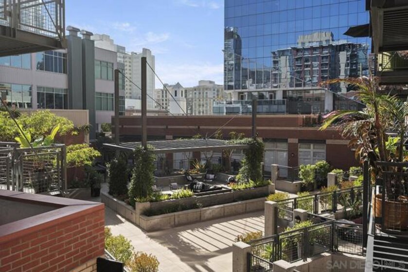 Step into this stunning, fully reimagined 1 bedroom + den Parkloft residence where urban sophistication meets modern comfort. This light-filled New York–style loft showcases soaring 10-foot ceilings, newly added walls, and over $25K in custom Rustica glass and metal doors that define the space with style and function. The versatile den offers options for a guest room, home office, or creative retreat, while the open-concept living area perfectly balances industrial charm with modern warmth. The chef-inspired kitchen boasts dramatic quartz waterfall counters, full backsplash, high-end Samsung and Subzero appliances, and designer lighting that enhances every gathering. The spa-like primary bath features large-format tile, vivid lighting, dual vanities, a jetted soaking tub, and a walk-in frameless glass shower. French doors off the great room open to a private balcony—complete with a natural gas hookup—ideal for entertaining or simply relaxing in the heart of East Village’s vibrant Ballpark District. One SUV-sized parking space and private storage room also included. Attention to detail continues throughout this residence, from the built-out primary closet with mirrored barn door to the thoughtfully redesigned guest bath with custom vertical tile and curated fixtures. Additional upgrades include newer front-load laundry, custom built-ins for storage, hard-surface flooring throughout, and designer lighting in every room. Smart-home features such as a Nest thermostat and LED accent lighting provide added convenience and energy efficiency. Parkloft offers an exceptional urban lifestyle with an attended Zen-inspired lobby, state-of-the-art fitness center, beautifully landscaped courtyard, and resident lounge with kitchenette—perfect for entertaining. Just steps from Petco Park, the Gaslamp Quarter, and the Marina District, this move-in-ready home blends privacy and sophistication with the best of downtown San Diego living.